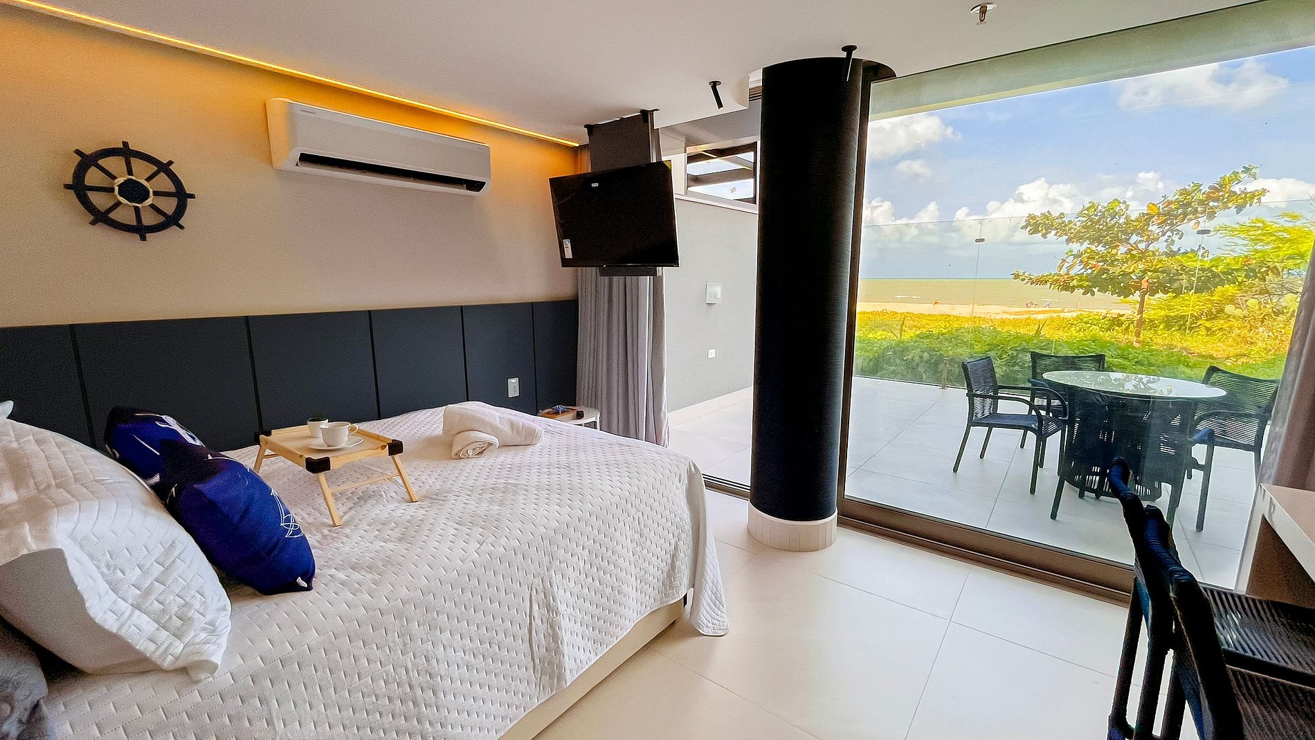 Com 28m², o apartamento acomoda até 2 pessoas em cama de casal e oferece vista para o mar. Possui cozinha compacta equipada com micro-ondas, frigobar, liquidificador, cafeteira e utensílios essenciais, além de Smart TV para seu entretenimento.