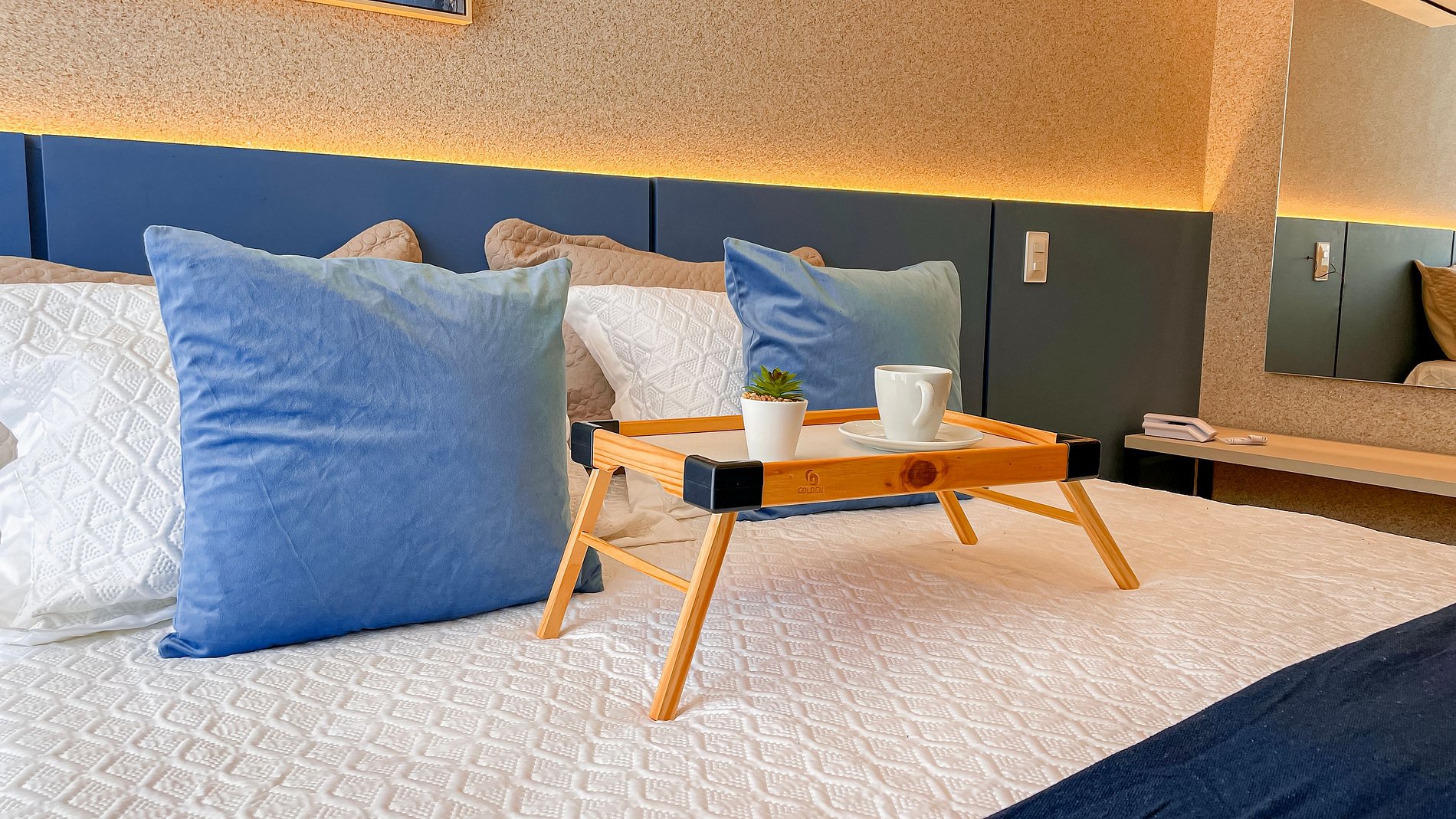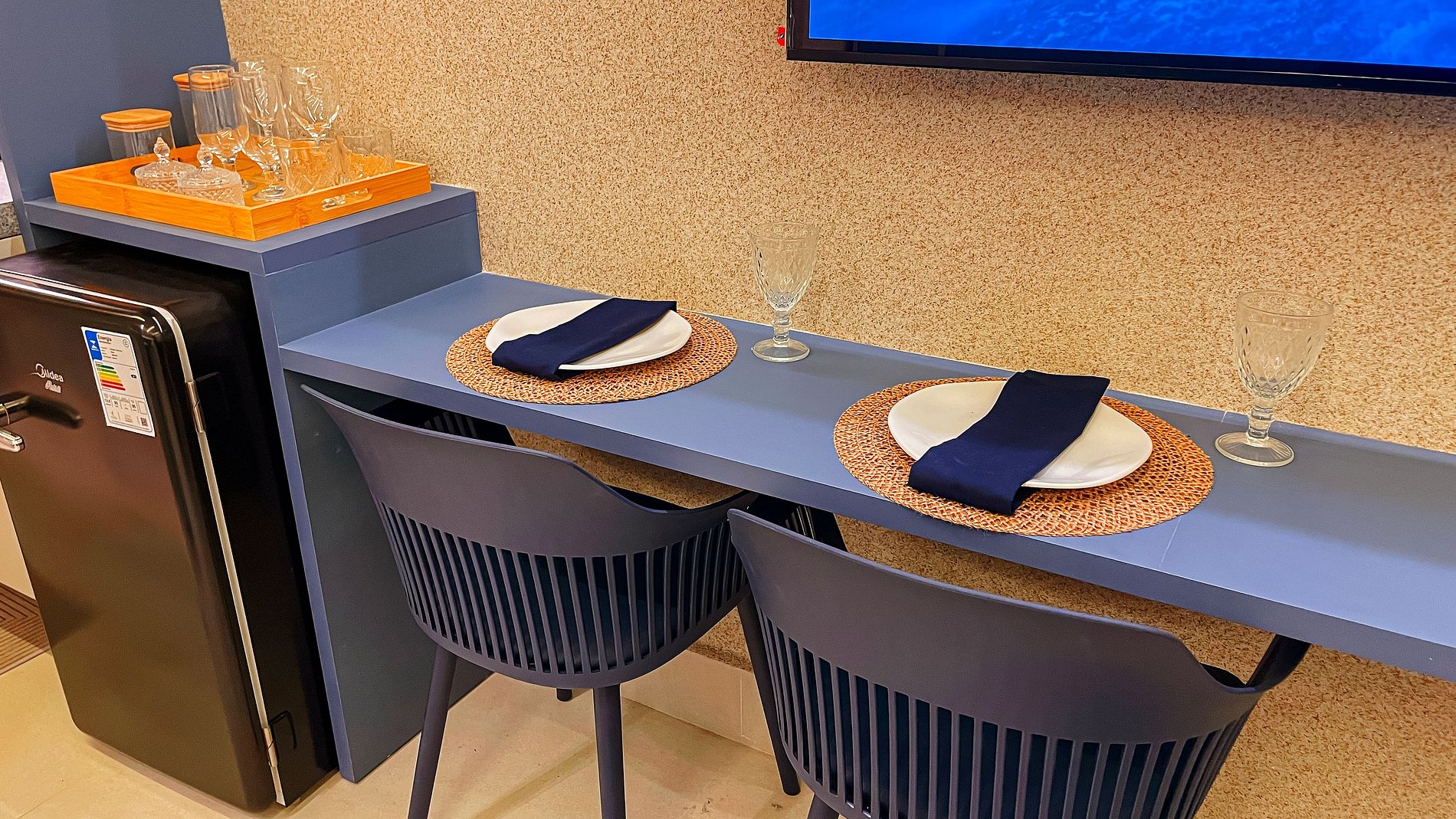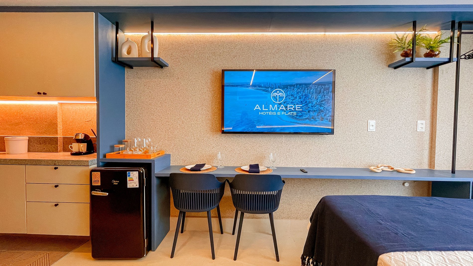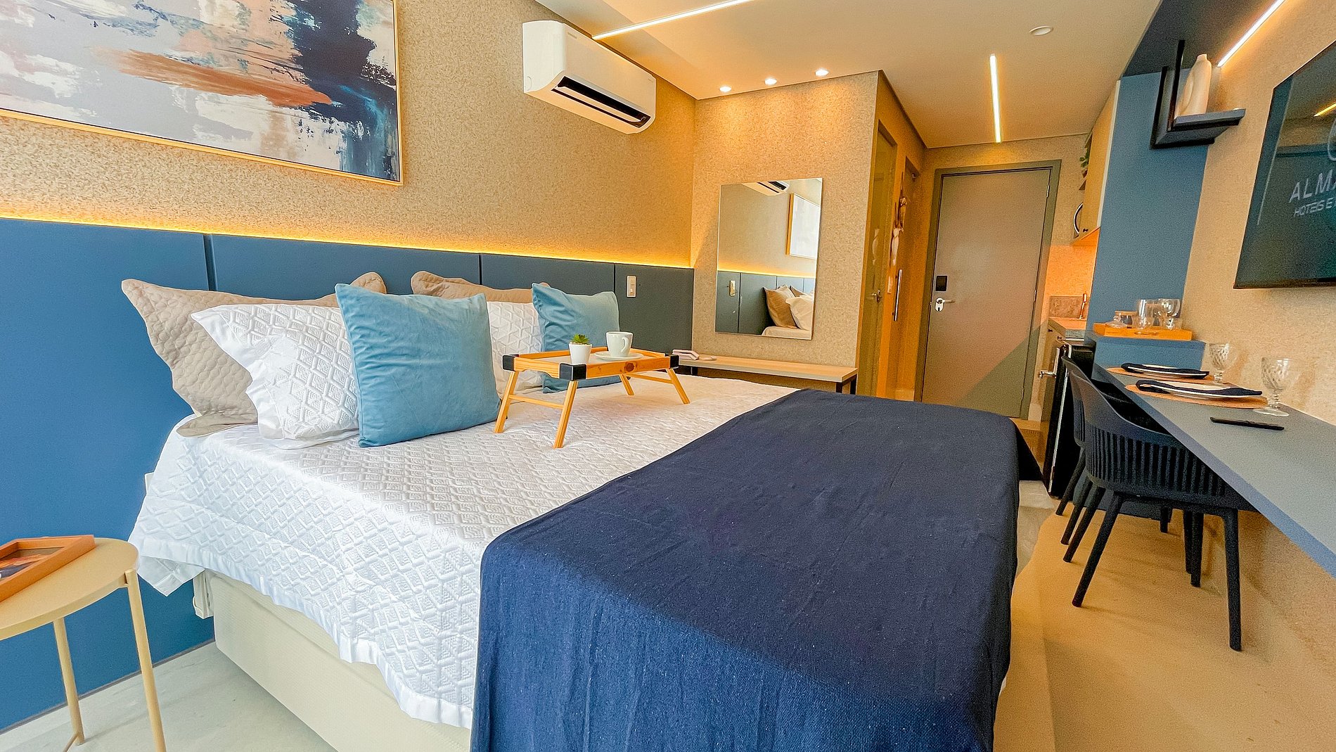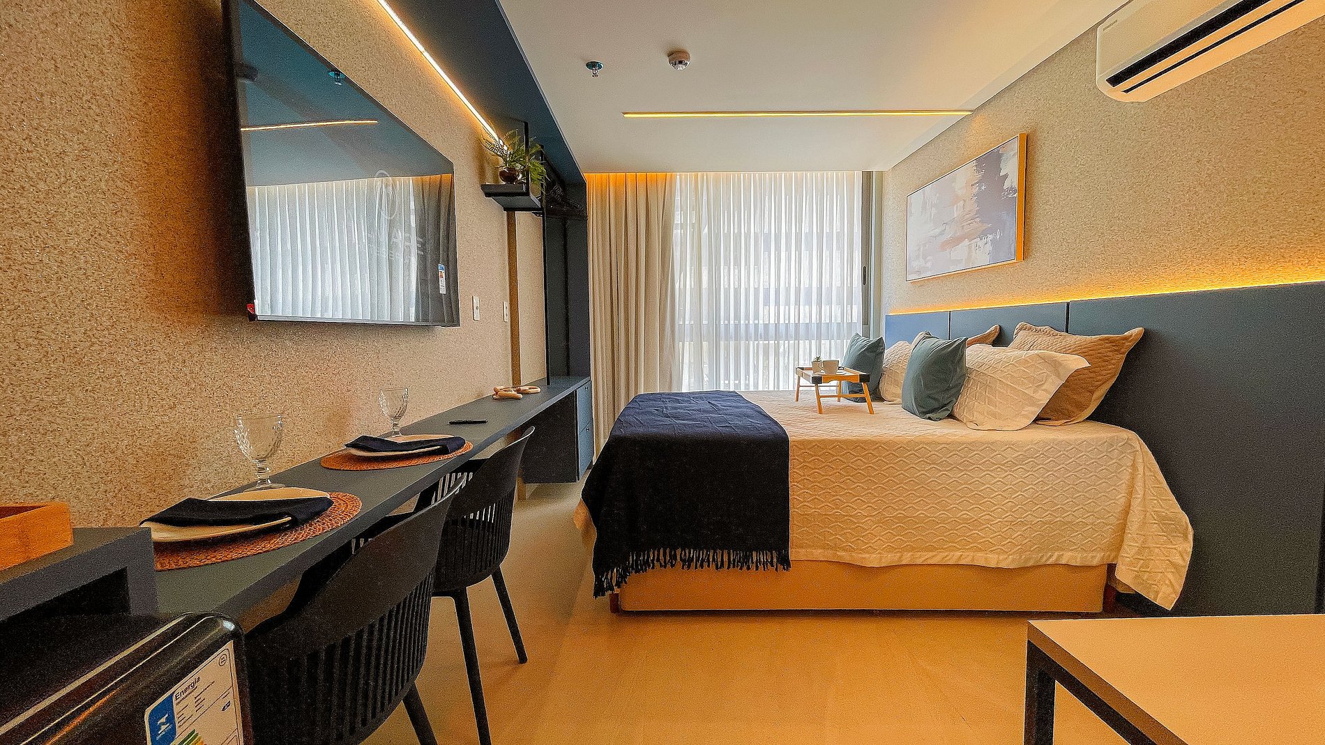 O apartamento possui uma cama queen e duas camas auxiliares solteiro que acomoda 02x adultos mais 02x crianças e oferece vista lateral para o mar. Possui cozinha compacta equipada com micro-ondas, frigobar, cafeteira e utensílios essenciais, além de Smart TV para seu entretenimento.