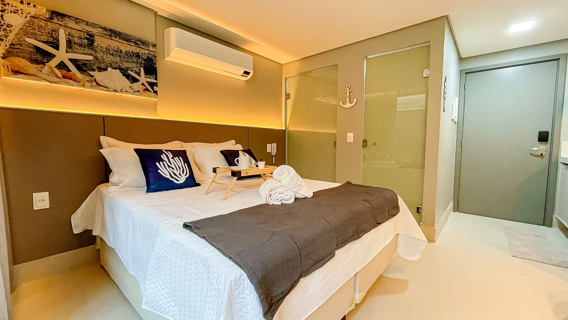 O charmoso apartamento possui um ambiente único, composto por uma cozinha compacta para pequenas refeições e o quarto com cama de casal. São 28m² super confortáveis, equipados com Smart TV e Wi-Fi gratuito. Disponibilizamos enxoval de cama, com lençóis e toalhas, além de alguns utensílios domésticos para preparar pequenas refeições no conforto do seu próprio espaço. Como cortesia, oferecemos alguns amenities.