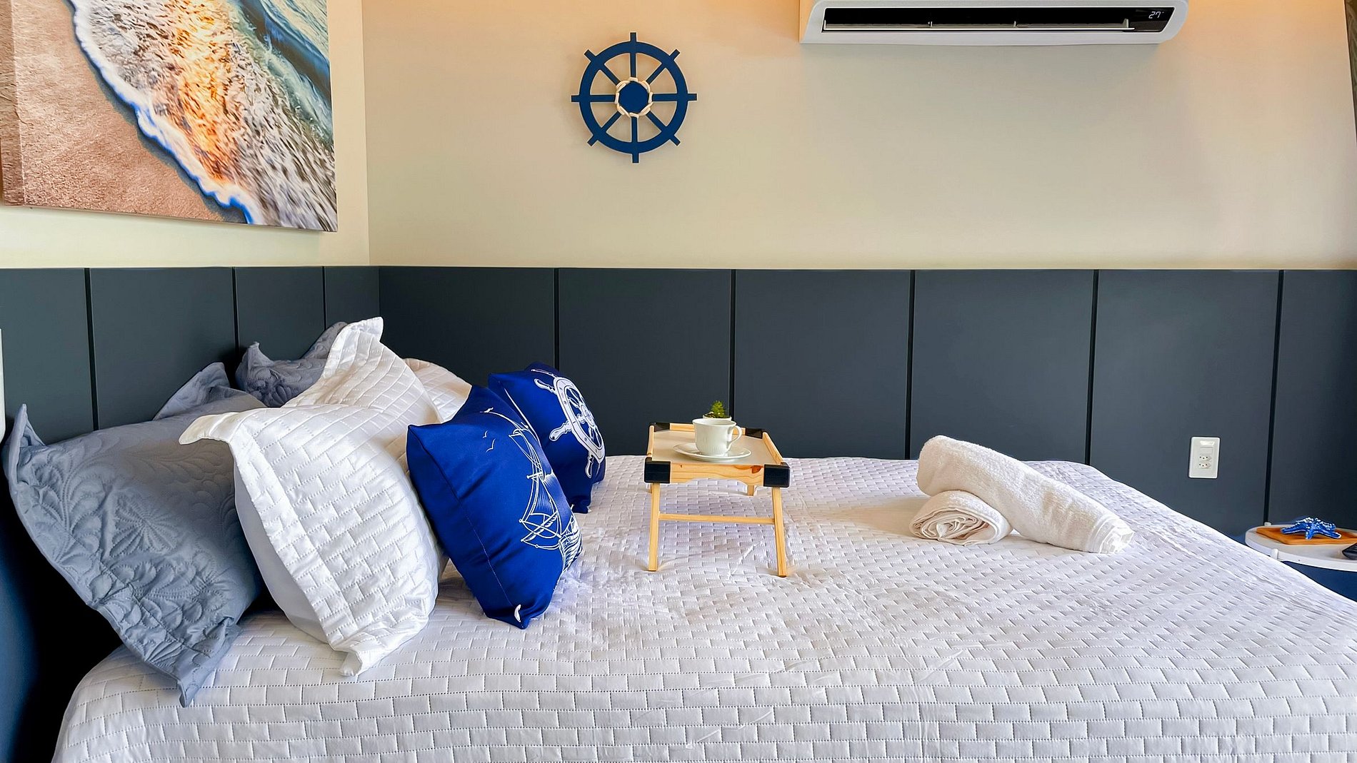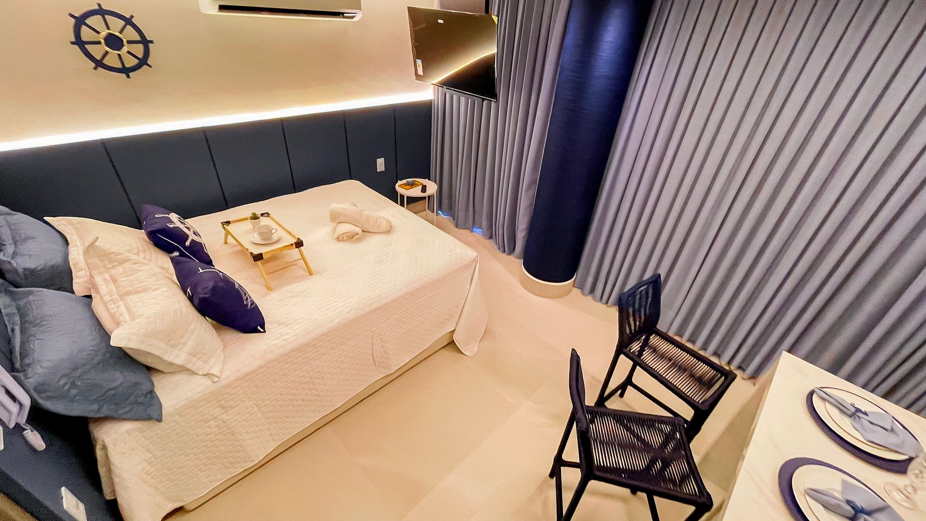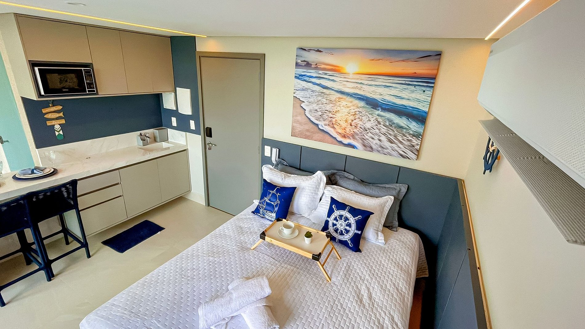 Com 28m², o apartamento acomoda até 2 pessoas em cama de casal e oferece vista para o mar. Possui cozinha compacta equipada com micro-ondas, frigobar, liquidificador, cafeteira e utensílios essenciais, além de Smart TV para seu entretenimento.