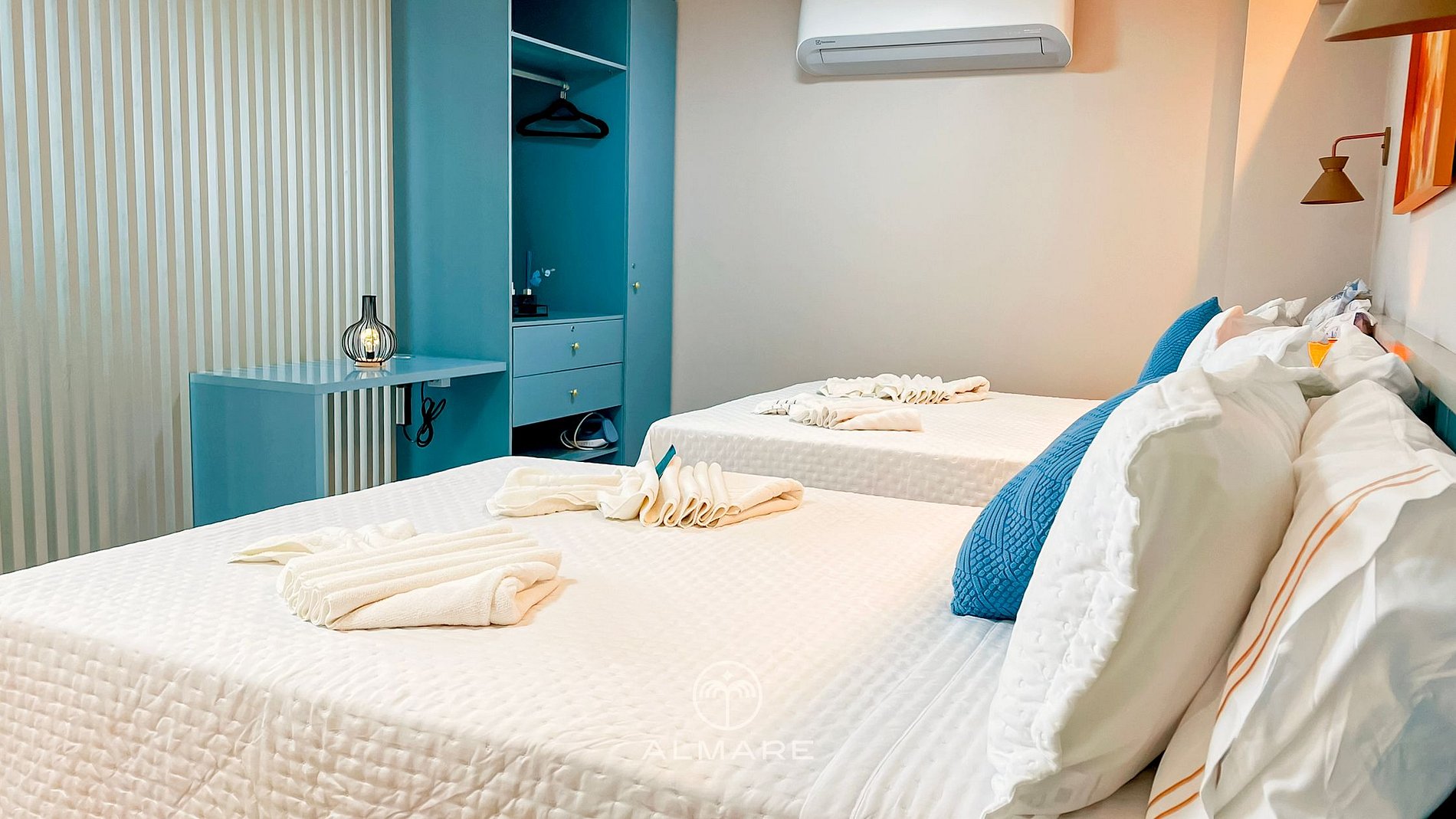 Este lindo e confortável flat tem um ambiente único e é composto por uma cozinha compacta para pequenas refeições e o quarto com 02 cama casal. São 43m² bem decorados e super charmoso.Disponibilizamos enxoval de cama, com lençóis e toalhas, bem como alguns utensílios domésticos para pequenas refeições no conforto do seu espaço. Como cortesia a Almare Flats coloca alguns amenities no quarto e fornece um kit praia (cadeira/guarda-sol/cooler) mediante disponibilidade. O prédio conta ainda com uma piscina na cobertura com borda infinita e uma vista linda da Praia do Cabo Branco. O estacionamento é gratuito e seguro. A lavanderia é comum a todos os hóspedes e moradores e pode ser utilizada mediante pagamento de taxa. Caso tenha um bebê para acomodar, também é possível solicitar um berço, fornecemos conforme disponibilidade.