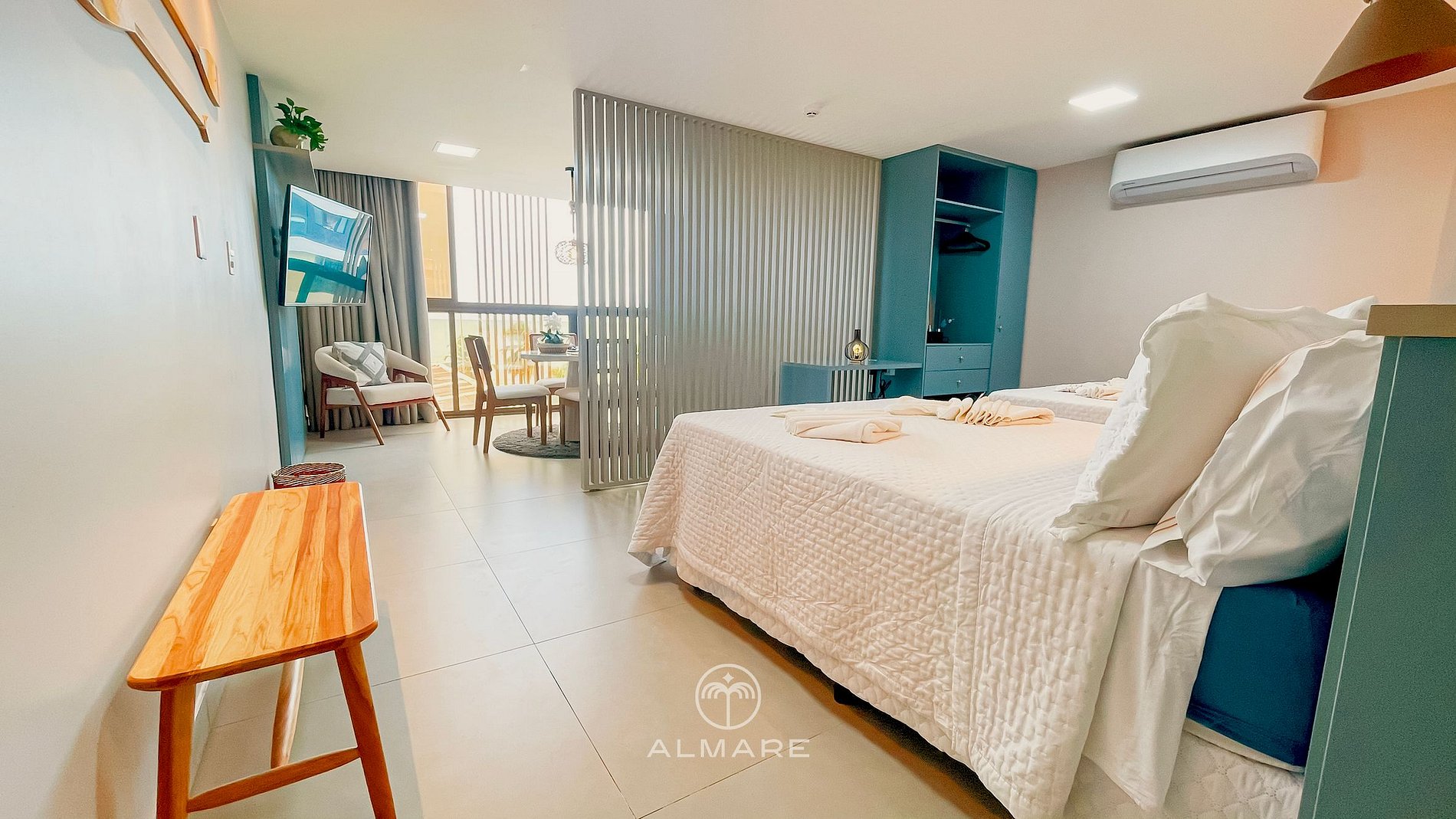 Este lindo e confortável flat tem um ambiente único e é composto por uma cozinha compacta para pequenas refeições e o quarto com 02 cama casal. São 43m² bem decorados e super charmoso.Disponibilizamos enxoval de cama, com lençóis e toalhas, bem como alguns utensílios domésticos para pequenas refeições no conforto do seu espaço. Como cortesia a Almare Flats coloca alguns amenities no quarto e fornece um kit praia (cadeira/guarda-sol/cooler) mediante disponibilidade. O prédio conta ainda com uma piscina na cobertura com borda infinita e uma vista linda da Praia do Cabo Branco. O estacionamento é gratuito e seguro. A lavanderia é comum a todos os hóspedes e moradores e pode ser utilizada mediante pagamento de taxa. Caso tenha um bebê para acomodar, também é possível solicitar um berço, fornecemos conforme disponibilidade.