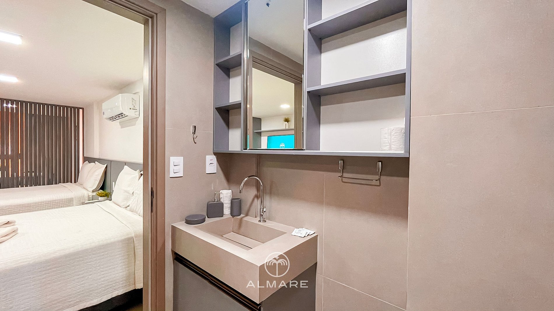O confortável flat tem um ambiente único e é composto por uma cozinha compacta para pequenas refeições e o quarto com 02 cama casal. Disponibilizamos enxoval de cama, com lençóis e toalhas, bem como alguns utensílios domésticos para pequenas refeições no conforto do seu espaço. Como cortesia a Almare Flats coloca alguns amenities no quarto e fornece um kit praia (cadeira/guarda-sol/cooler) mediante disponibilidade. O prédio conta ainda com uma piscina na cobertura com borda infinita e uma vista linda da Praia do Cabo Branco. O estacionamento é gratuito e seguro. A lavanderia é comum a todos os hóspedes e moradores e pode ser utilizada mediante pagamento de taxa. Caso tenha um bebê para acomodar, também é possível solicitar um berço, fornecemos conforme disponibilidade.