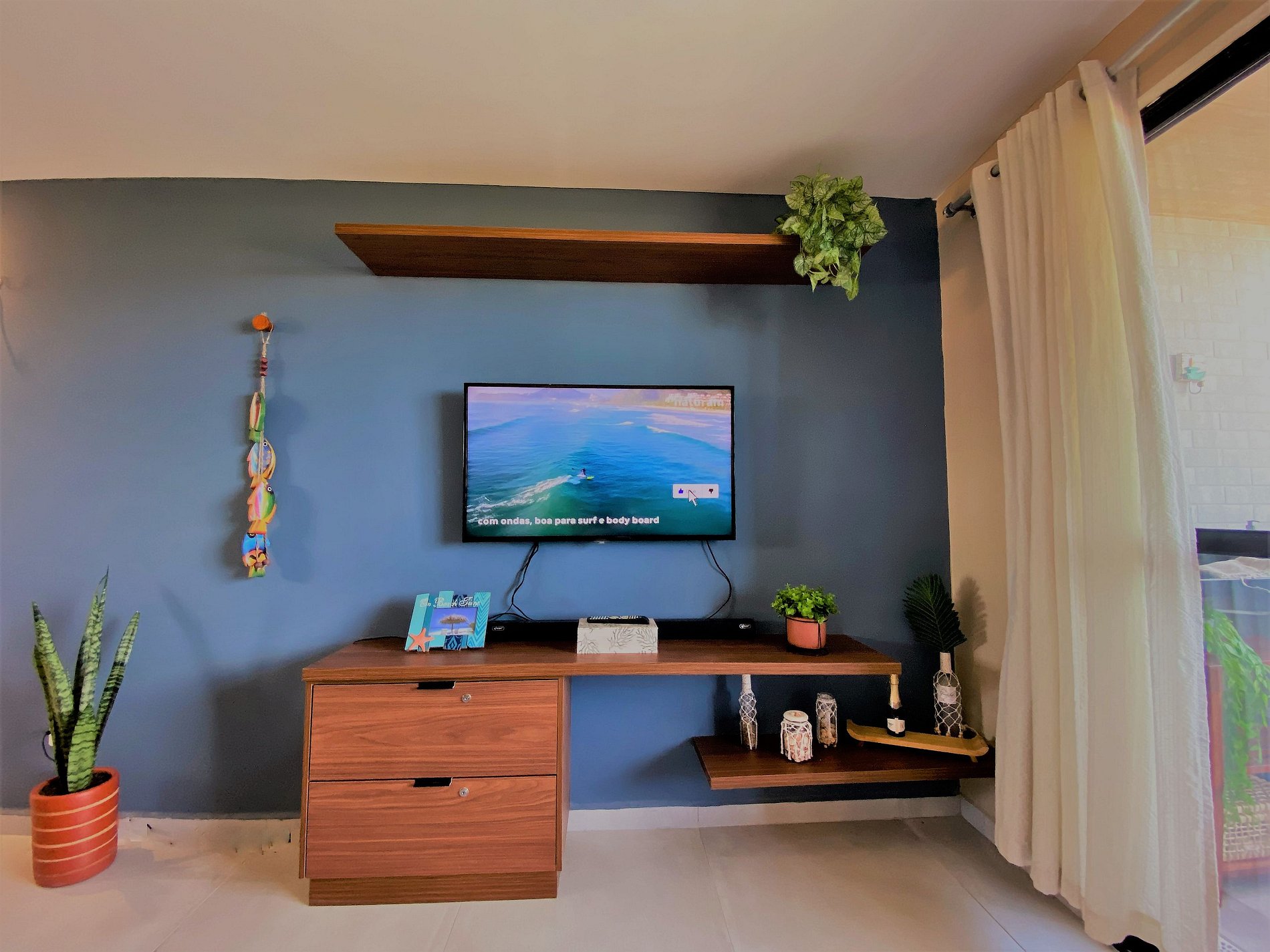 Apartamento confortável com dois quartos, sendo um deles suíte.