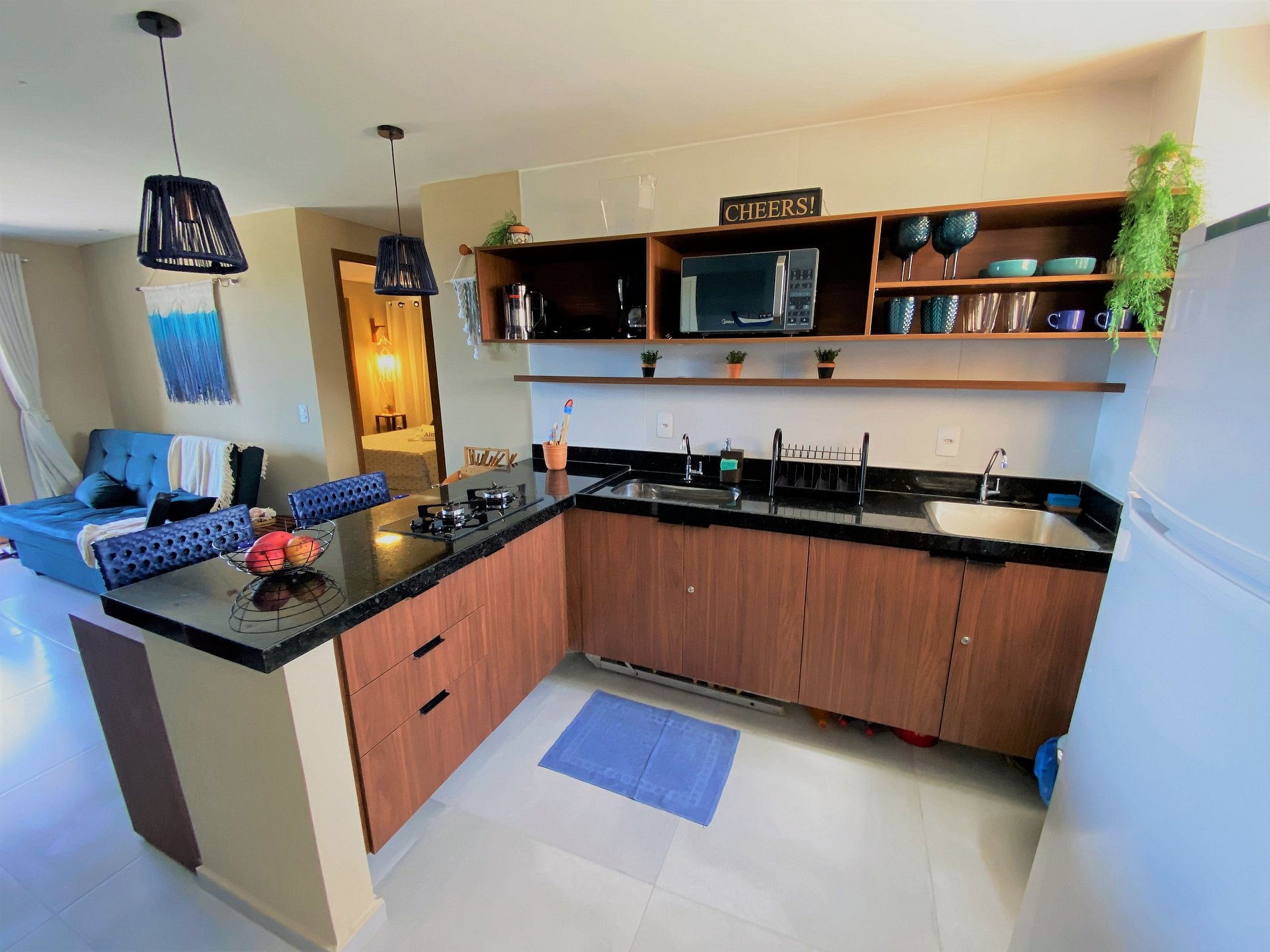 Sala com smartv, sofá e mesa de apoio integrada com a cozinha, que está equipada para hospedagem de temporada com utensílios e eletros.