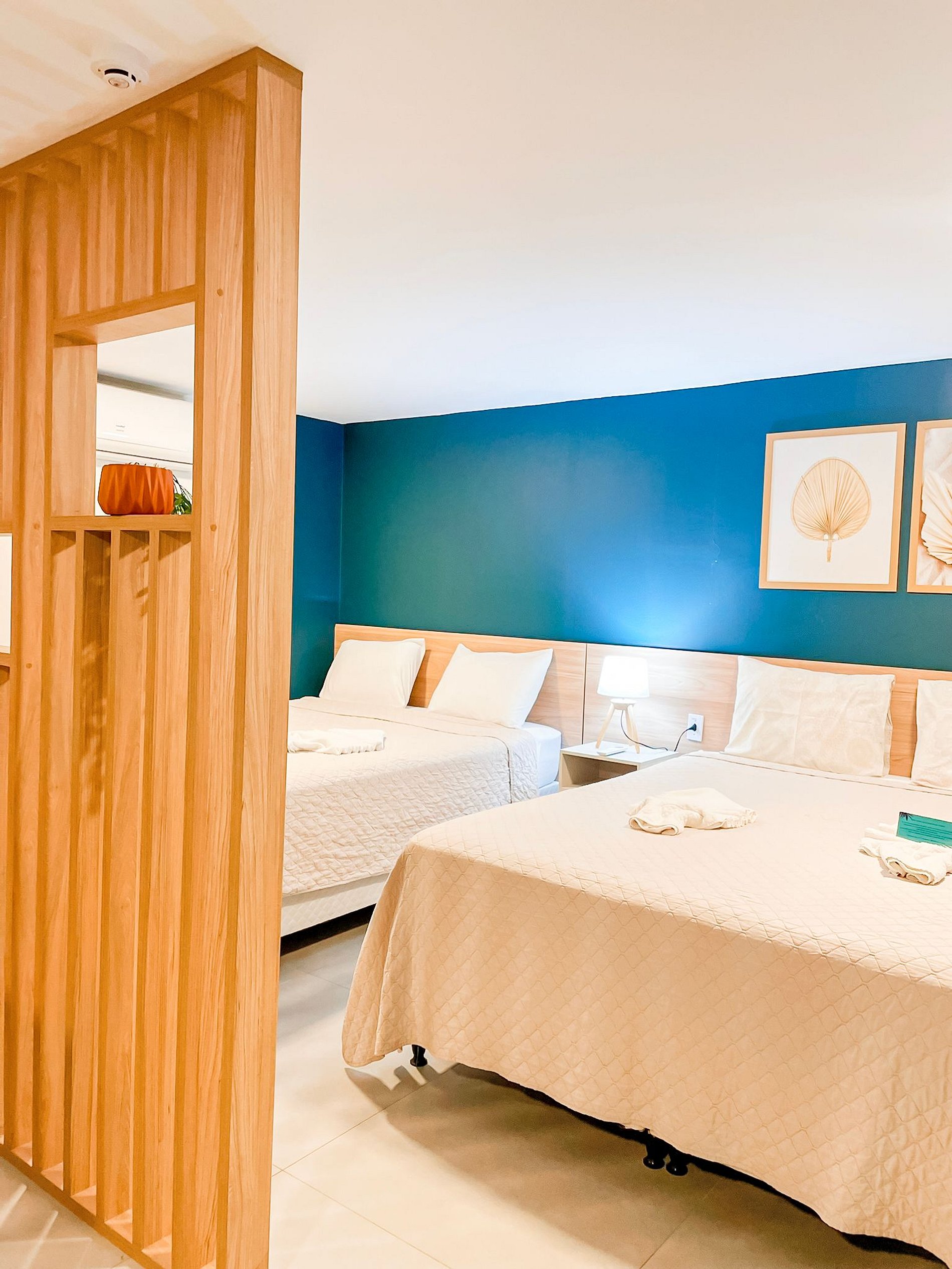 O charmoso flat tem um ambiente único, super bem decorado, com cozinha, mesa e cadeiras e alguns utensílios domésticos para pequenas refeições no conforto do seu próprio espaço. O apartamento disponibiliza duas camas de casal e um sofá cama para acomodar até 05 adultos. São 43m², um bom espaço e muito conforto para longas estadas.