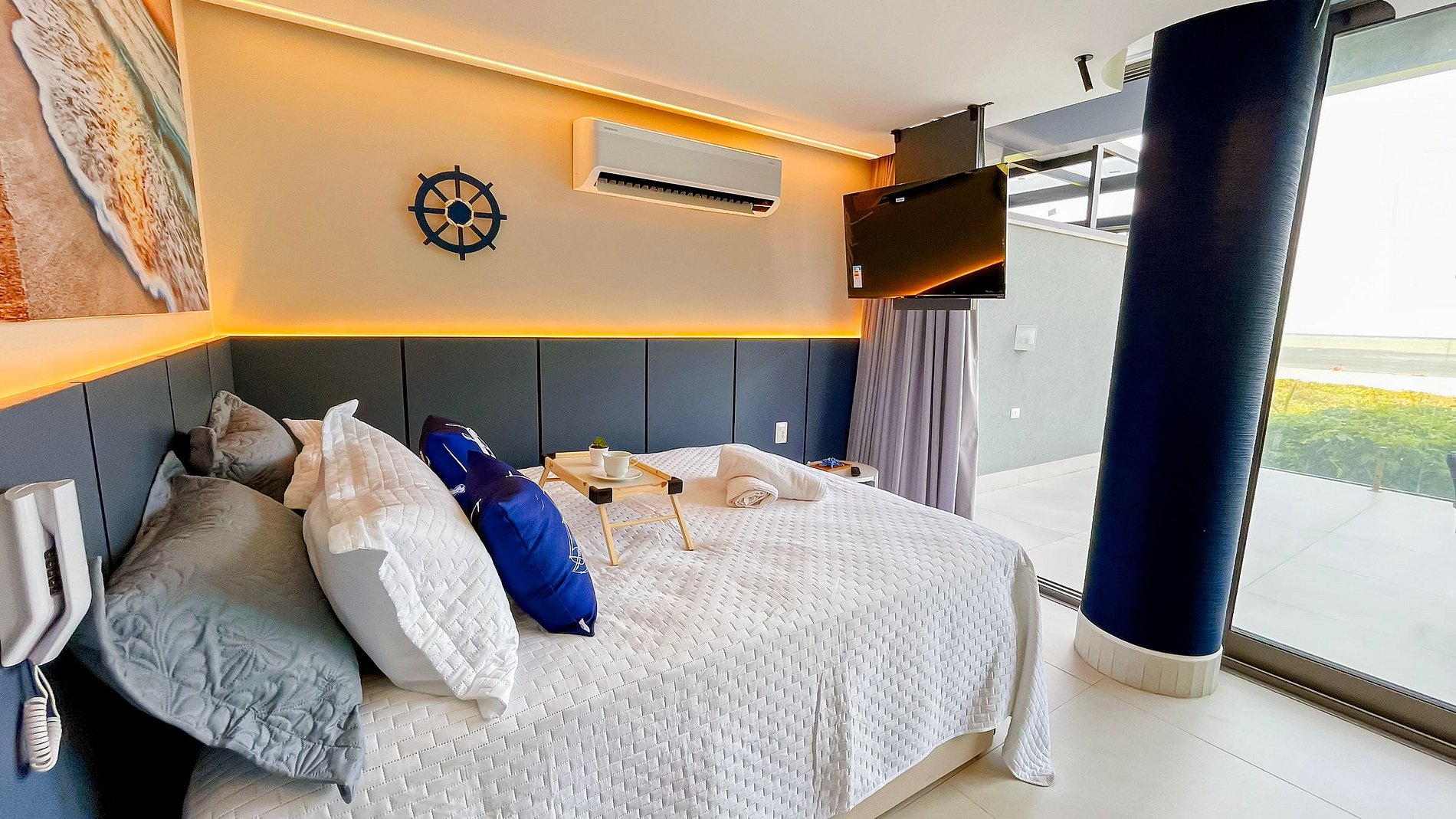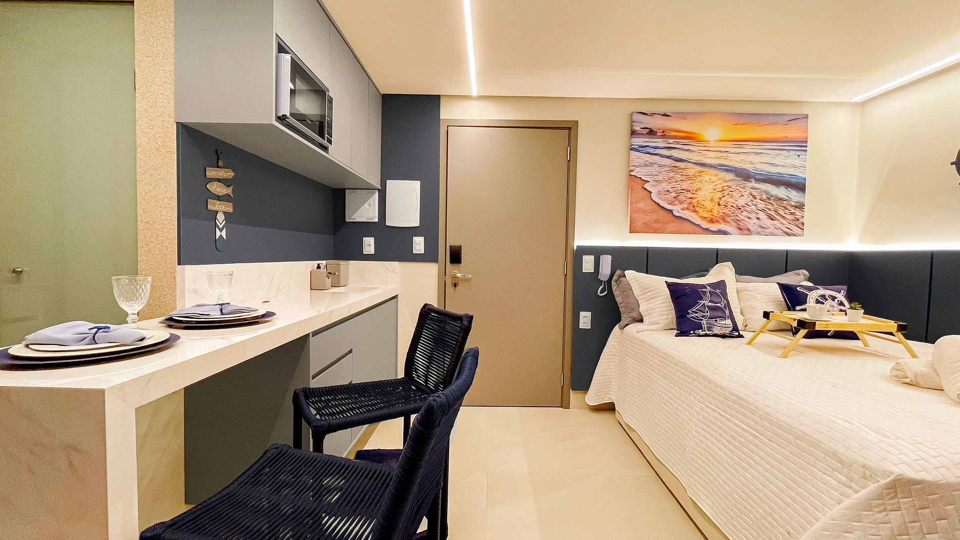 Com 28m², o apartamento acomoda até 2 pessoas em cama de casal e oferece vista para o mar. Possui cozinha compacta equipada com micro-ondas, frigobar, liquidificador, cafeteira e utensílios essenciais, além de Smart TV para seu entretenimento.