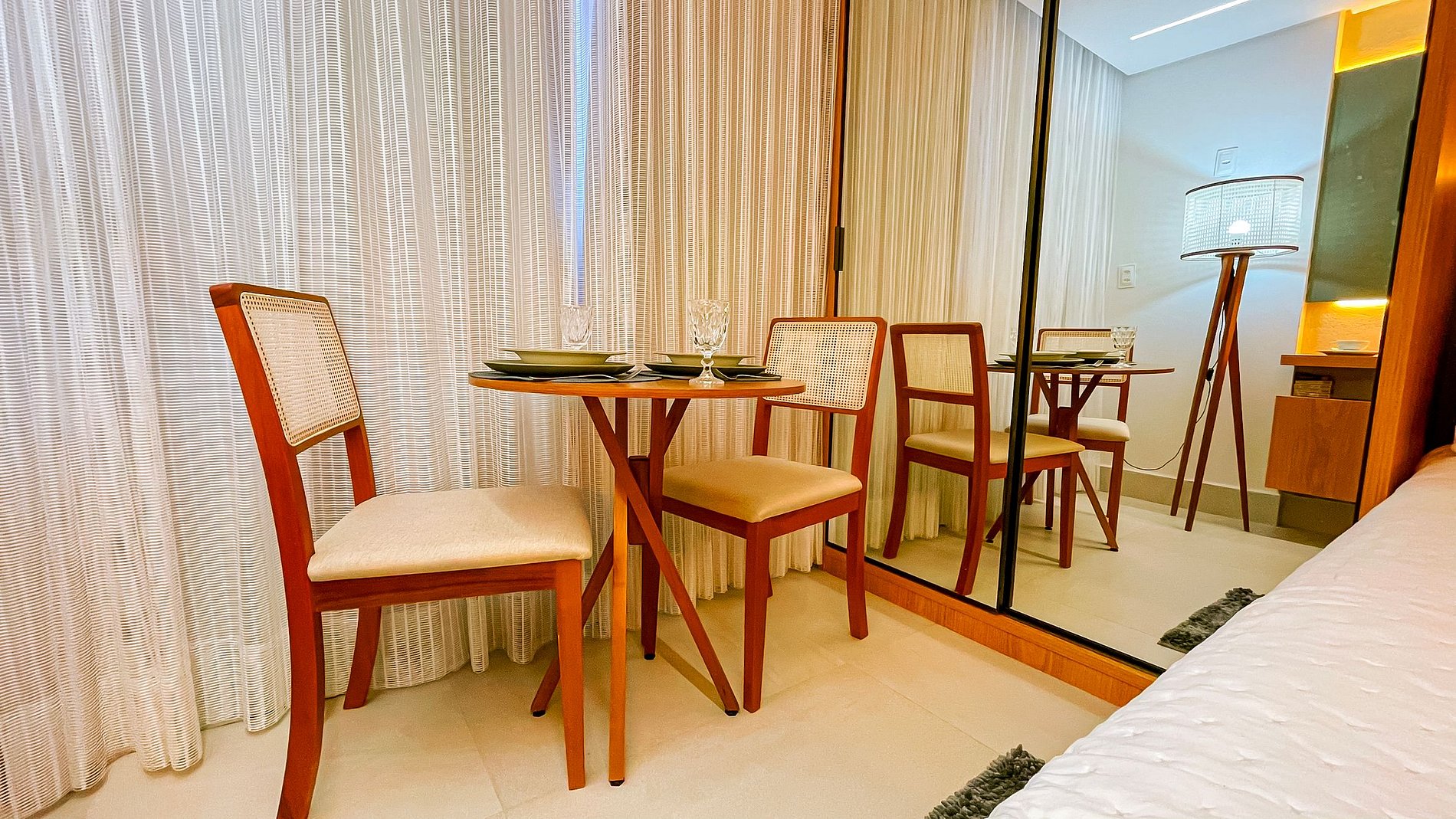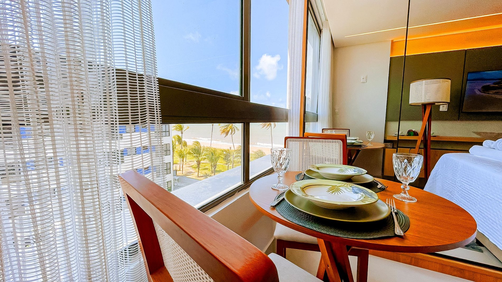 Com 20m², o apartamento acomoda até 2 pessoas em cama de casal e oferece vista para o mar. Possui cozinha compacta equipada com micro-ondas, frigobar, cafeteira e utensílios essenciais, além de Smart TV para seu entretenimento.
