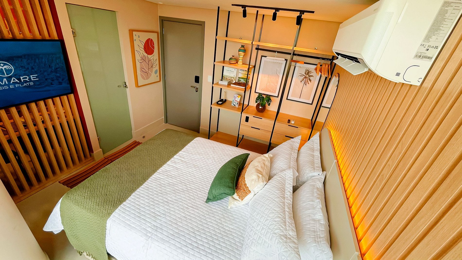 Com 25m², o apartamento acomoda até 2 pessoas em cama de casal e 1 criança em cama auxiliar, com vista para o mar. Possui cozinha compacta equipada com fogão, micro-ondas, frigobar, cafeteira e utensílios, além de Smart TV. Localizado no Jardim Oceania, próximo à Praia do Bessa, o condomínio oferece piscina na cobertura, sauna e academia, garantindo conforto e praticidade.