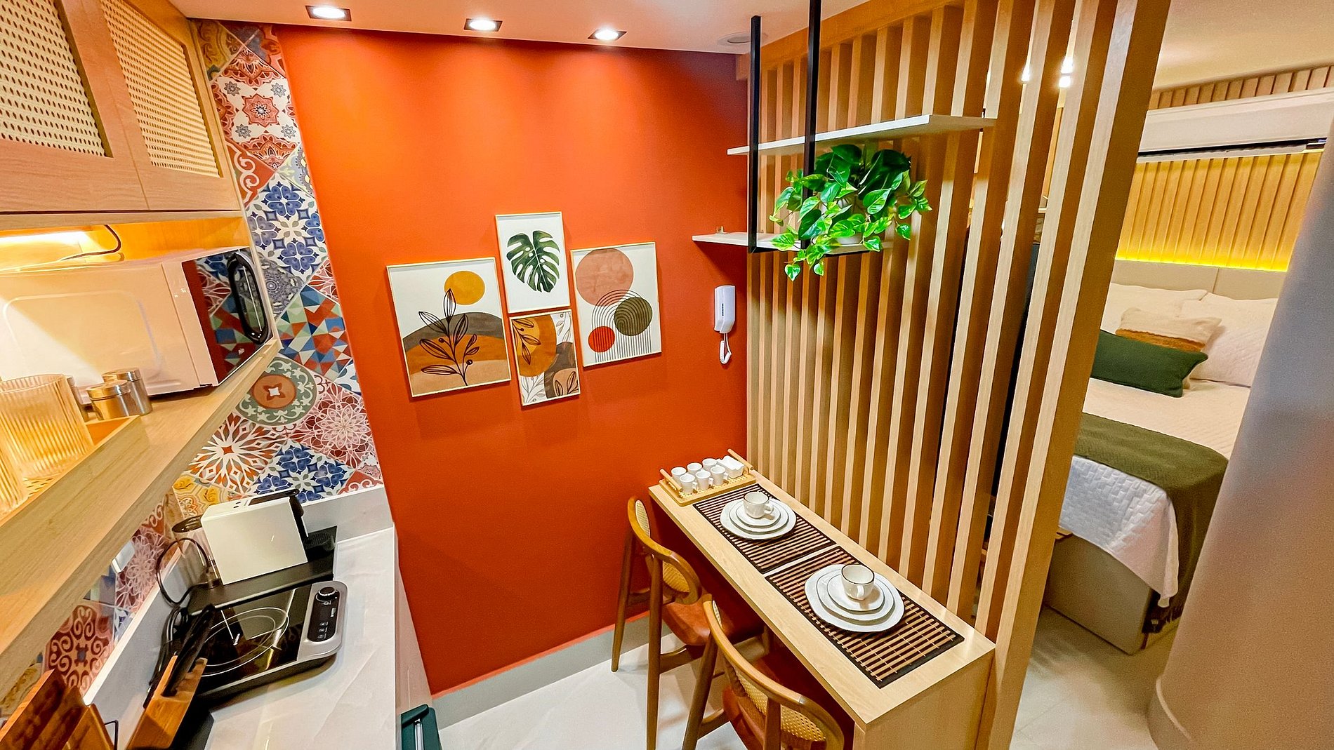 O charmoso apartamento com vista para o mar possui um ambiente único, composto por uma cozinha compacta para pequenas refeições e um quarto aconchegante com cama de casal. São 28m² super confortáveis, equipados com Smart TV e Wi-Fi gratuito. Disponibilizamos enxoval de cama, com lençóis e toalhas, além de utensílios domésticos essenciais para preparar pequenas refeições no conforto do seu próprio espaço. Como cortesia, oferecemos alguns amenities.