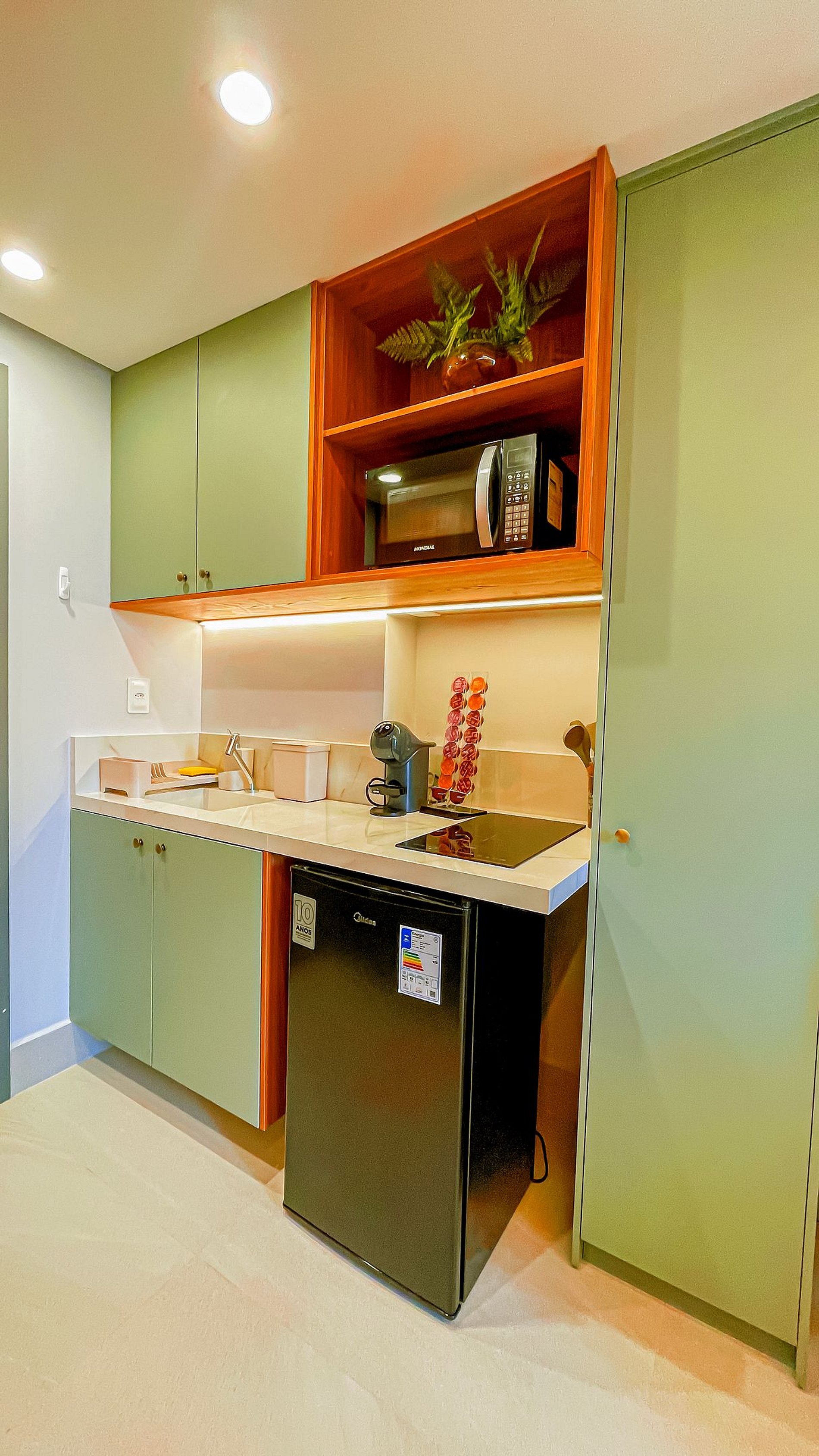 Apartamento de 28m², acomoda até 2 pessoas em cama de casal e possui duas camas auxiliares para crianças. Cozinha compacta equipada com fogão, micro-ondas, frigobar, sanduicheira, liquidificador, cafeteira e utensílios. Conta com Smart TV. Localizado no Jardim Oceania, próximo à Praia do Bessa, restaurantes e comércio. Condomínio com piscina na cobertura, sauna, academia e estacionamento rotativo, garantindo praticidade e conforto.