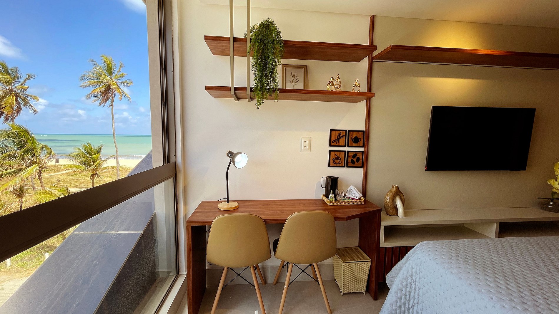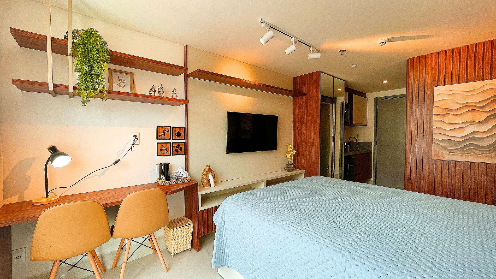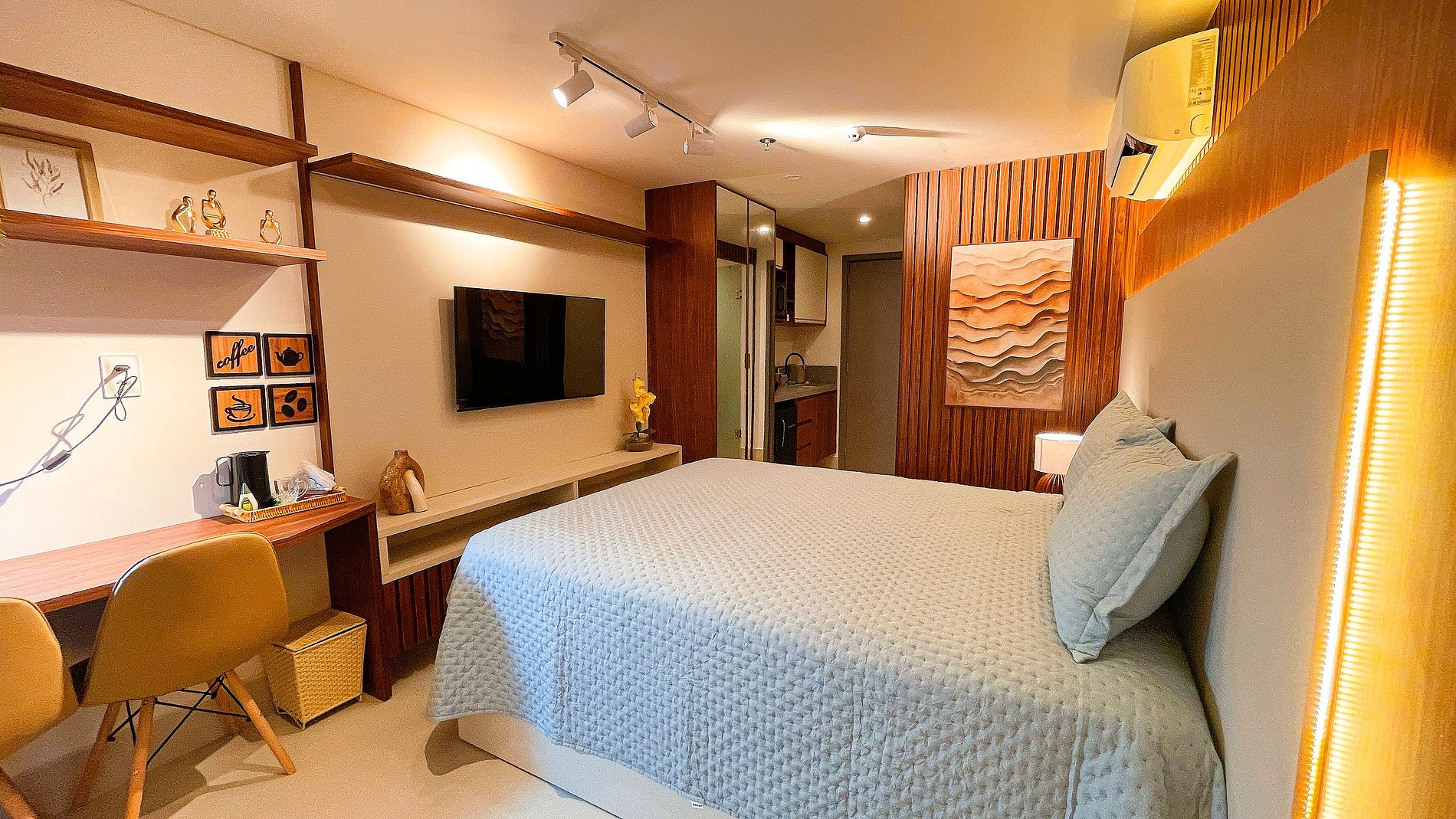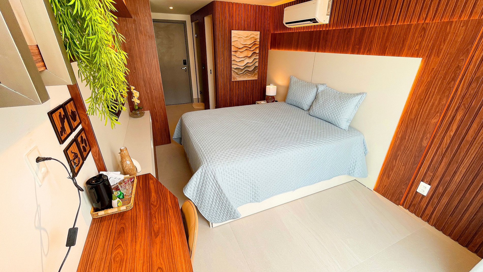 O apartamento possui uma cama queen com 01x auxiliar solteiro que acomoda 02x adultos e 01x criança e oferece vista lateral para o mar. Possui cozinha compacta equipada com micro-ondas, frigobar, cafeteira e utensílios essenciais, além de Smart TV para seu entretenimento.