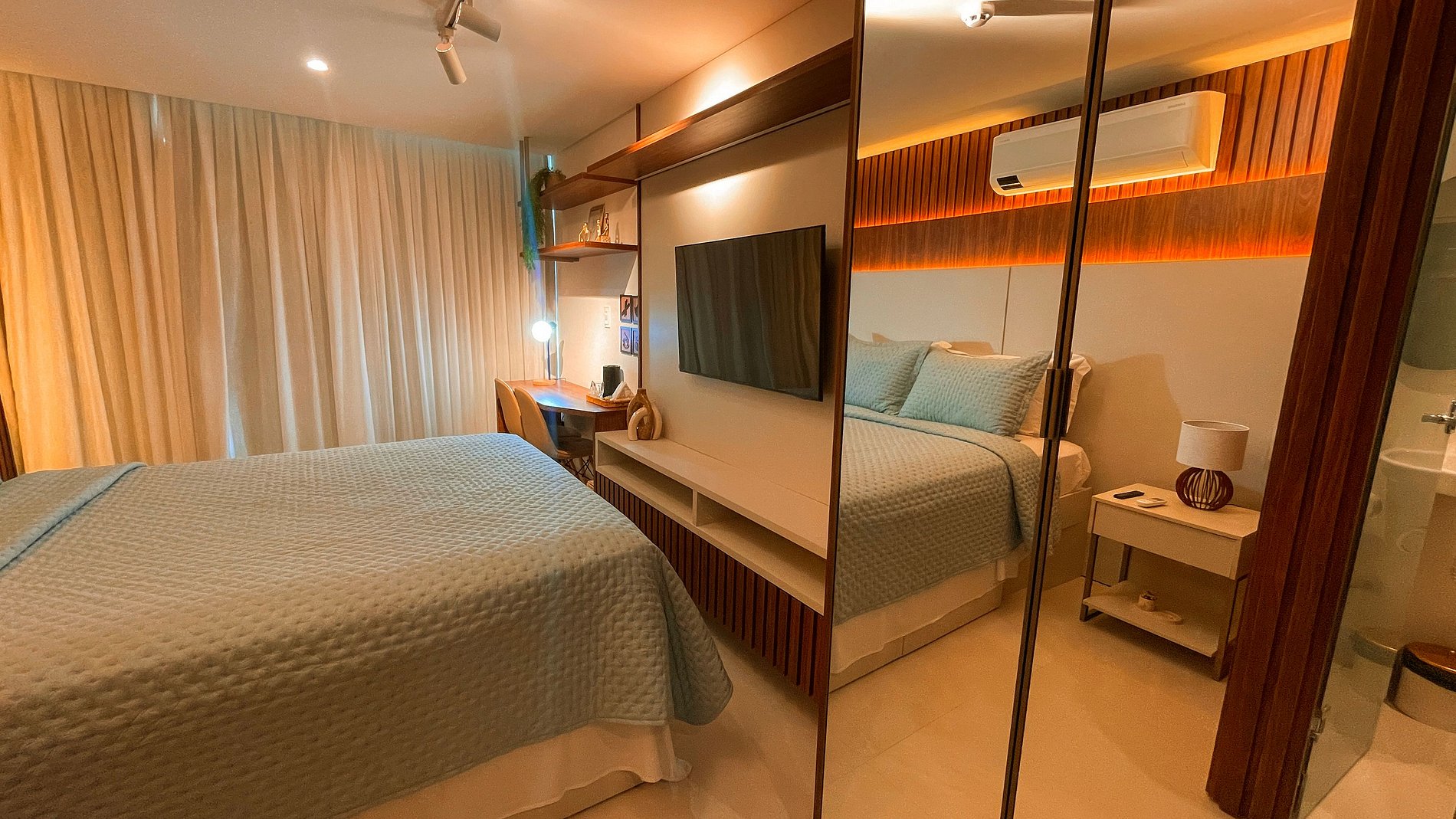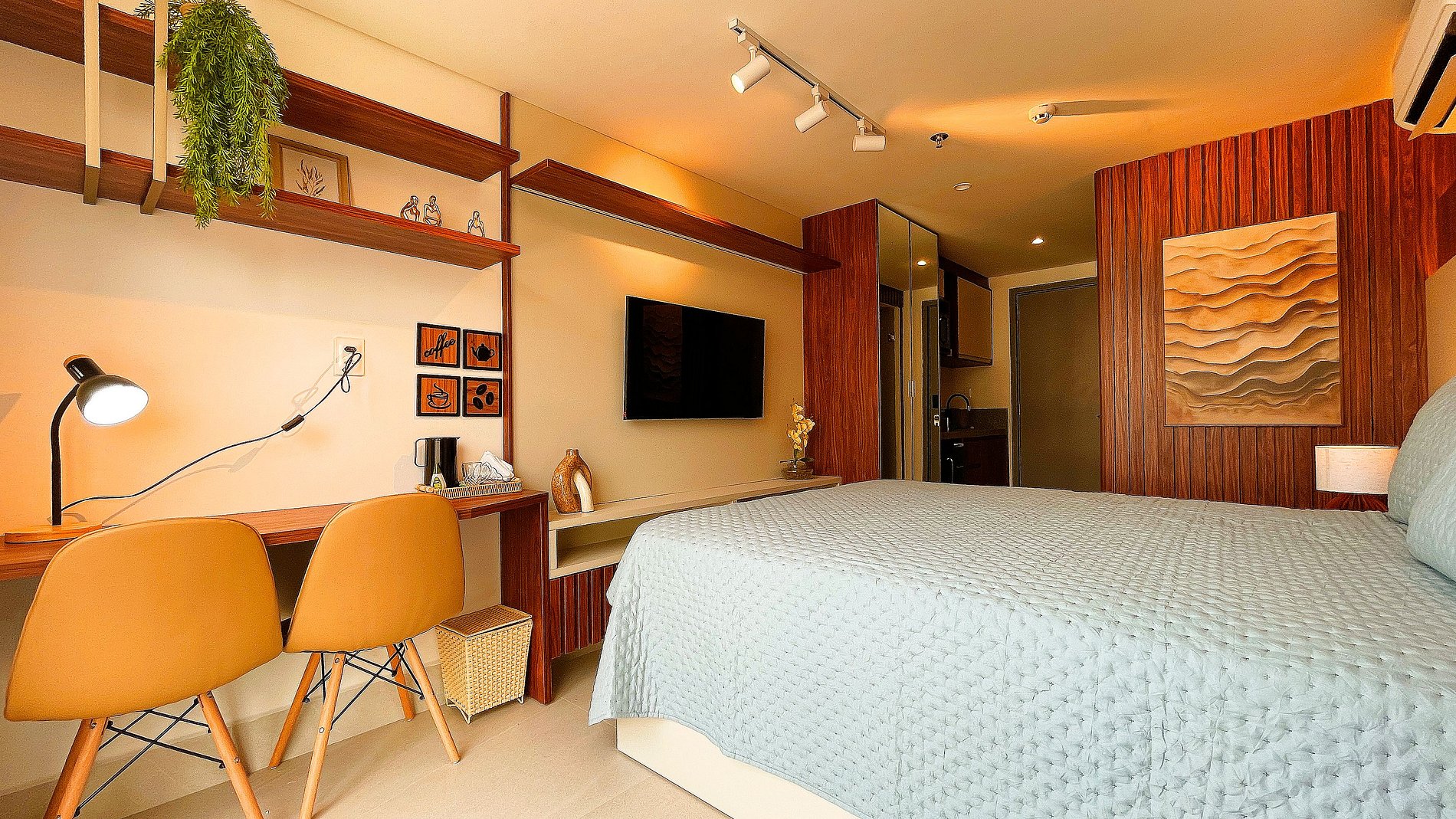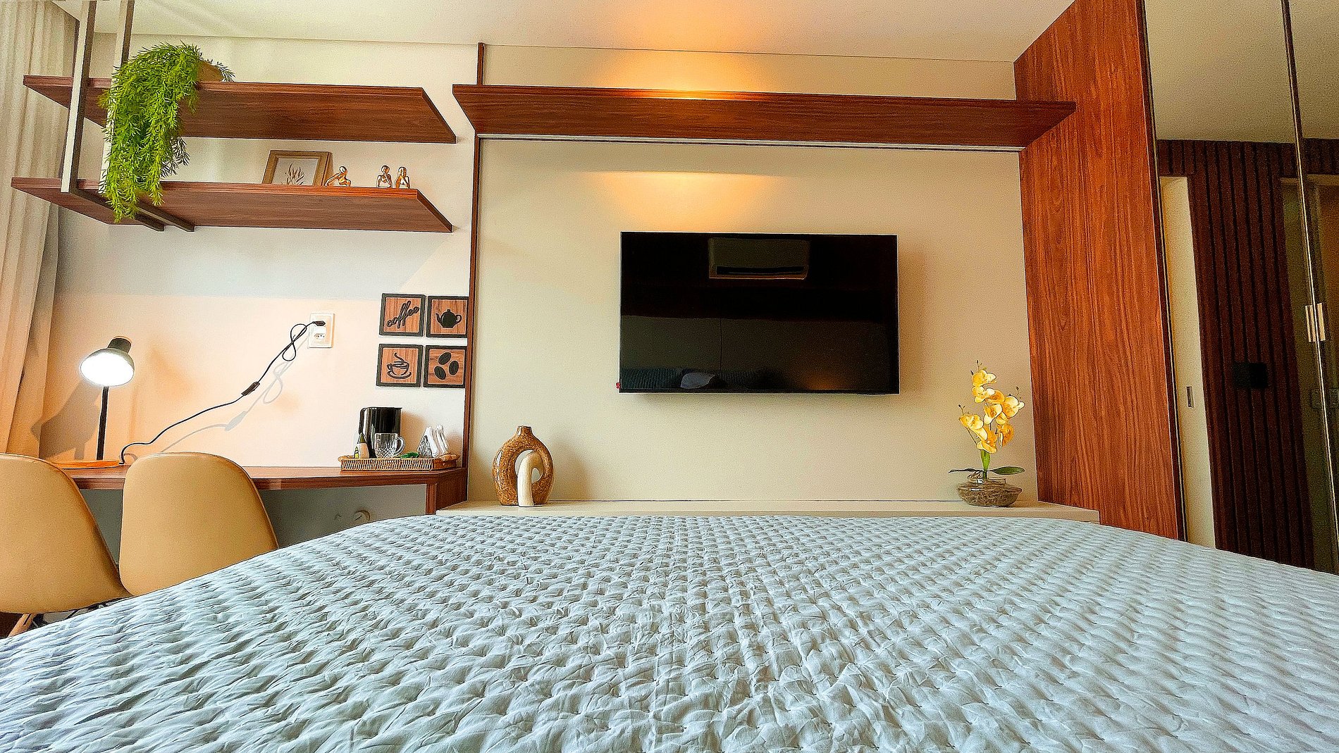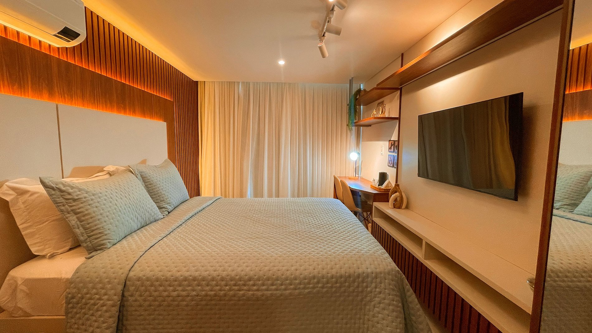 O apartamento possui uma cama queen com 01x auxiliar solteiro que acomoda 02x adultos e 01x criança e oferece vista lateral para o mar. Possui cozinha compacta equipada com micro-ondas, frigobar, cafeteira e utensílios essenciais, além de Smart TV para seu entretenimento.