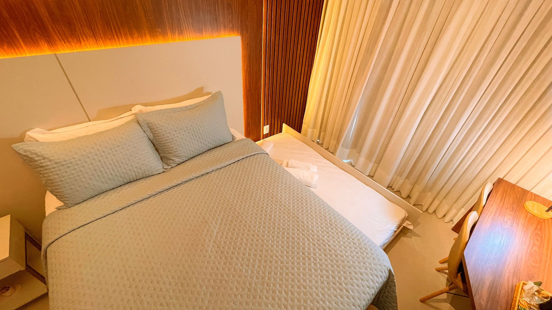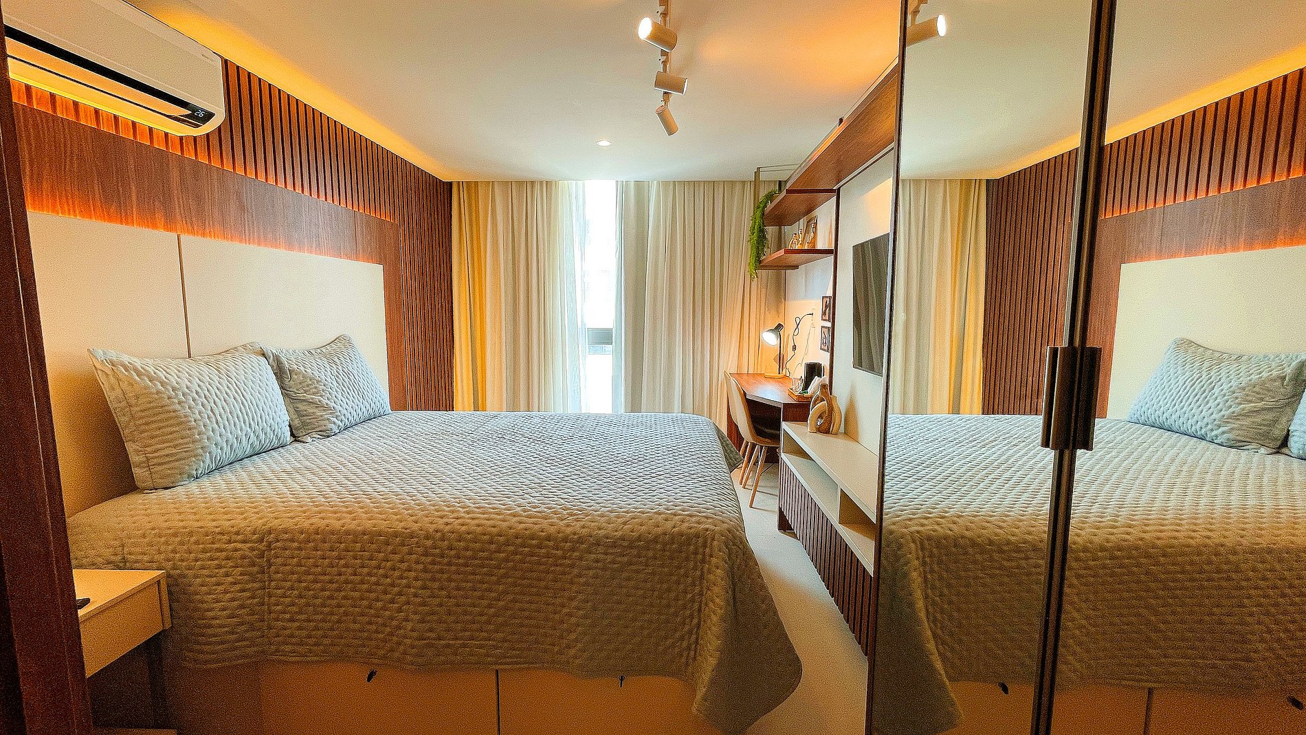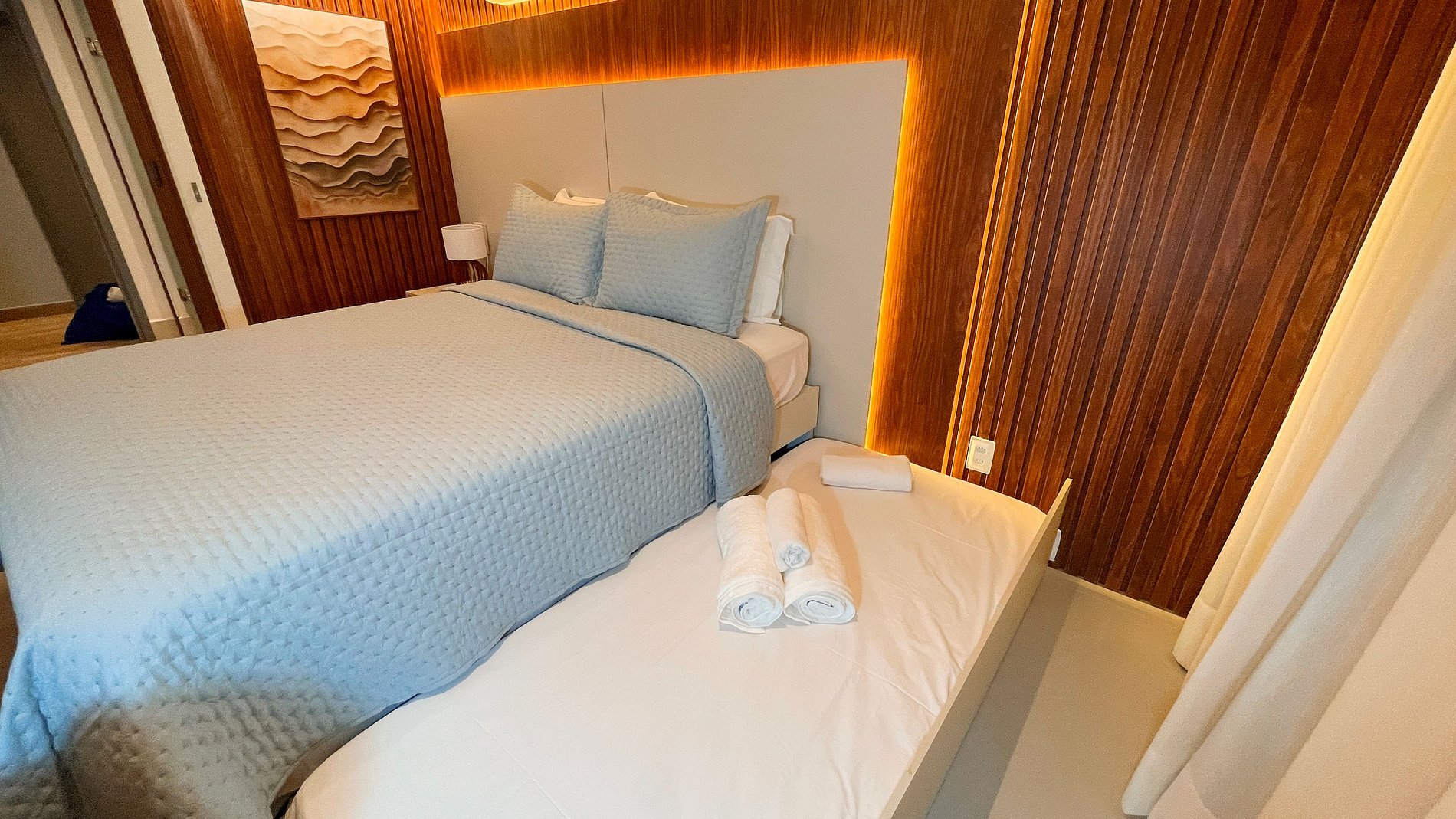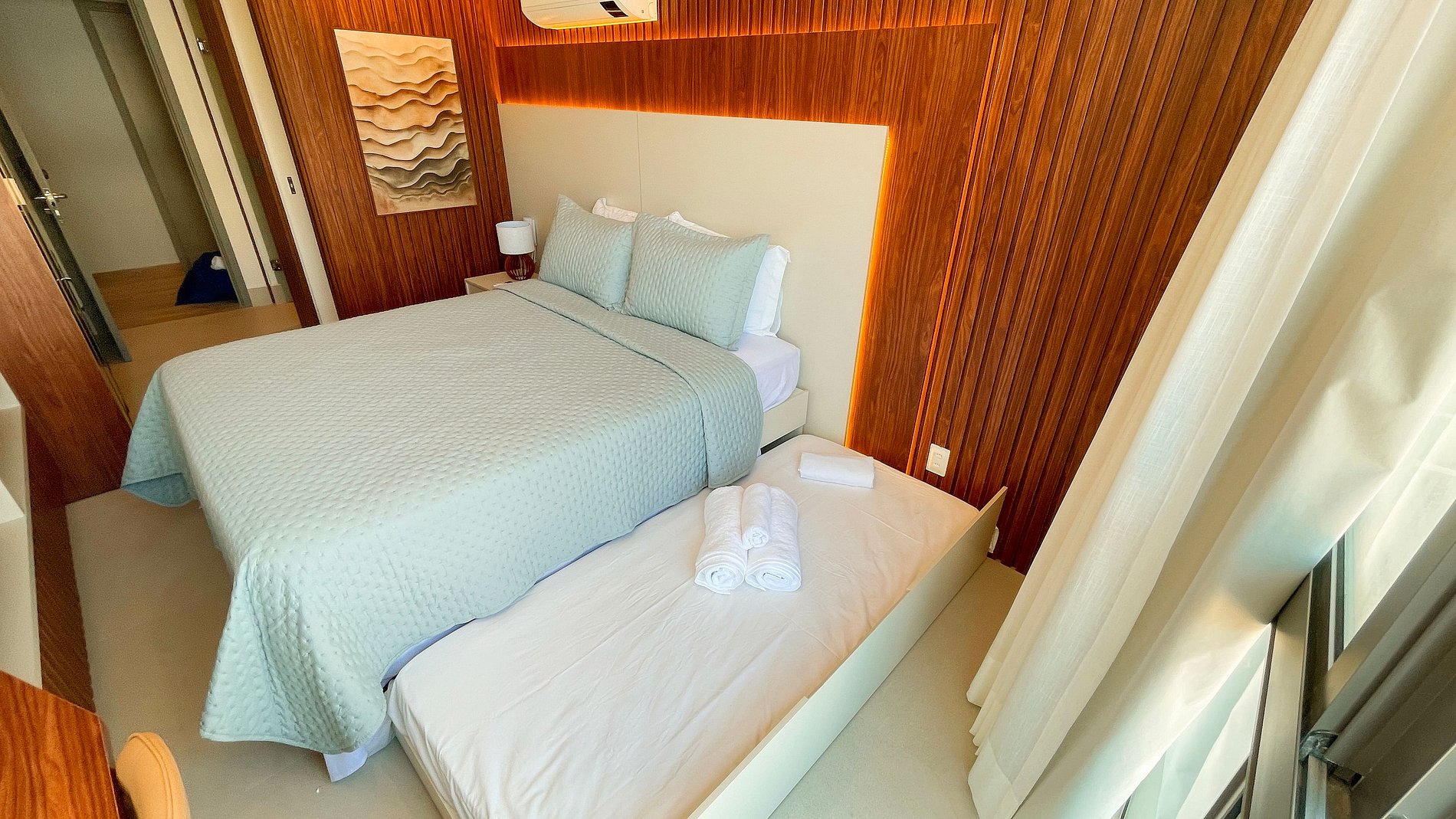 O apartamento possui uma cama queen com 01x auxiliar solteiro que acomoda 02x adultos e 01x criança e oferece vista lateral para o mar. Possui cozinha compacta equipada com micro-ondas, frigobar, cafeteira e utensílios essenciais, além de Smart TV para seu entretenimento.