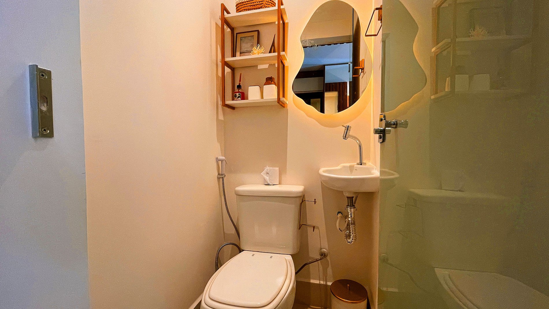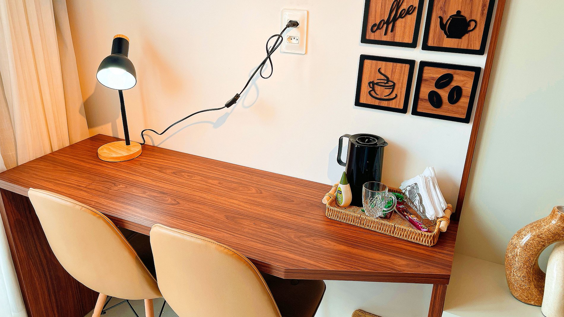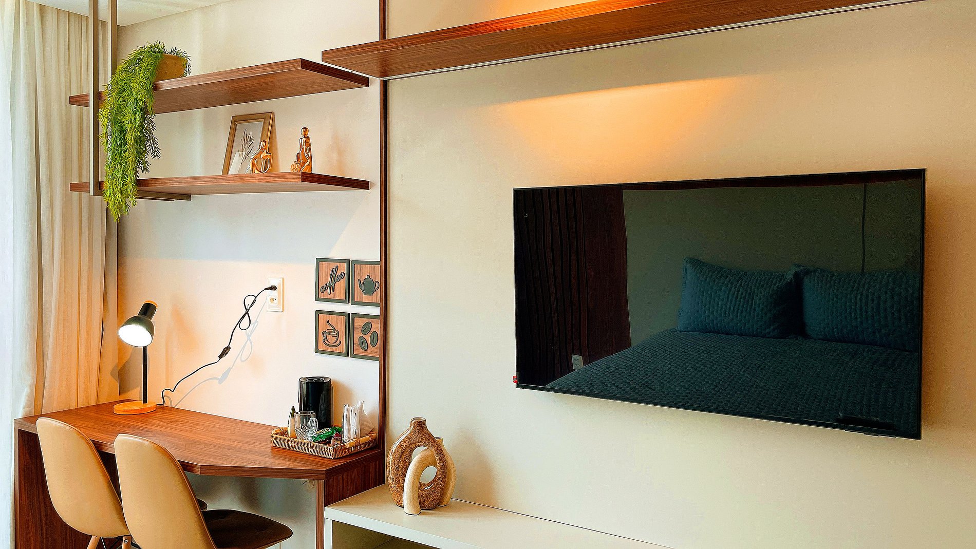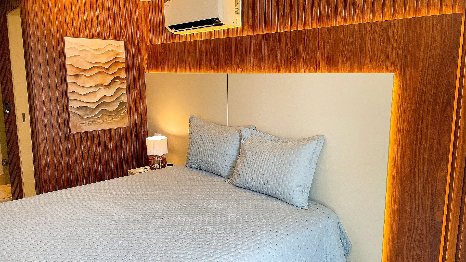 O apartamento possui uma cama queen com 01x auxiliar solteiro que acomoda 02x adultos e 01x criança e oferece vista lateral para o mar. Possui cozinha compacta equipada com micro-ondas, frigobar, cafeteira e utensílios essenciais, além de Smart TV para seu entretenimento.