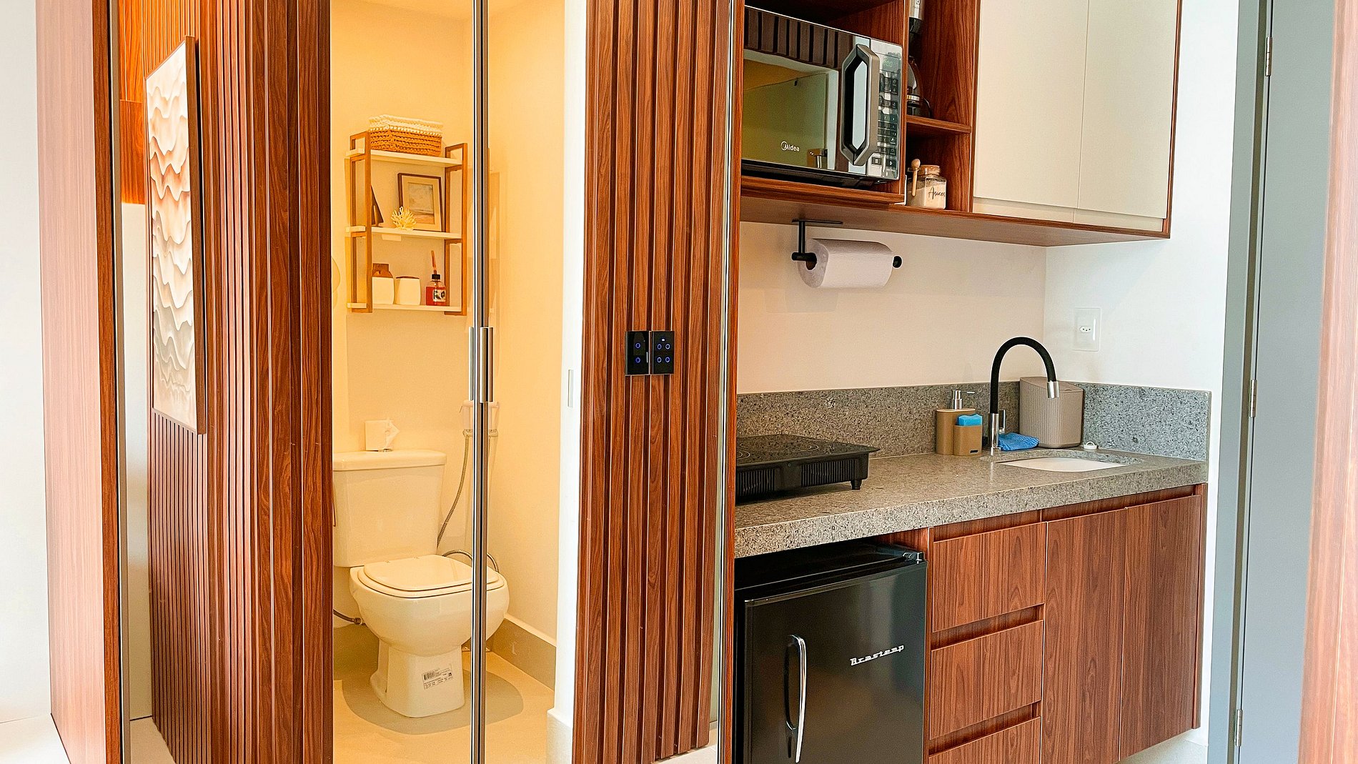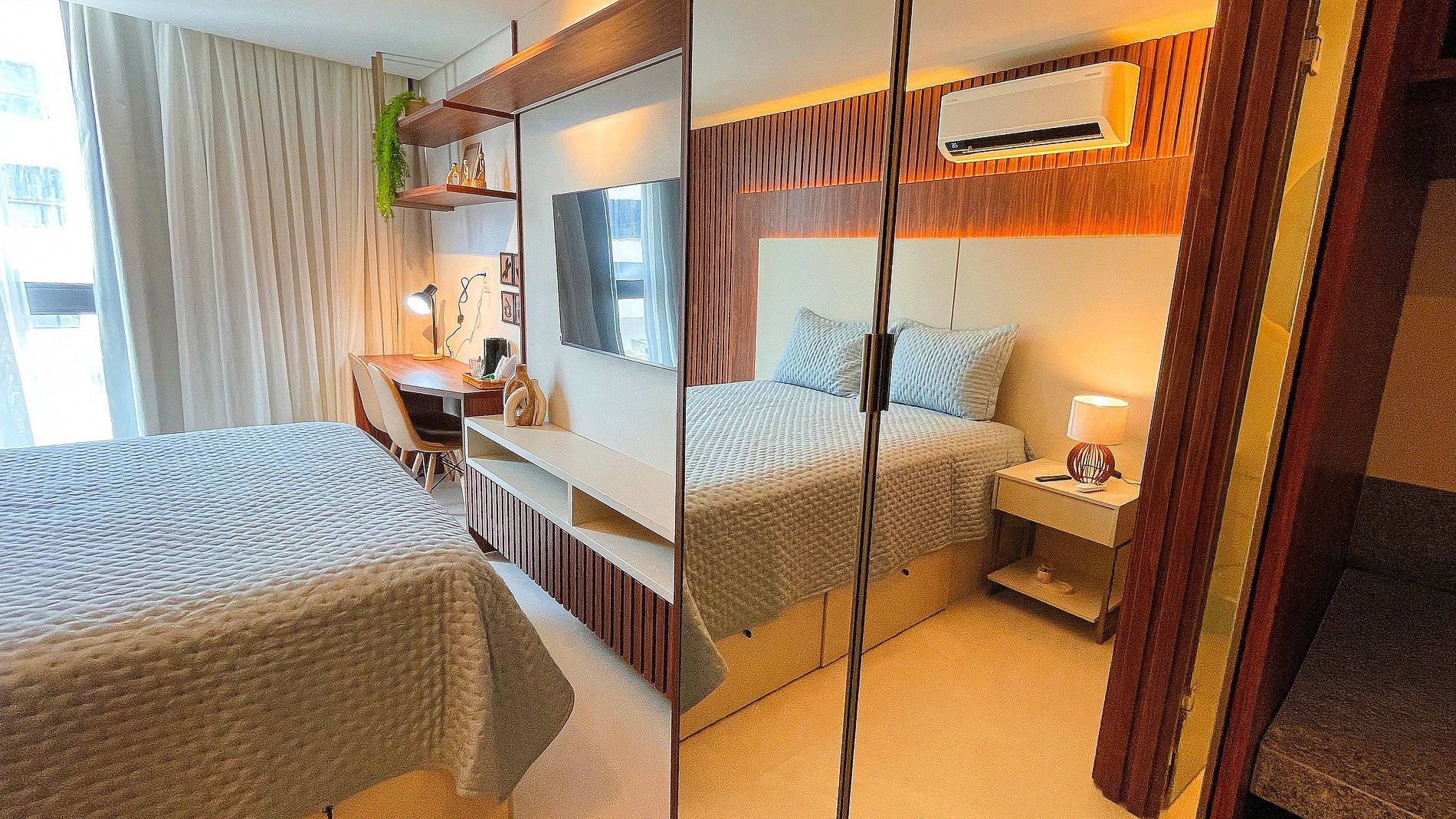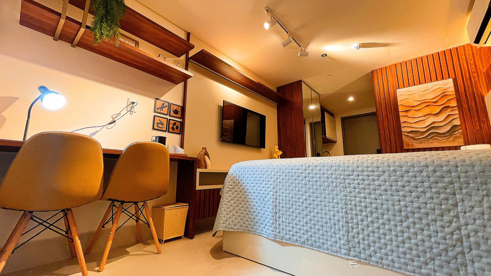 Com 19m², o apartamento acomoda até 2 pessoas em cama de casal e possui uma cama auxiliar para comodar uma criança e oferece vista lateral para o mar. Possui cozinha compacta equipada com micro-ondas, frigobar, cafeteira e utensílios essenciais, além de Smart TV para seu entretenimento.