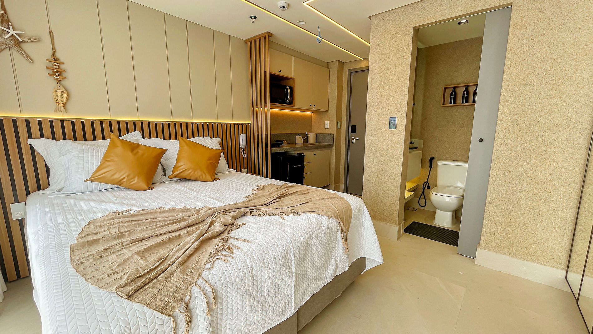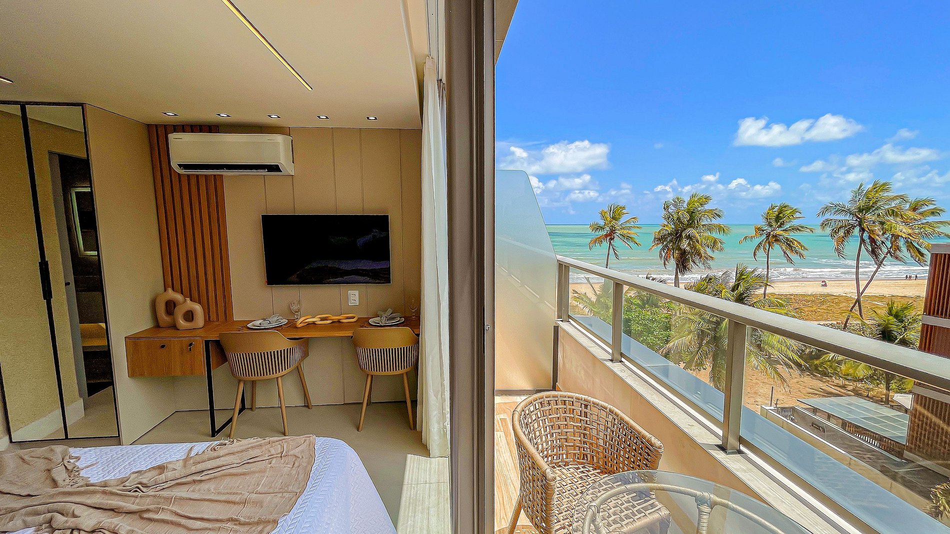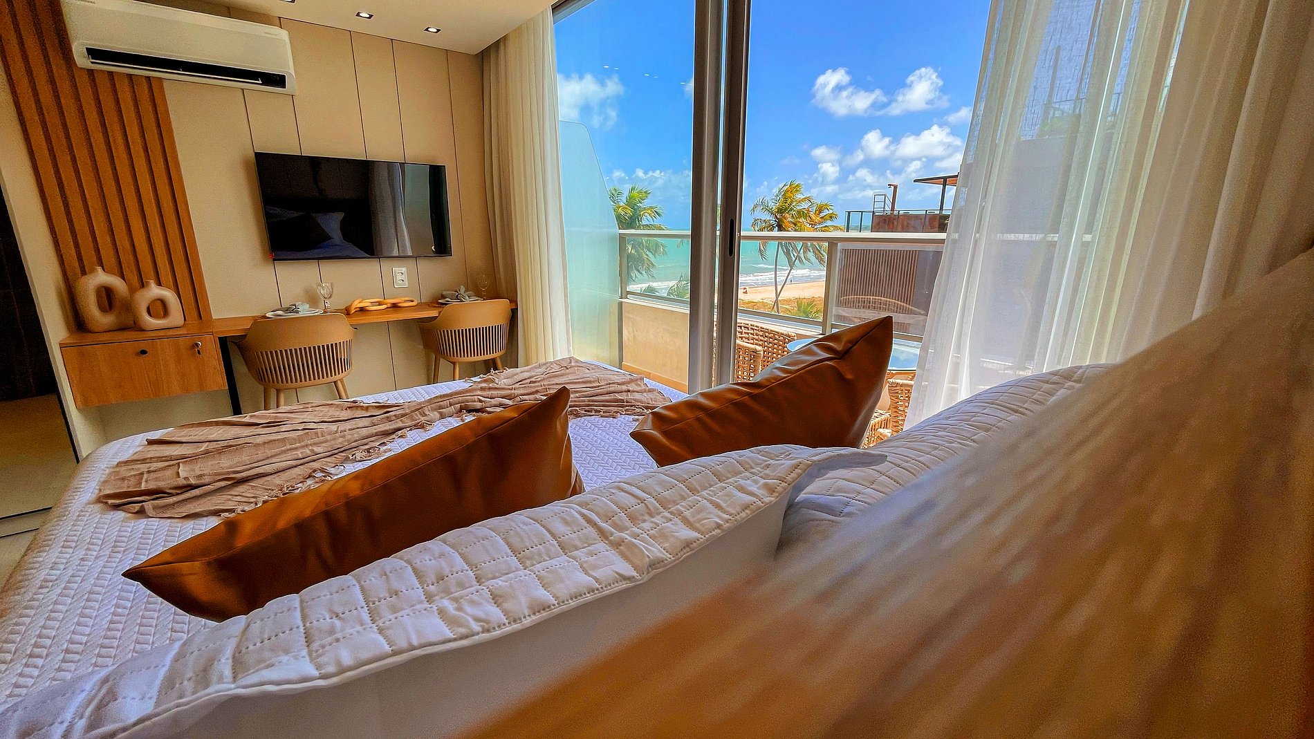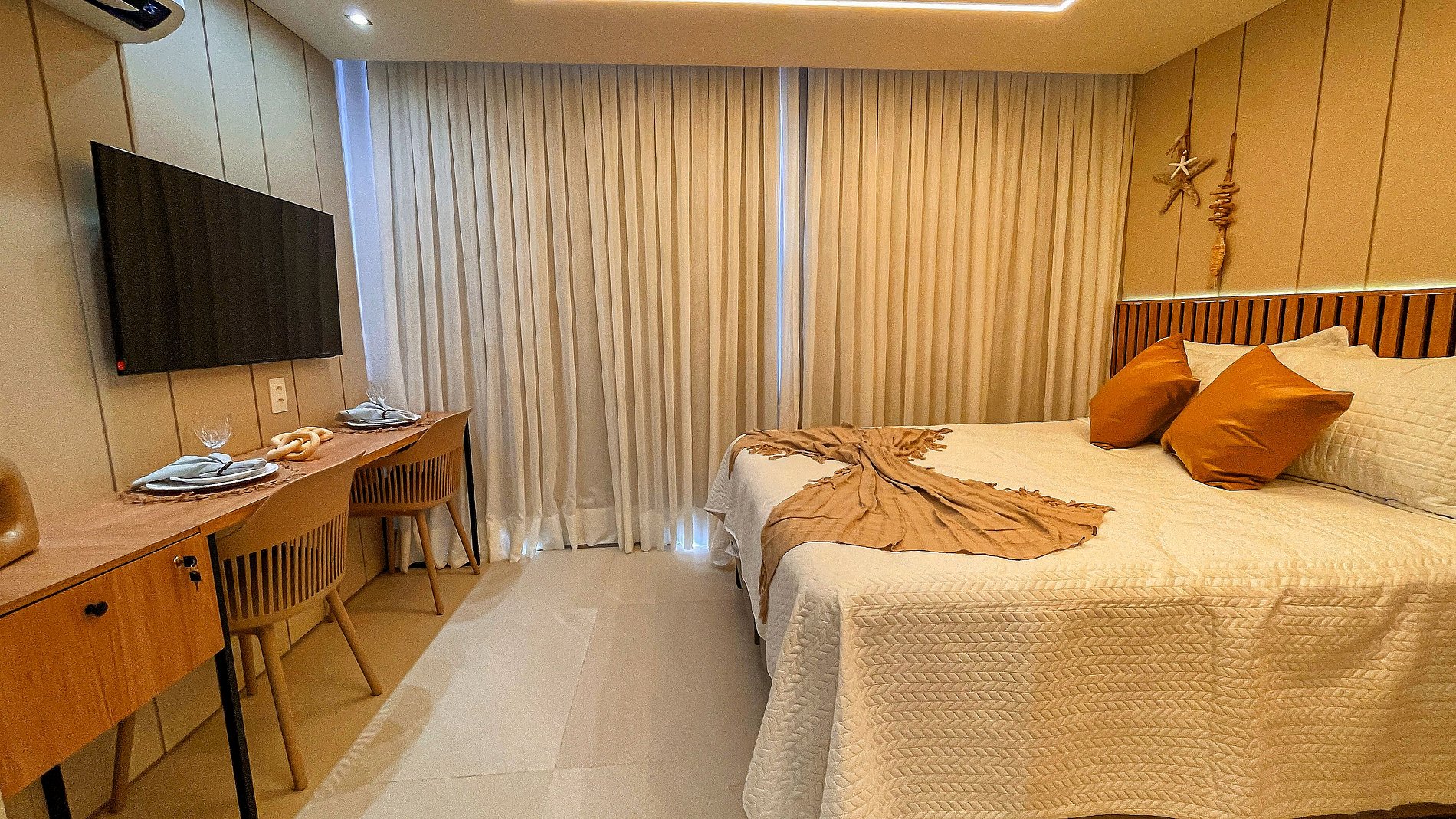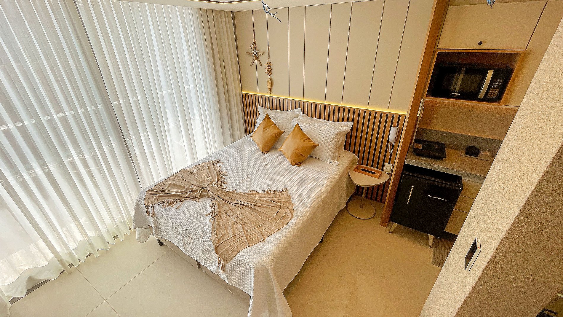 Com 28m², o apartamento acomoda confortavelmente até 2 pessoas em uma cama de casal e conta com uma agradável vista mar lateral, além de uma varanda perfeita para relaxar. A cozinha compacta é equipada com micro-ondas, frigobar, cafeteira e utensílios essenciais para pequenas refeições, e o espaço ainda dispõe de Smart TV para o seu entretenimento.