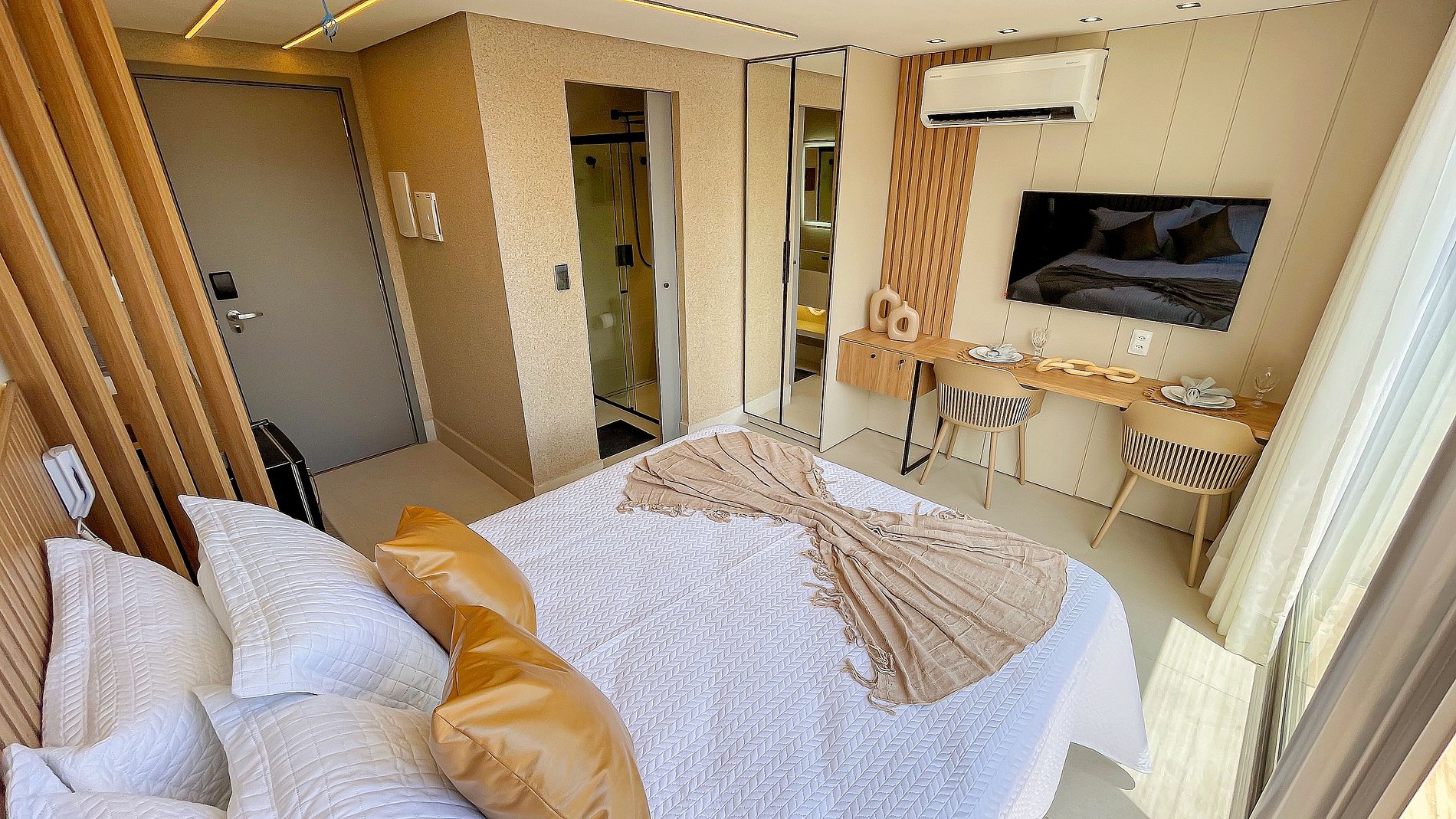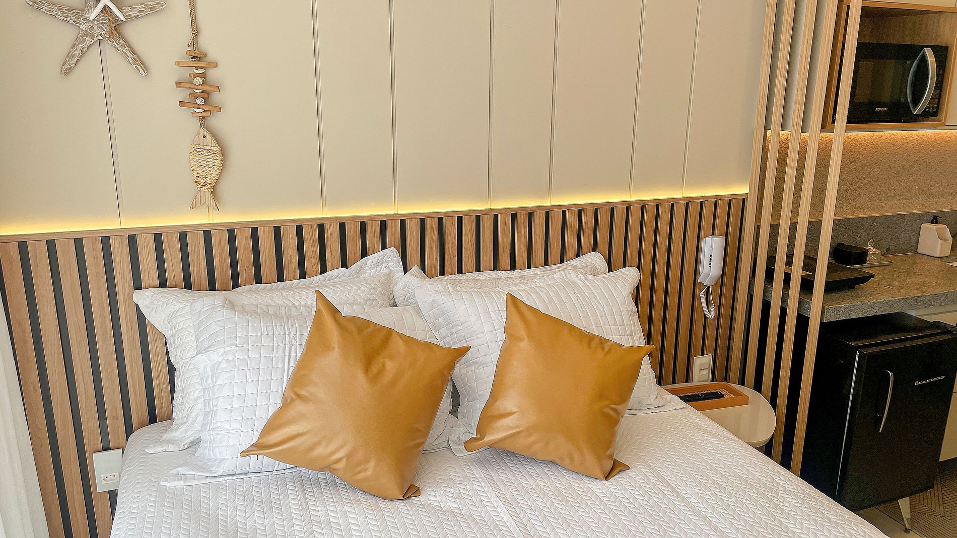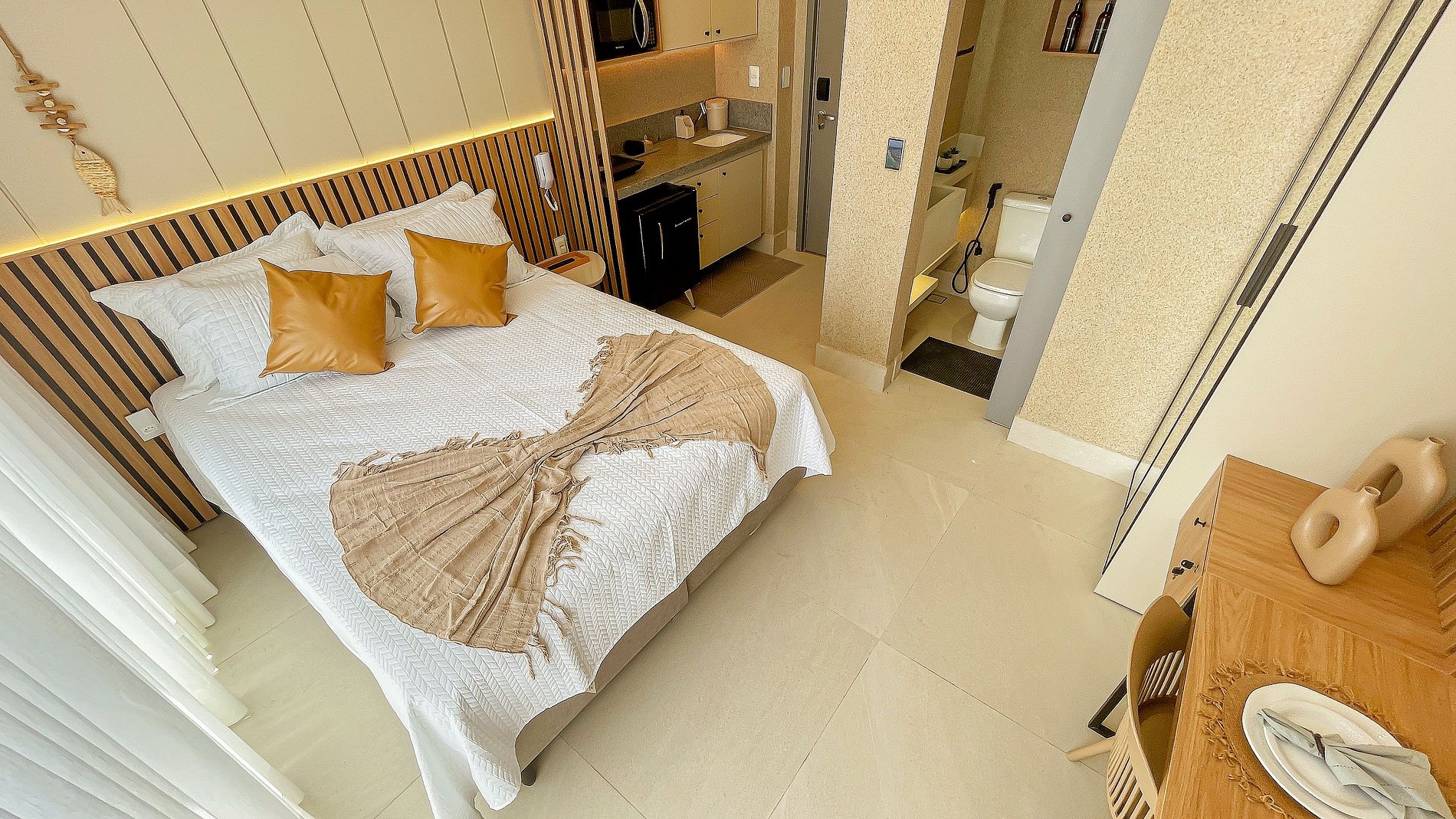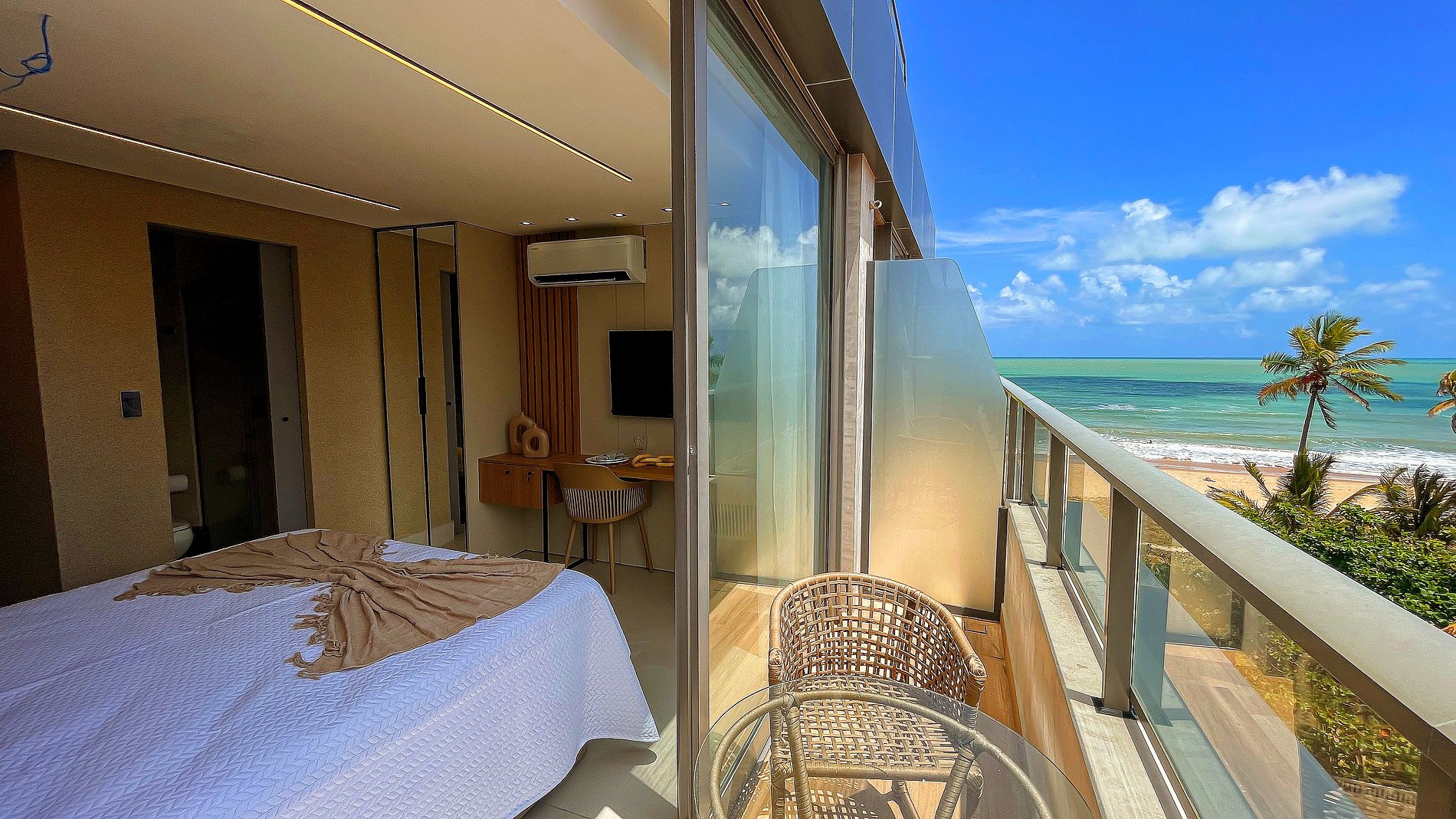 Com 28m², o apartamento acomoda confortavelmente até 2 pessoas em uma cama de casal e conta com uma agradável vista mar lateral, além de uma varanda perfeita para relaxar. A cozinha compacta é equipada com micro-ondas, frigobar, cafeteira e utensílios essenciais para pequenas refeições, e o espaço ainda dispõe de Smart TV para o seu entretenimento.