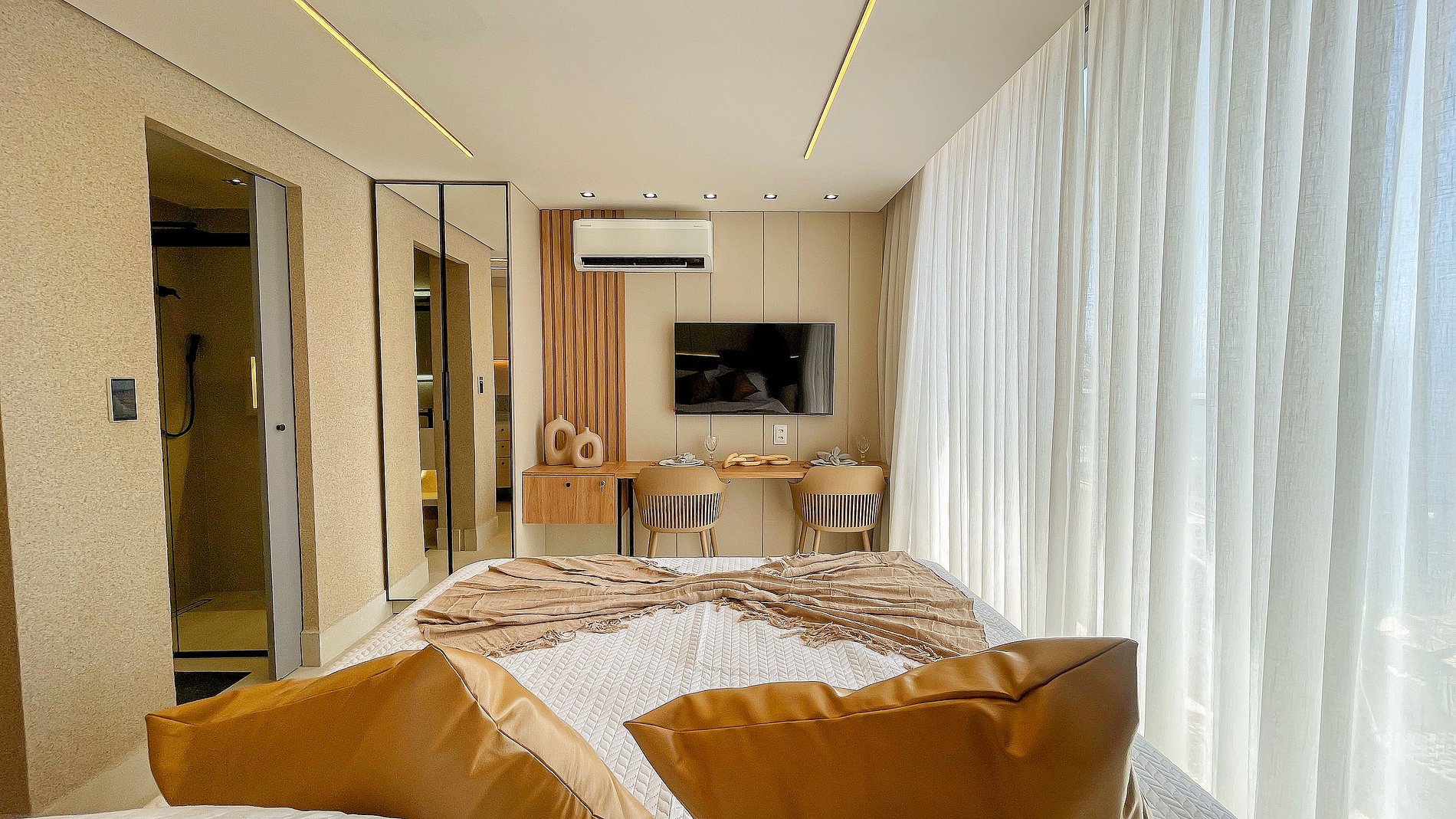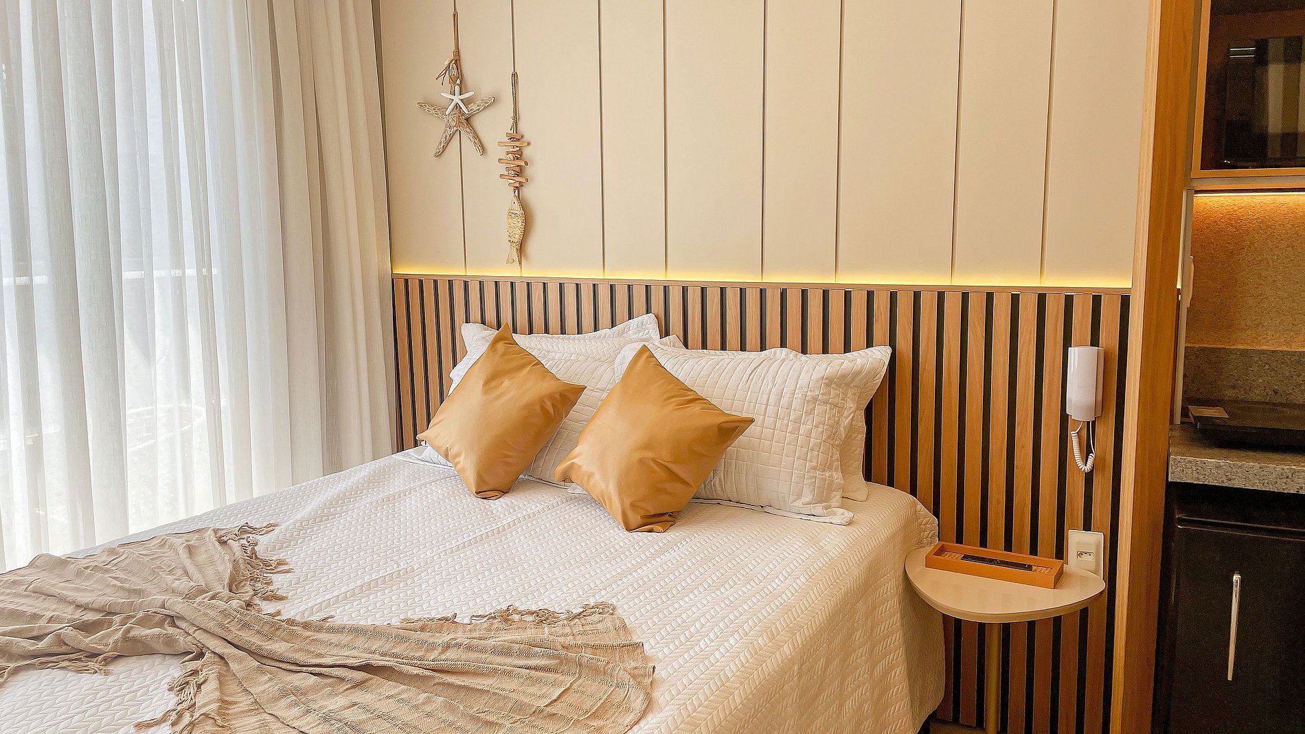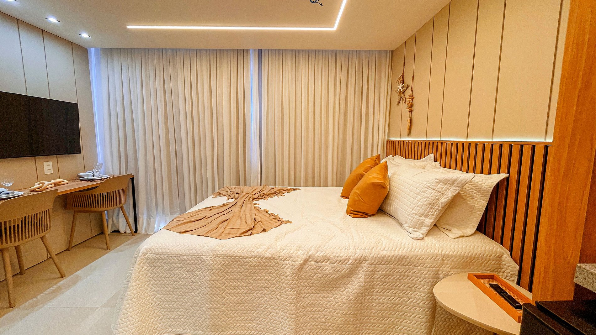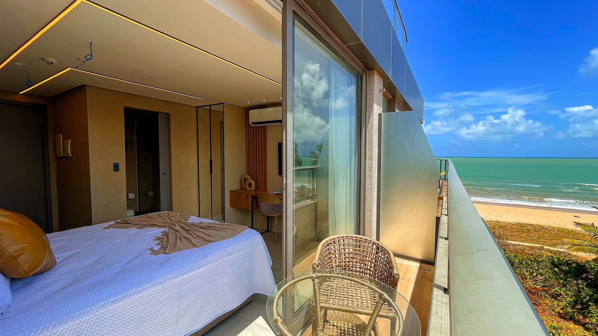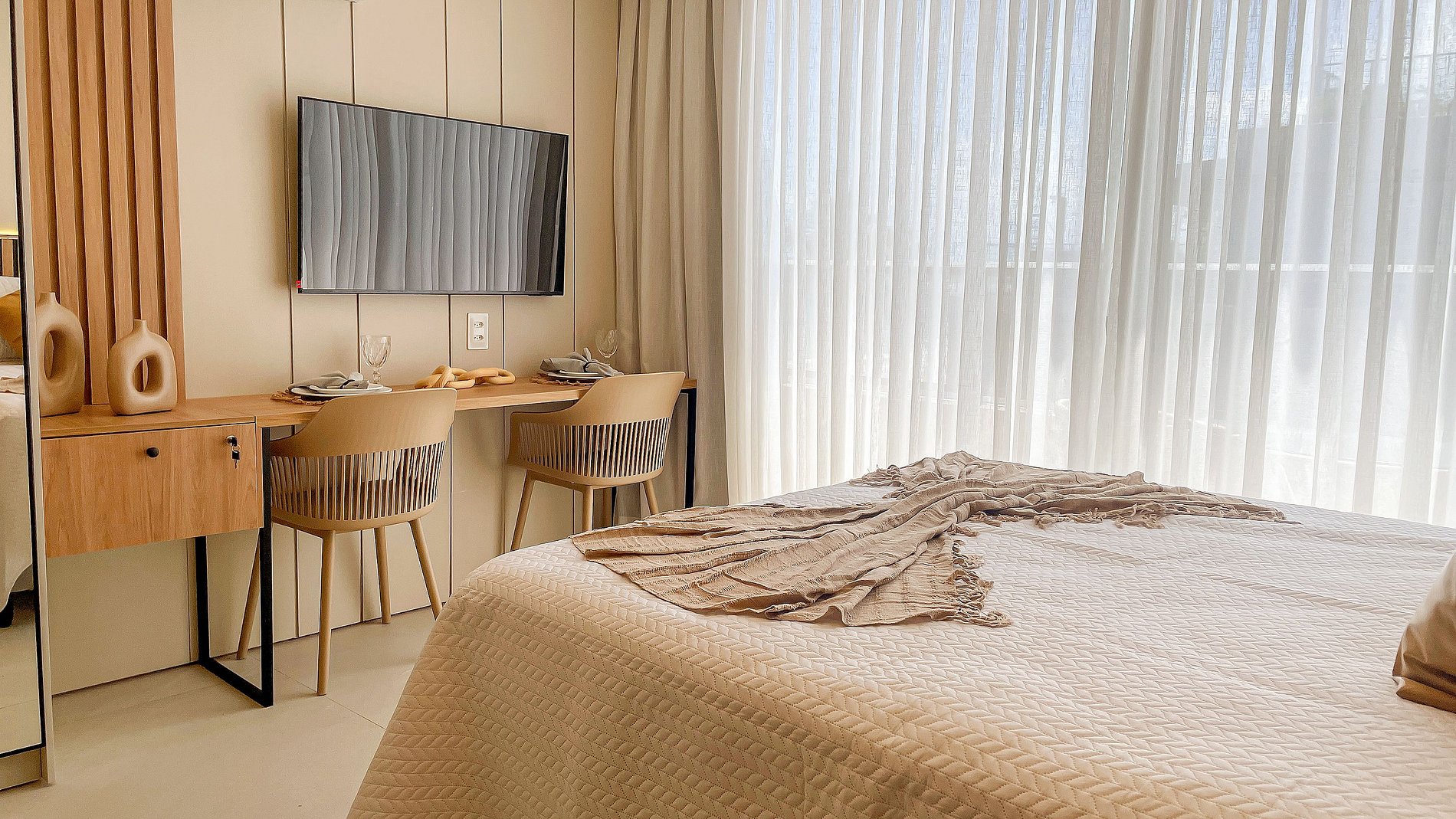 Com 28m², o apartamento acomoda confortavelmente até 2 pessoas em uma cama de casal e conta com uma agradável vista mar lateral, além de uma varanda perfeita para relaxar. A cozinha compacta é equipada com micro-ondas, frigobar, cafeteira e utensílios essenciais para pequenas refeições, e o espaço ainda dispõe de Smart TV para o seu entretenimento.