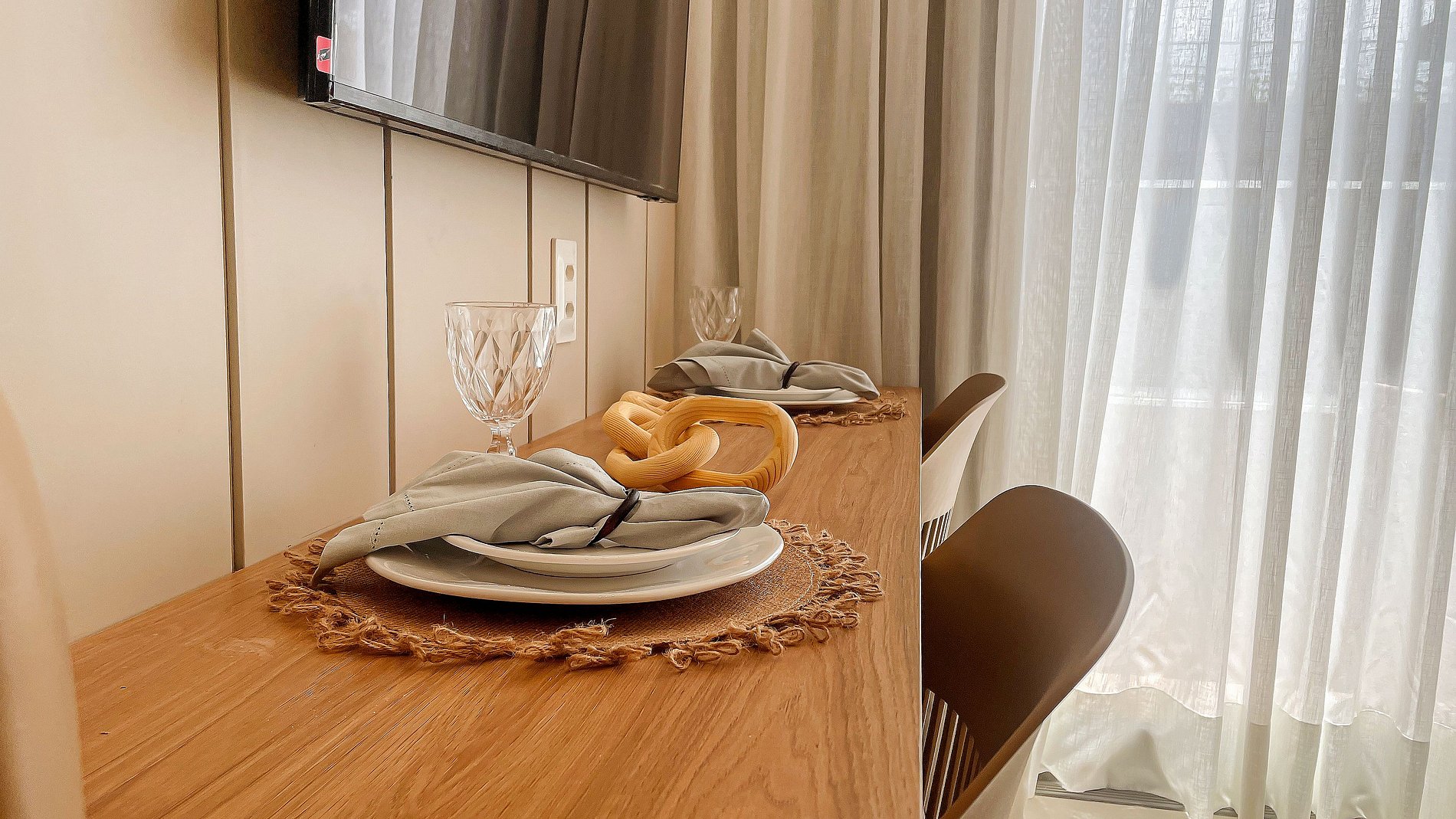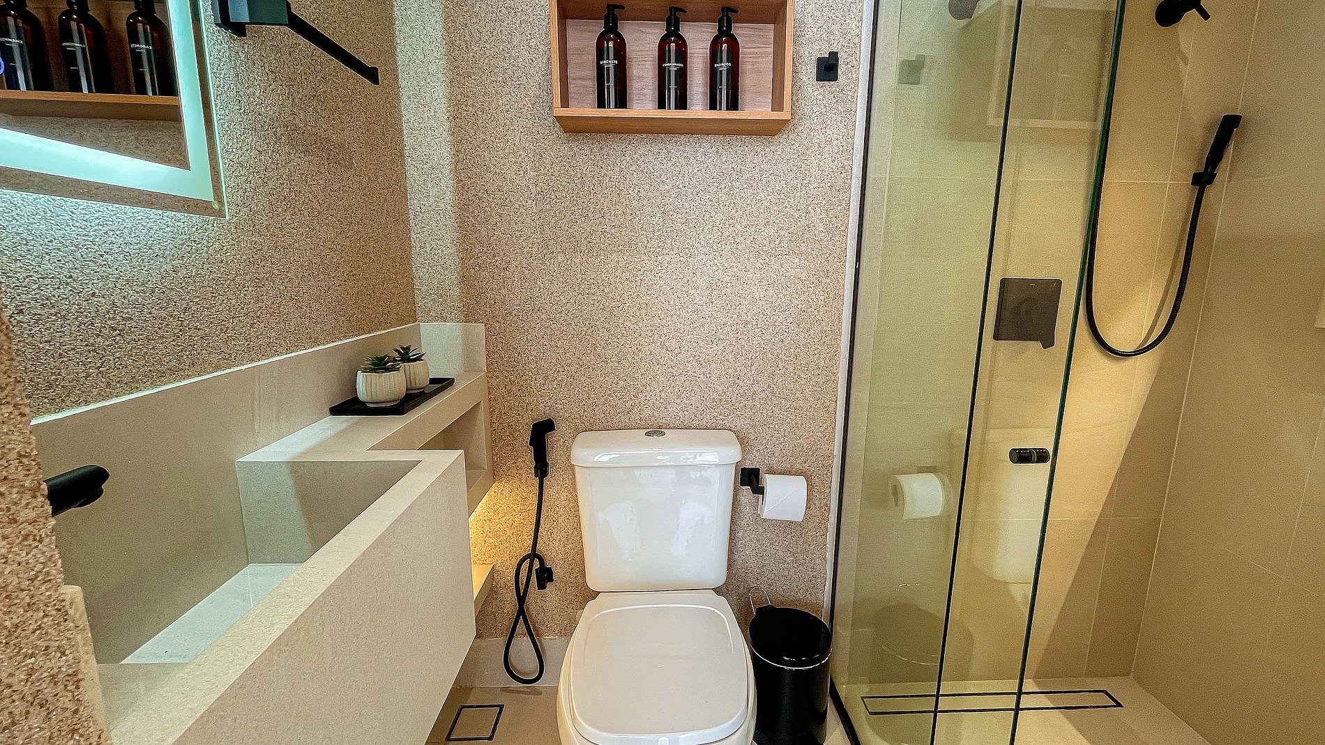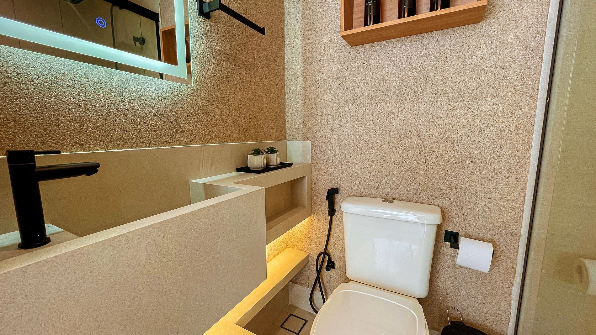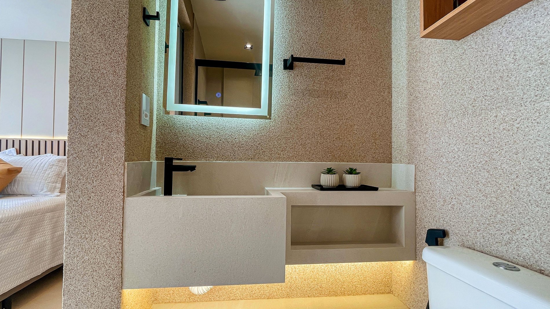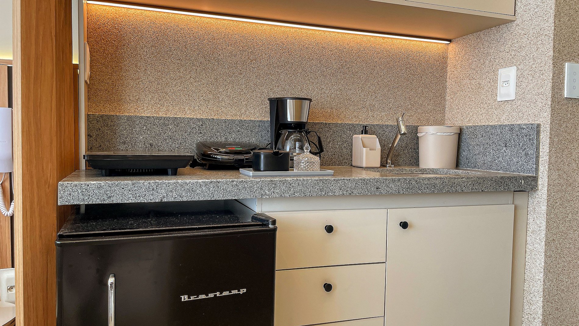 Com 28m², o apartamento acomoda confortavelmente até 2 pessoas em uma cama de casal e conta com uma agradável vista mar lateral, além de uma varanda perfeita para relaxar. A cozinha compacta é equipada com micro-ondas, frigobar, cafeteira e utensílios essenciais para pequenas refeições, e o espaço ainda dispõe de Smart TV para o seu entretenimento.