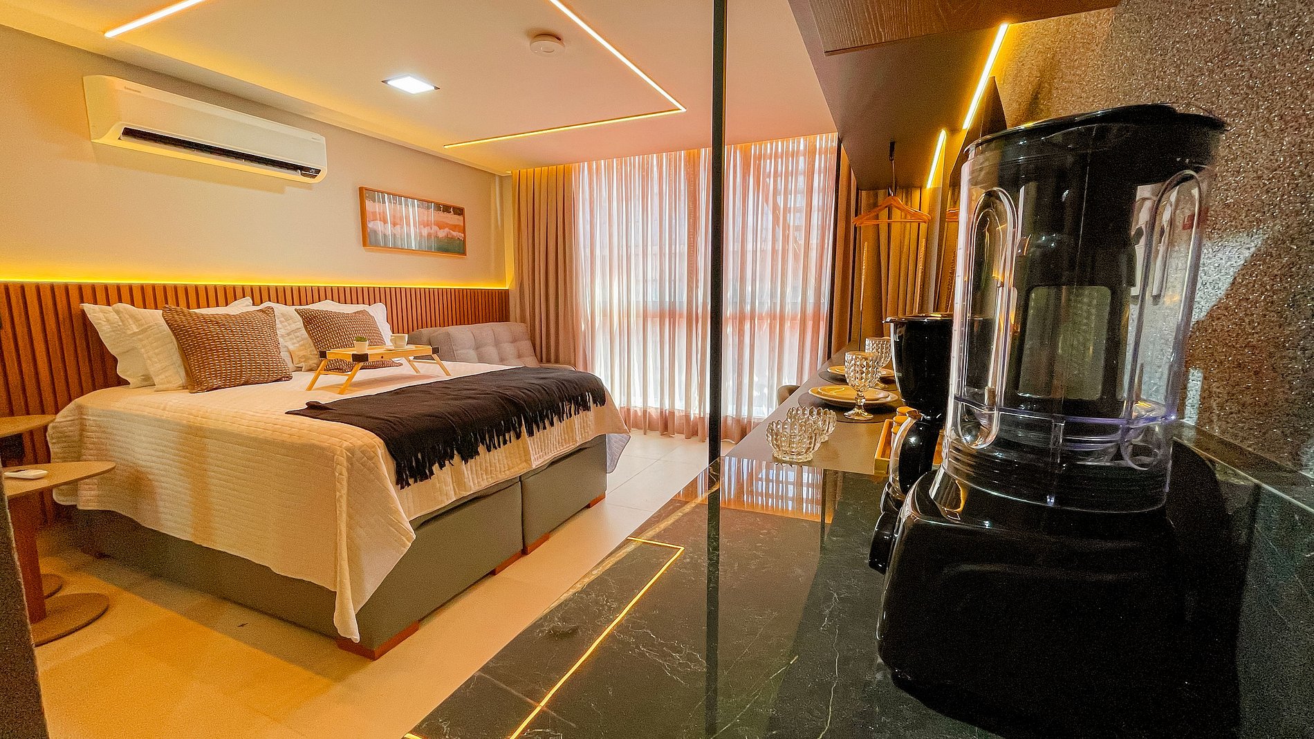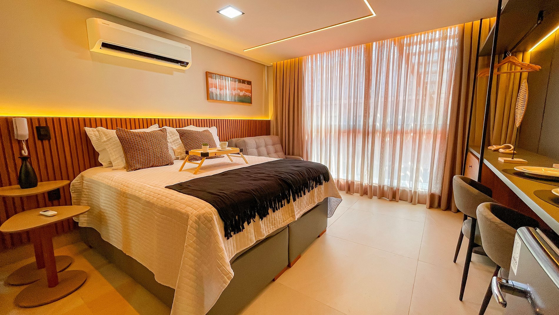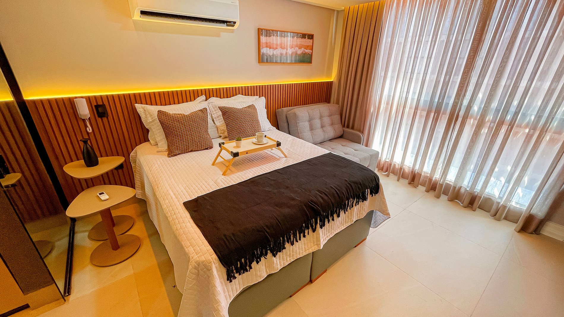O apartamento acomoda confortavelmente até 2 pessoas em uma cama de casal e conta ainda com um sofá-cama ideal para receber um terceiro hóspede. O espaço oferece uma agradável vista lateral para o mar, trazendo ainda mais tranquilidade à sua estadia.A cozinha compacta é equipada com micro-ondas, frigobar, cafeteira e utensílios essenciais para pequenas refeições, e o apartamento dispõe também de Smart TV para o seu entretenimento.Localizado no Jardim Oceania, pertinho da Praia do Bessa e de excelentes opções de restaurantes e comércio, o condomínio oferece piscina na cobertura, sauna e academia, tudo pensado para garantir praticidade, conforto e uma experiência encantadora durante sua estadia.
