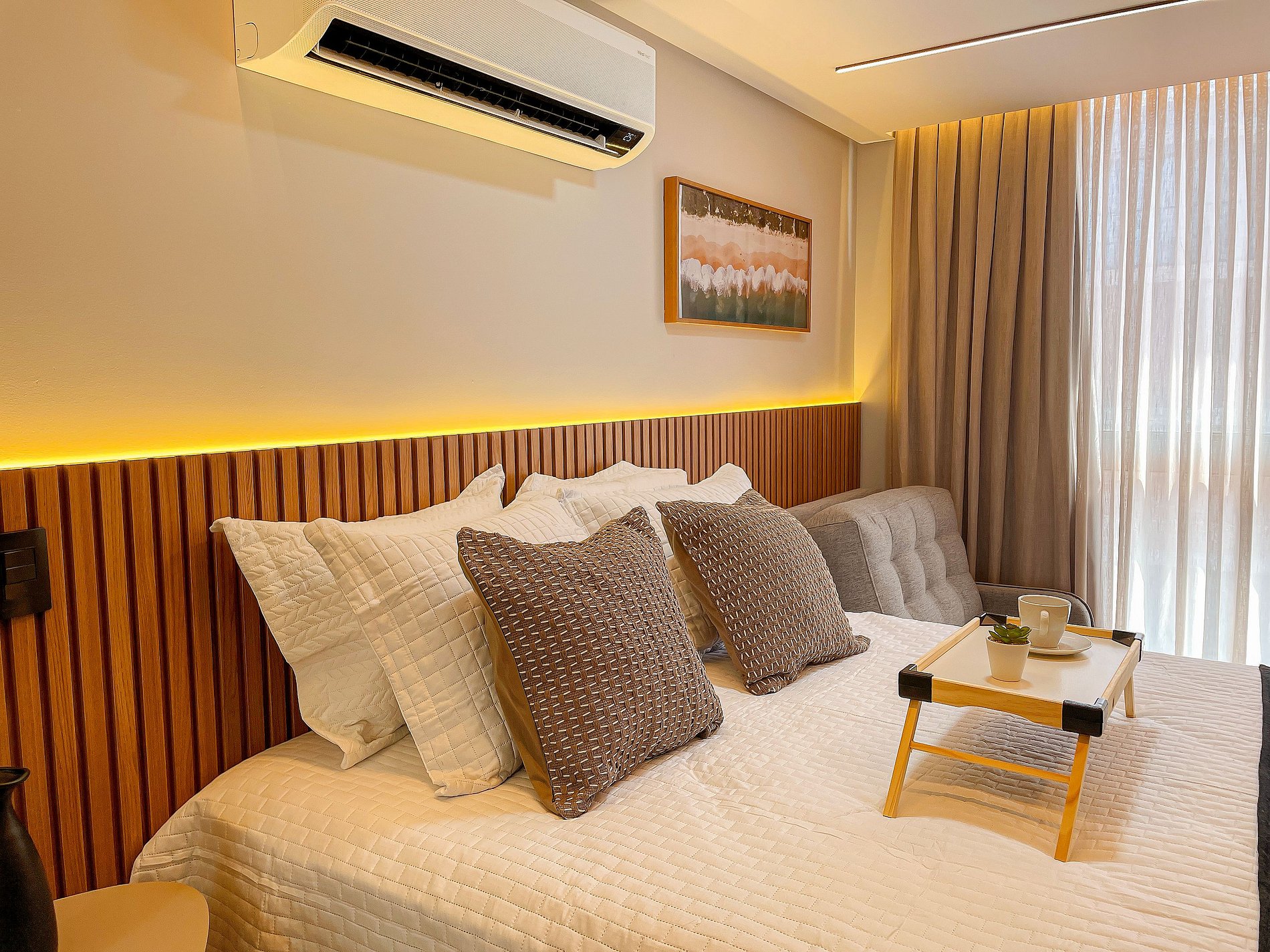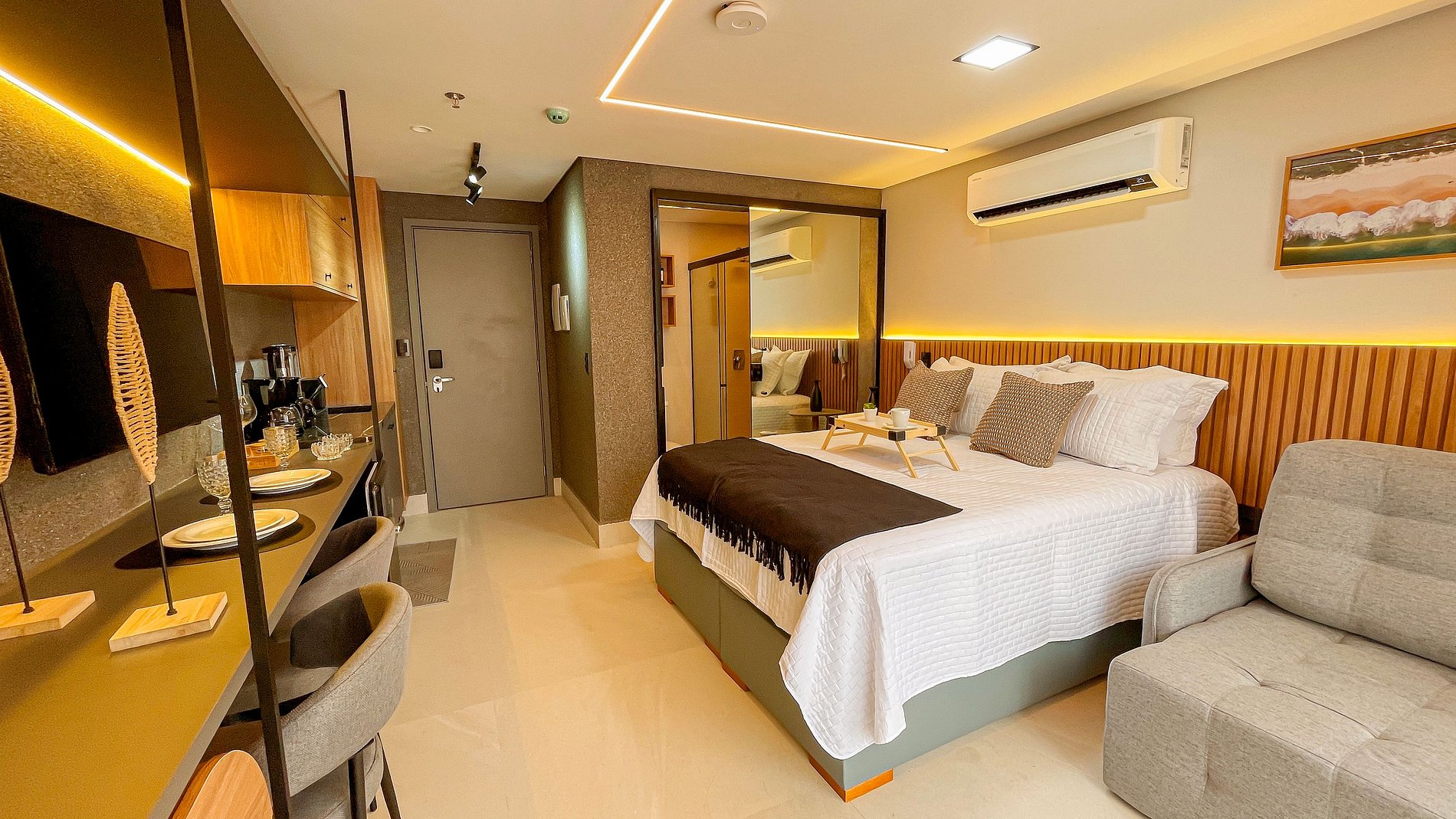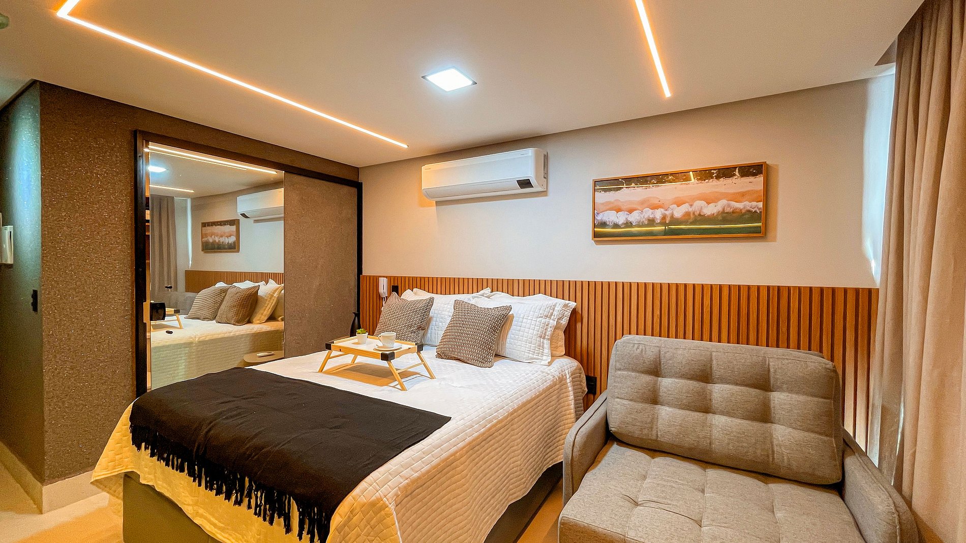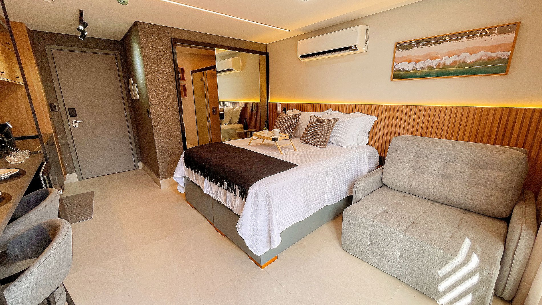 O apartamento acomoda até 2 pessoas em cama de casal e possui sofá-cama para um terceiro hóspede. Oferece vista lateral para o mar, cozinha compacta equipada e Smart TV. Localizado no Jardim Oceania, perto da Praia do Bessa e ótimos restaurantes, o condomínio conta com piscina na cobertura, sauna e academia, garantindo conforto e praticidade durante a estadia.