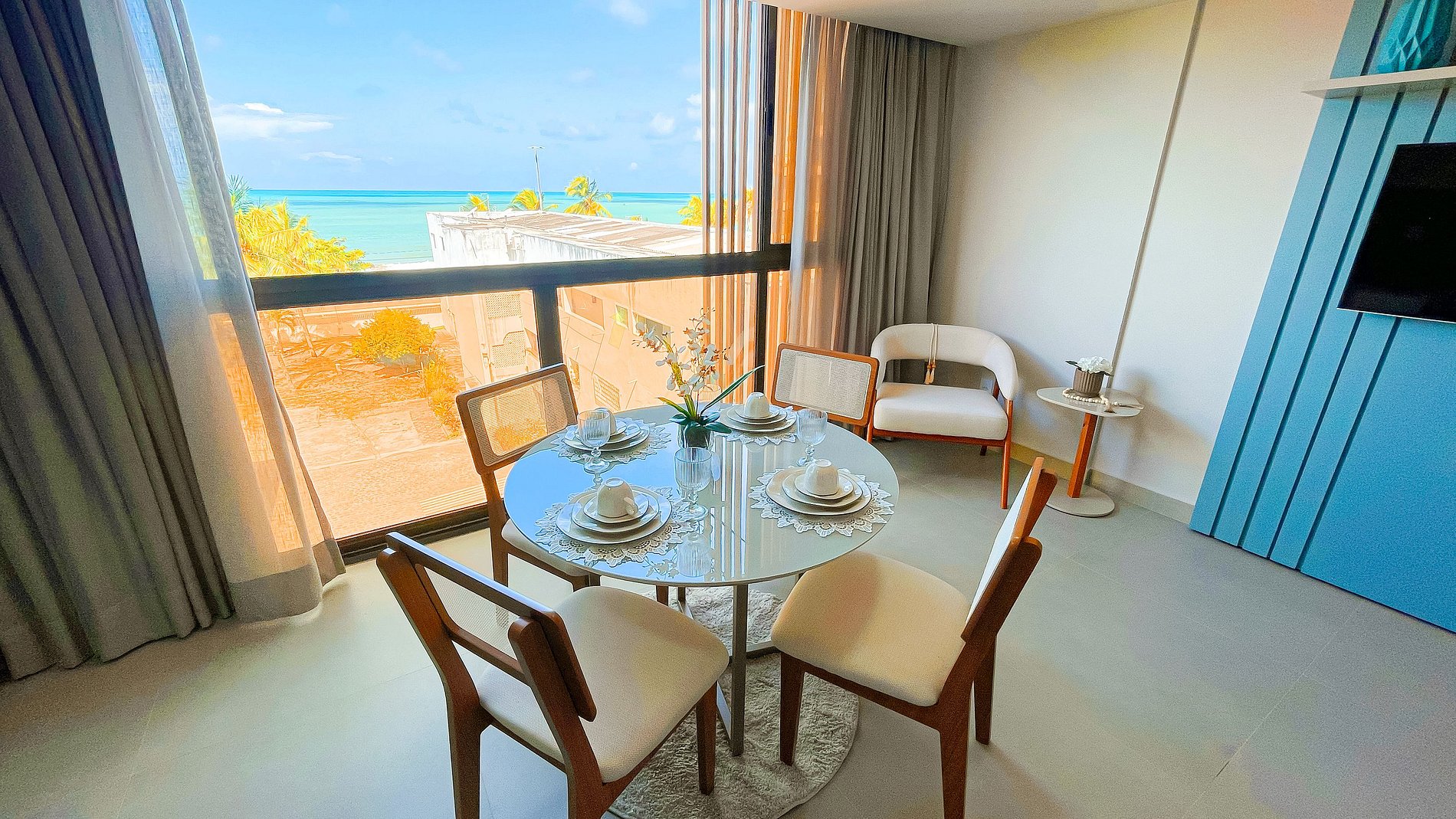 Flat de 43m² para até 4 hóspedes, com 2 camas de casal. Cozinha equipada com micro-ondas, geladeira, cafeteira, fogão e utensílios básicos. Possui mesa para refeições, ferro, secador, Smart TV e Wi-Fi. A 70m da orla, perto do Largo de Tambaú, Mercado de Artesanato, Piscinas do Seixas e Farol do Cabo Branco. Prédio com piscina, estacionamento e lavanderia.