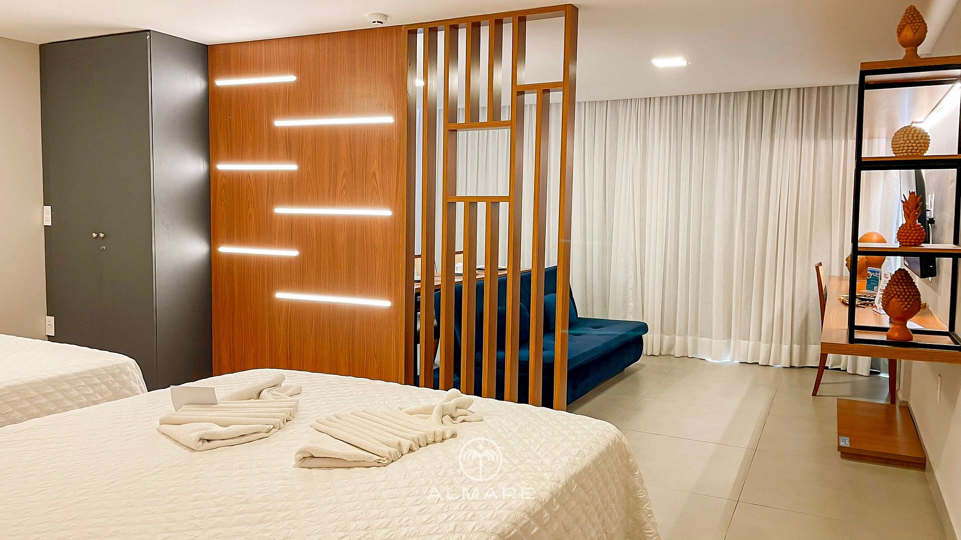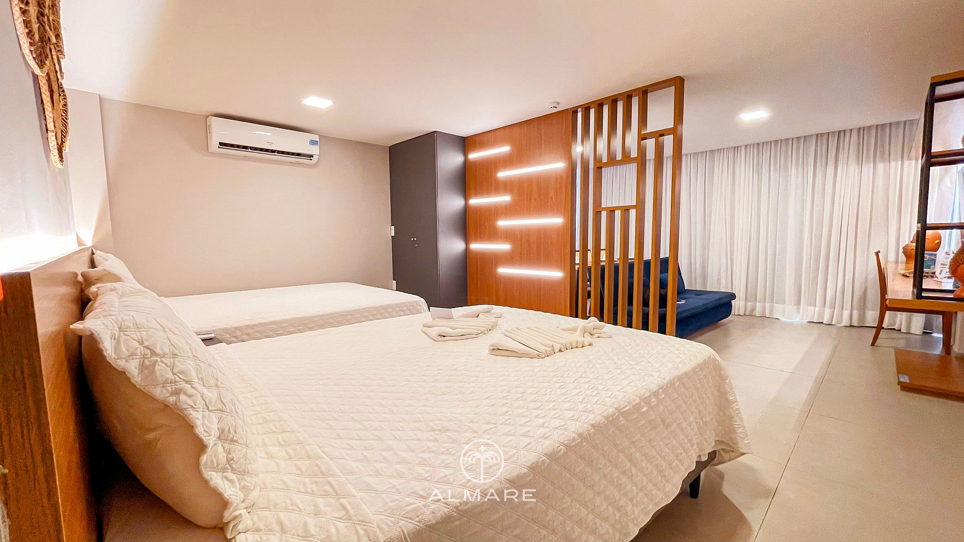 Este flat espaçoso e confortável tem uma linda vista para o mar. Acomoda os hóspedes em 02 camas queen e um sofá cama. Disponibilizamos enxoval de cama, com lençóis e toalhas, bem como alguns utensílios domésticos para pequenas refeições ou lanches no conforto do seu espaço. Como cortesia a Almare Flats coloca alguns amenities no quarto e fornece um kit praia (cadeira/guarda-sol/cooler) mediante disponibilidade. O prédio conta ainda com uma piscina na cobertura com borda infinita e uma vista linda da Praia do Cabo Branco. O estacionamento é gratuito e seguro. A lavanderia é comum a todos os hóspedes e moradores e pode ser utilizada mediante pagamento de taxa. Caso tenha um bebê para acomodar, também é possível solicitar um berço, fornecemos conforme disponibilidade.