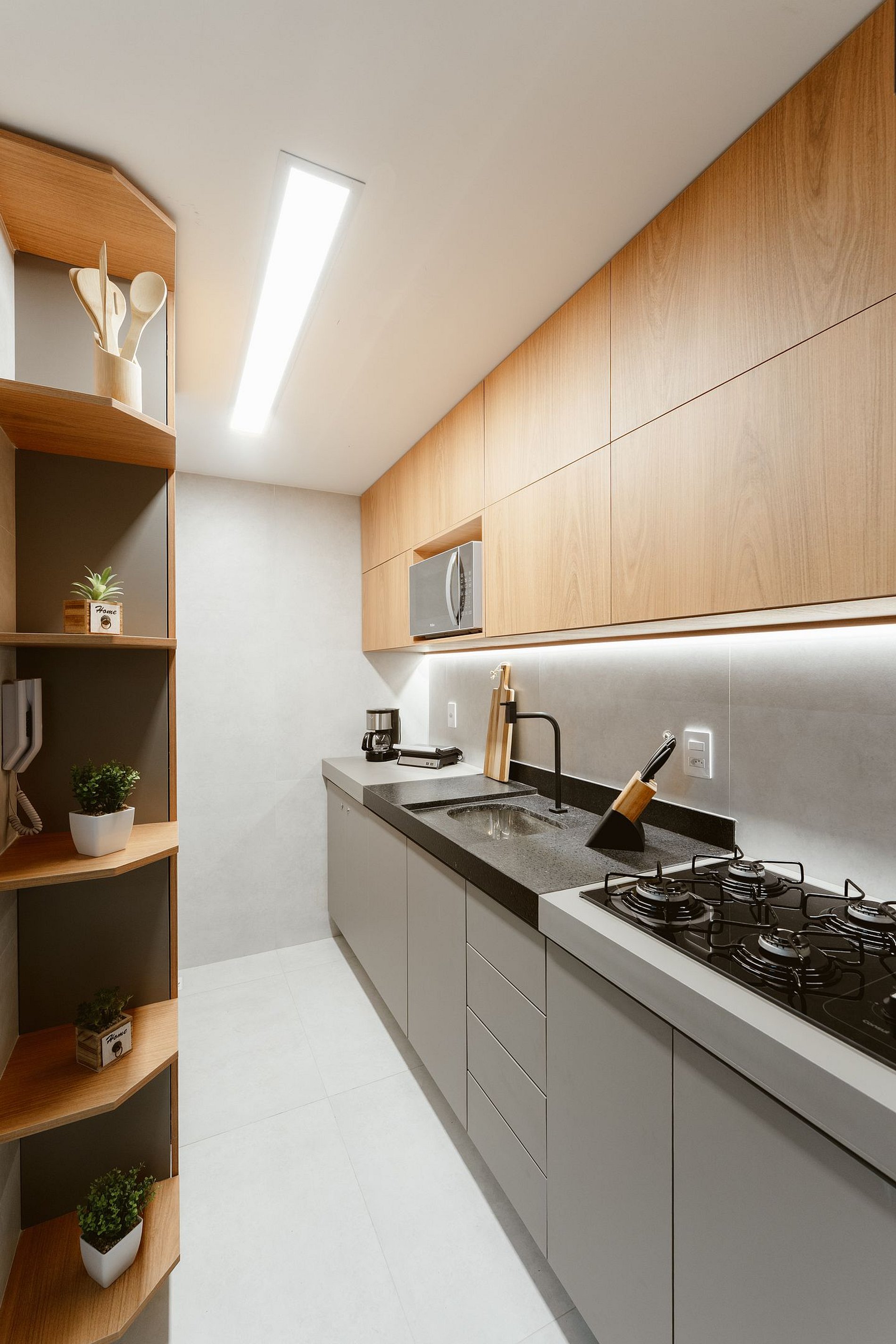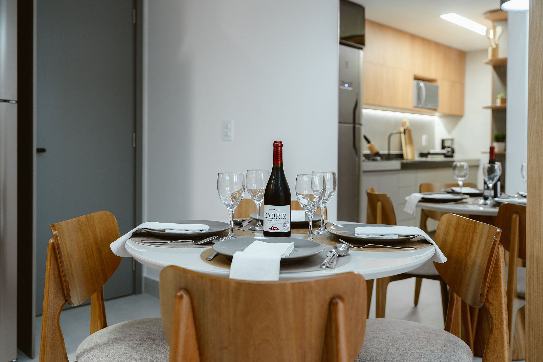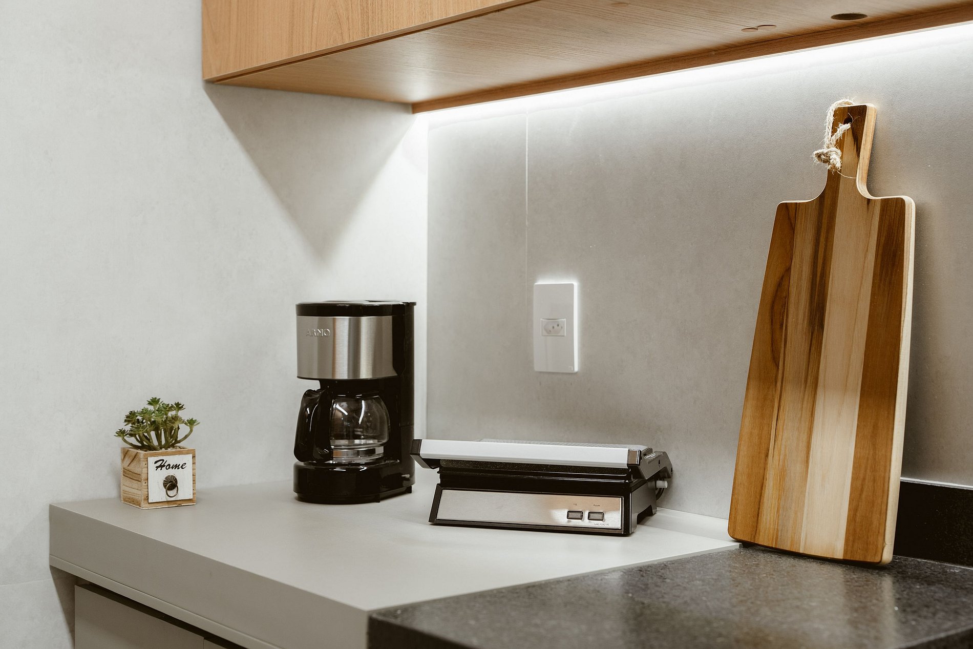 A cozinha é funcional e equipada com fogão de 4 bocas, geladeira, cafeteira, sanduicheira e utensílios básicos para pequenas refeições. Disponibilizamos enxoval completo de cama e banho, além de Wi-Fi e Smart TV para maior comodidade.