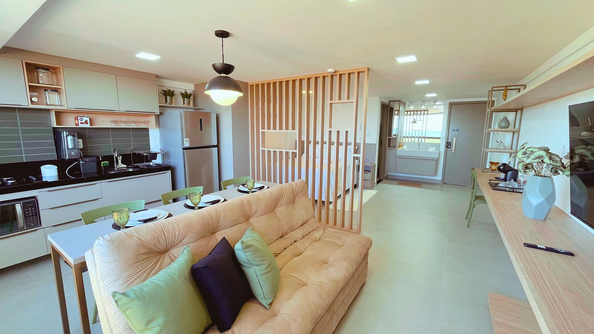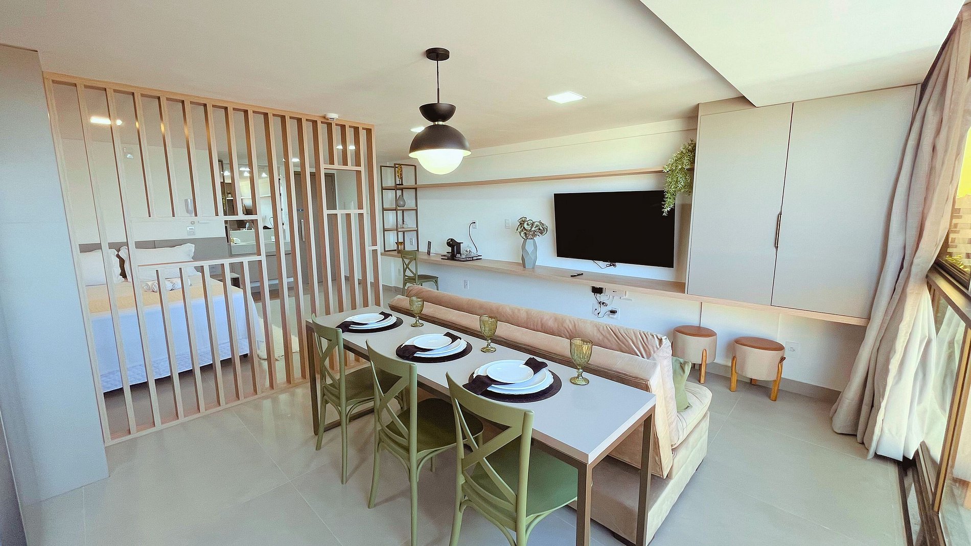 Apartamento com ambiente único, bem decorado, confortável e com uma incrível vista para o mar. Disponibilizamos enxoval de cama, com lençóis e toalhas, bem como alguns utensílios domésticos para pequenas refeições no conforto do seu espaço. Como cortesia a Almare Flats coloca alguns amenities no quarto e fornece um kit praia (cadeira/guarda-sol/cooler) mediante disponibilidade. O prédio conta ainda com uma piscina na cobertura com borda infinita e uma vista linda da Praia do Cabo Branco. O estacionamento é gratuito e seguro. A lavanderia é comum a todos os hóspedes e moradores e pode ser utilizada mediante pagamento de taxa. Caso tenha um bebê para acomodar, também é possível solicitar um berço, fornecemos conforme disponibilidade.