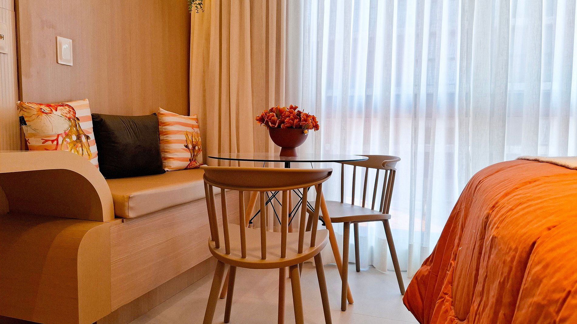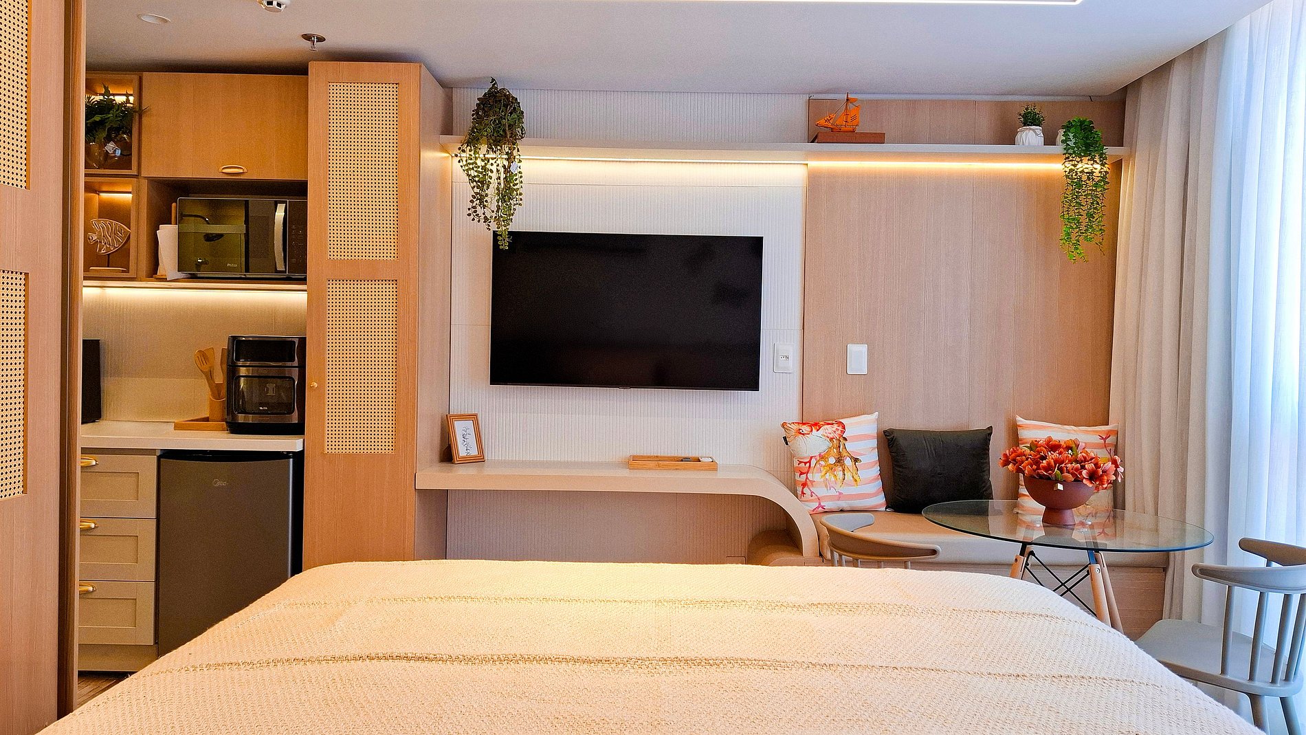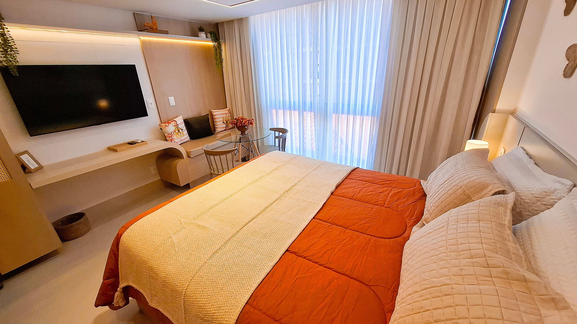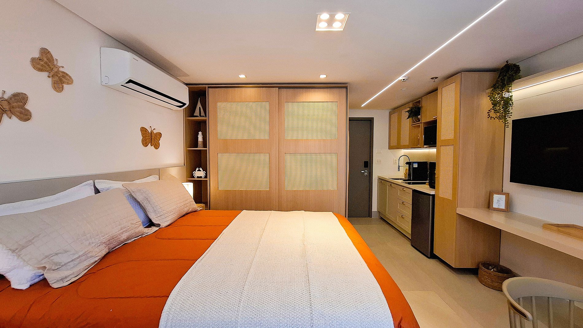 O apartamento dispõe de uma confortável cama queen e conta com uma cozinha compacta, equipada com micro-ondas, frigobar, cafeteira, fogão, liquidificador, filtro de água e utensílios essenciais para sua estadia. Além disso, oferece Smart TV para o seu entretenimento.