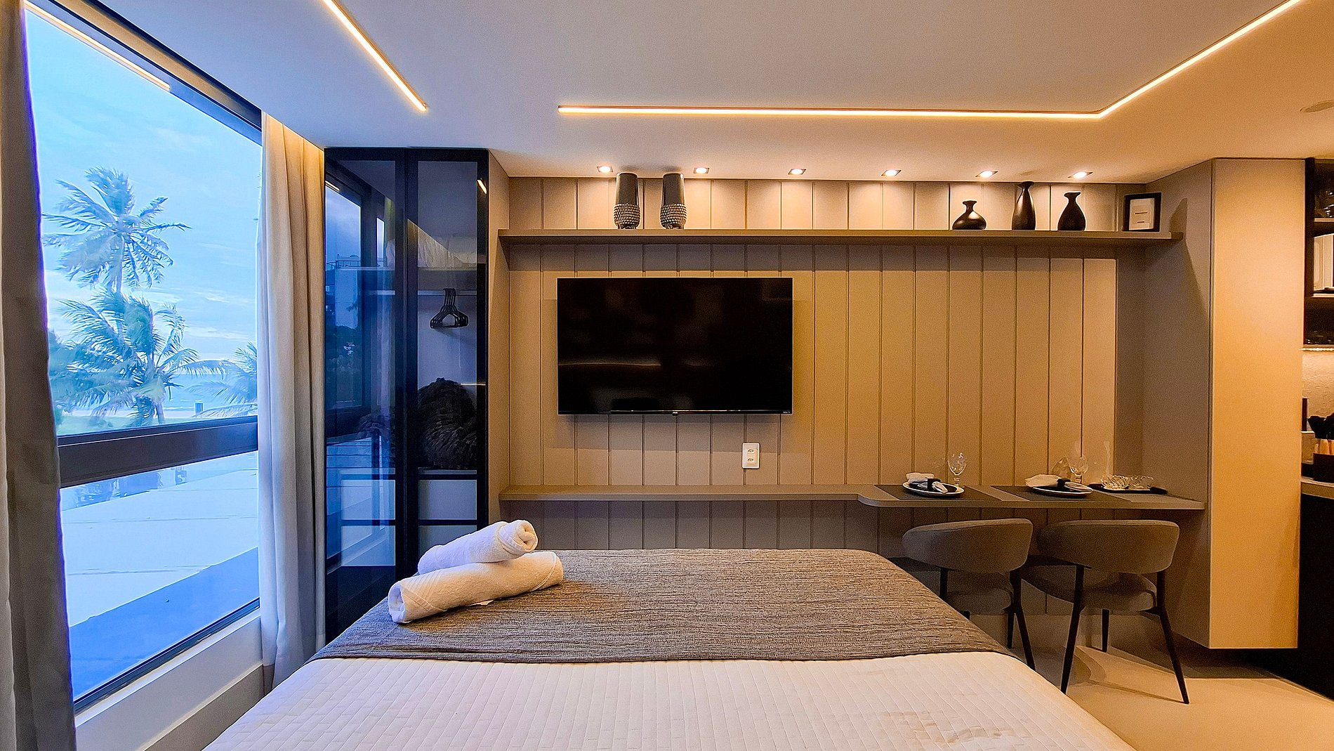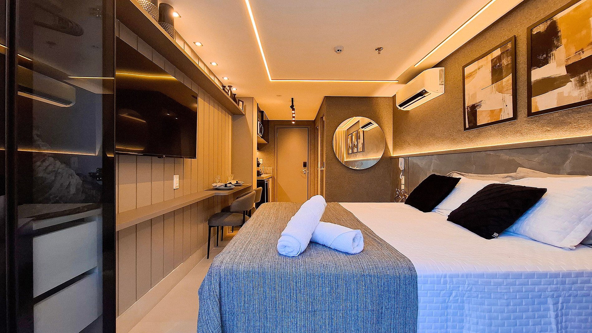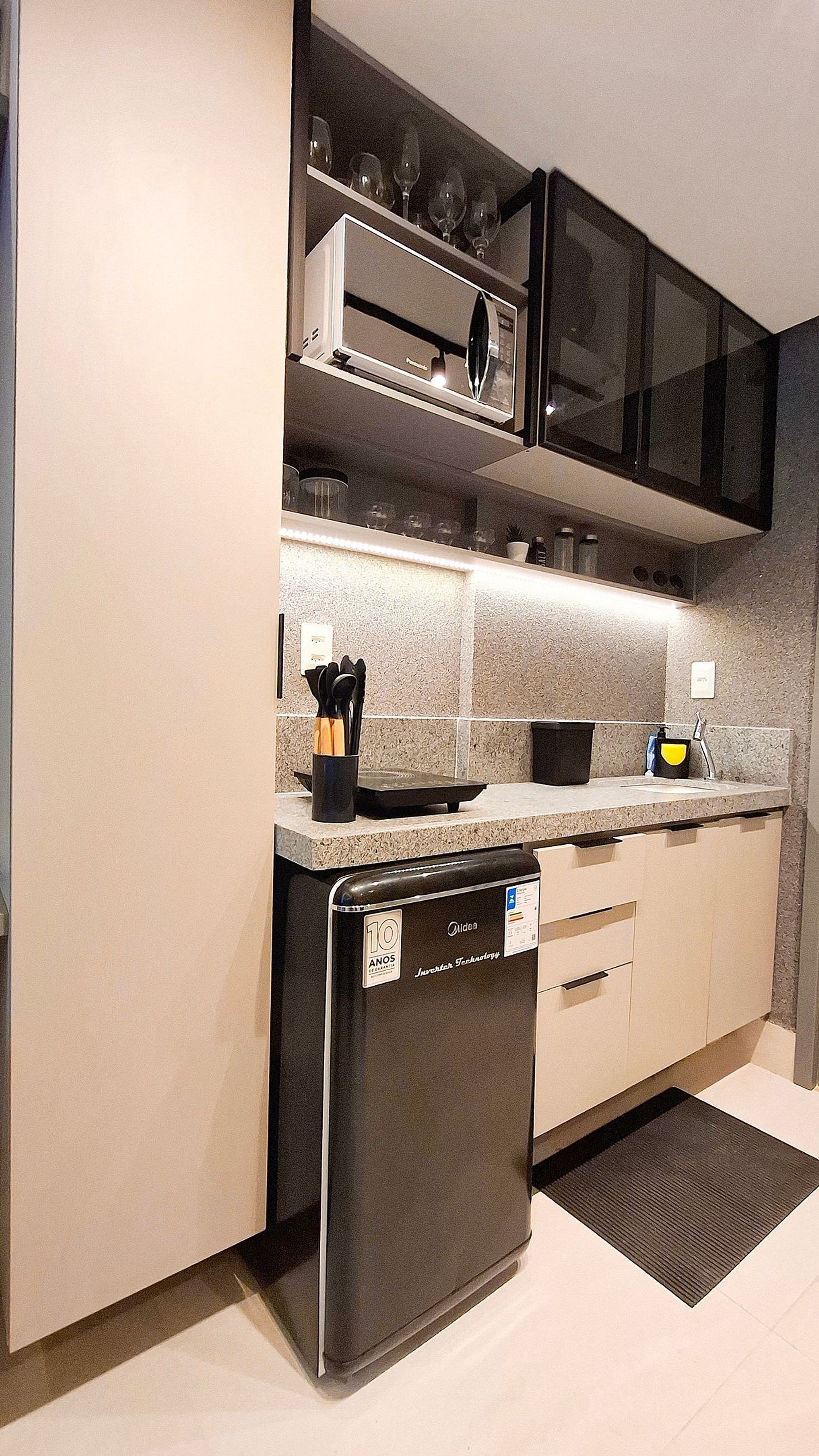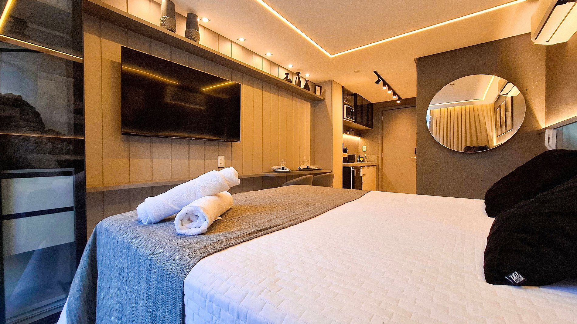 A cozinha é compacta e bem equipada, com micro-ondas, frigobar, cafeteira, sanduicheira, fogão de duas bocas, liquidificador, secador de cabelo e utensílios essenciais para o dia a dia. Para momentos de descanso, o espaço também dispõe de Smart TV para seu entretenimento.