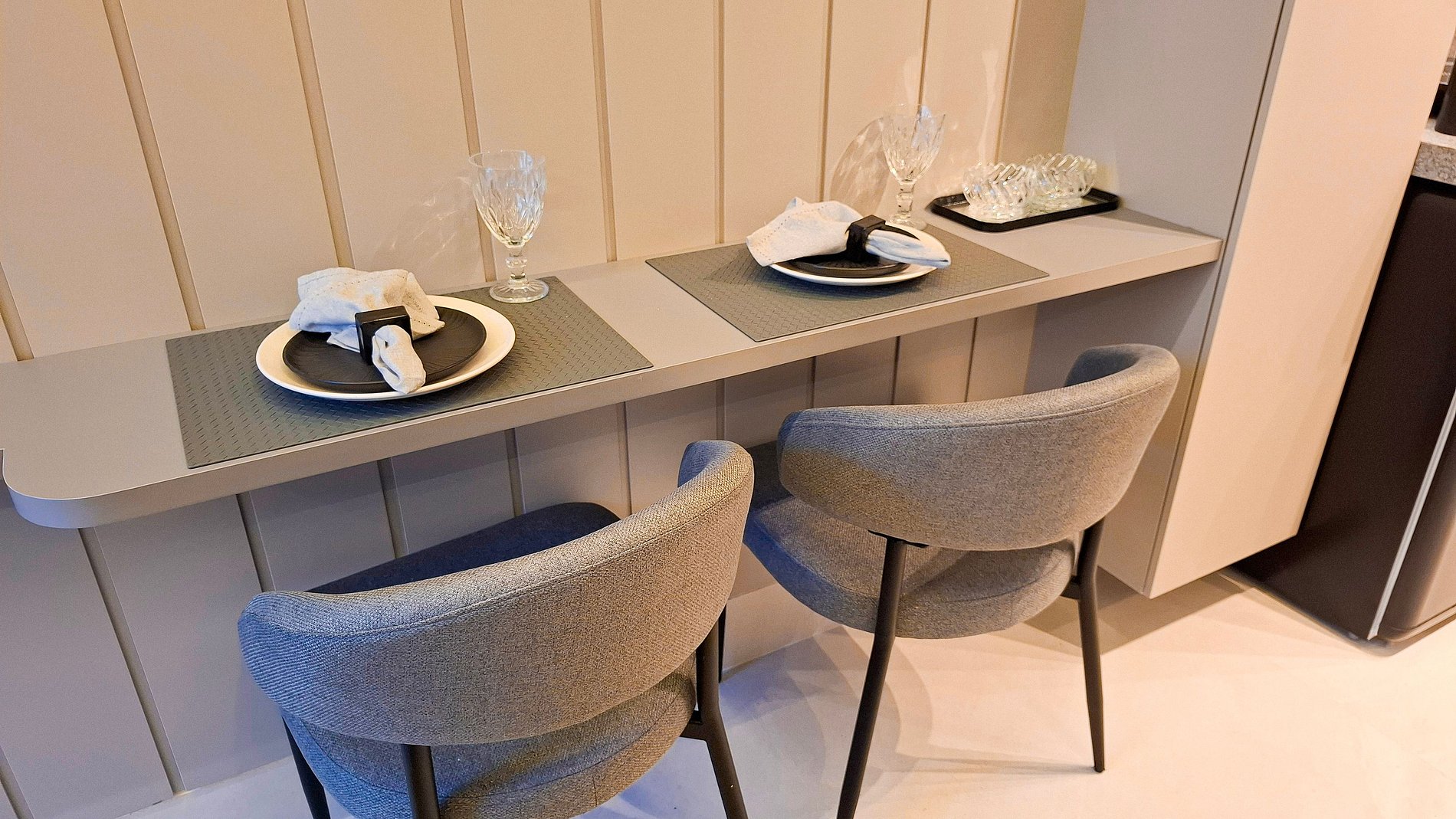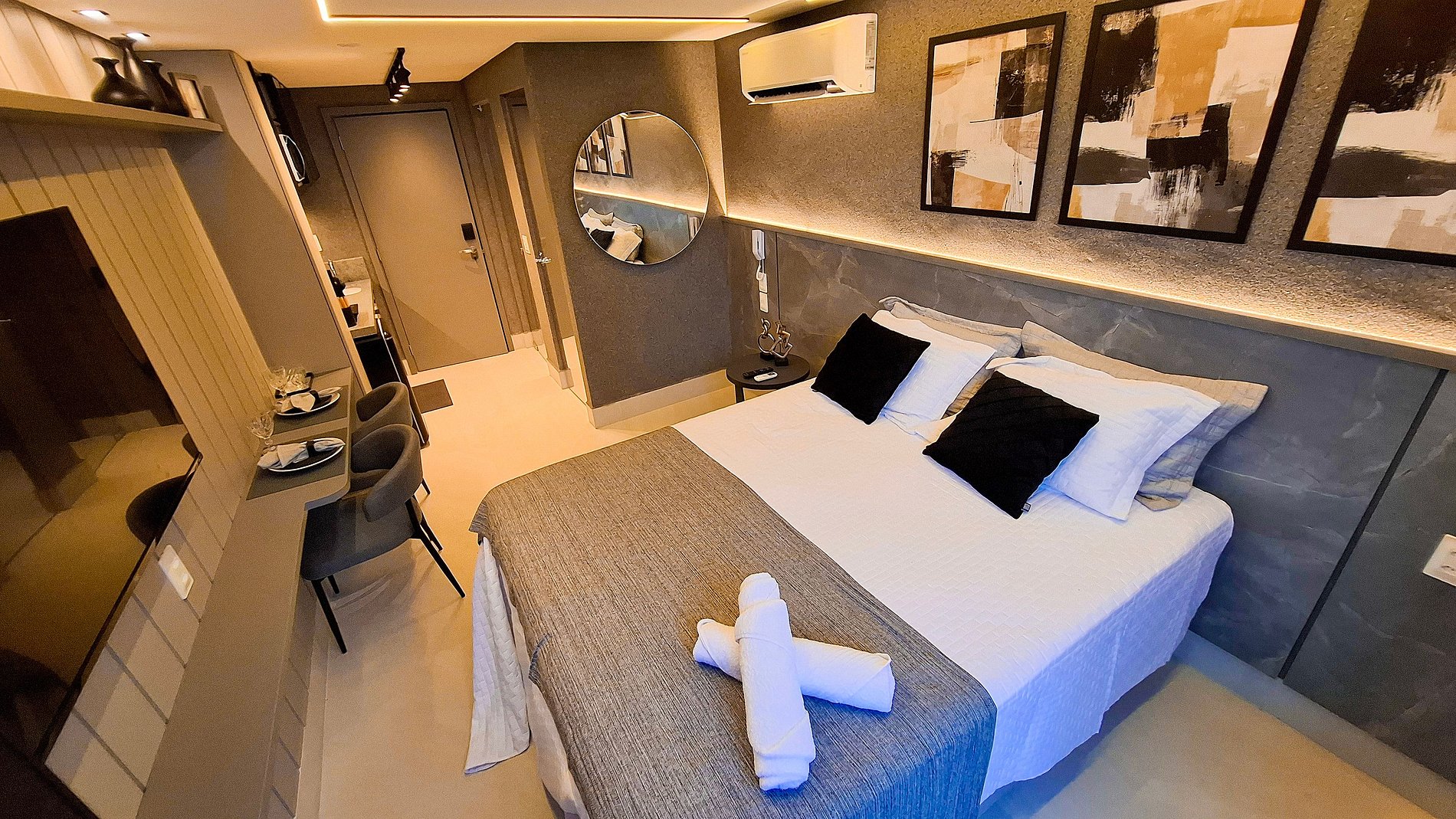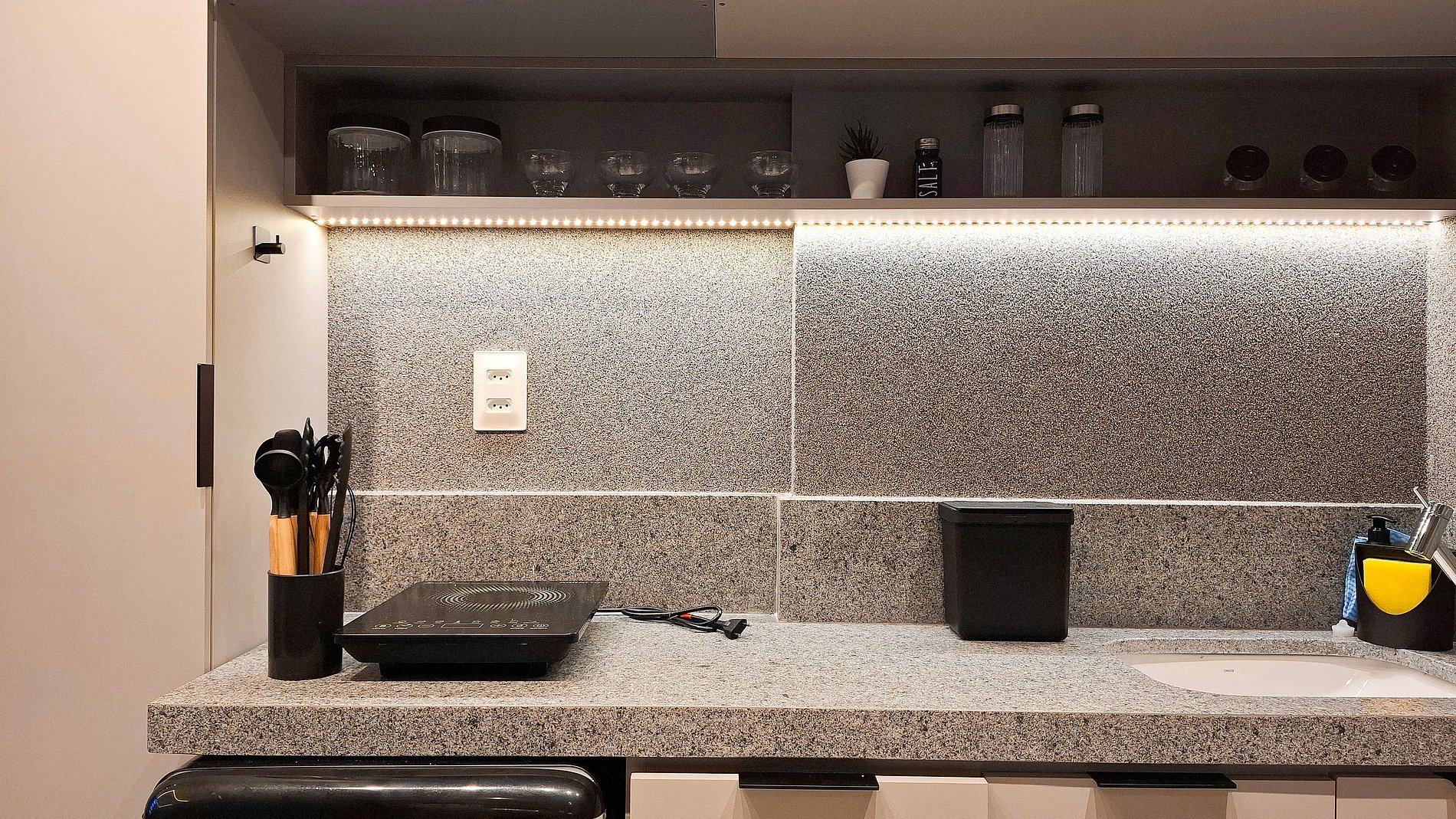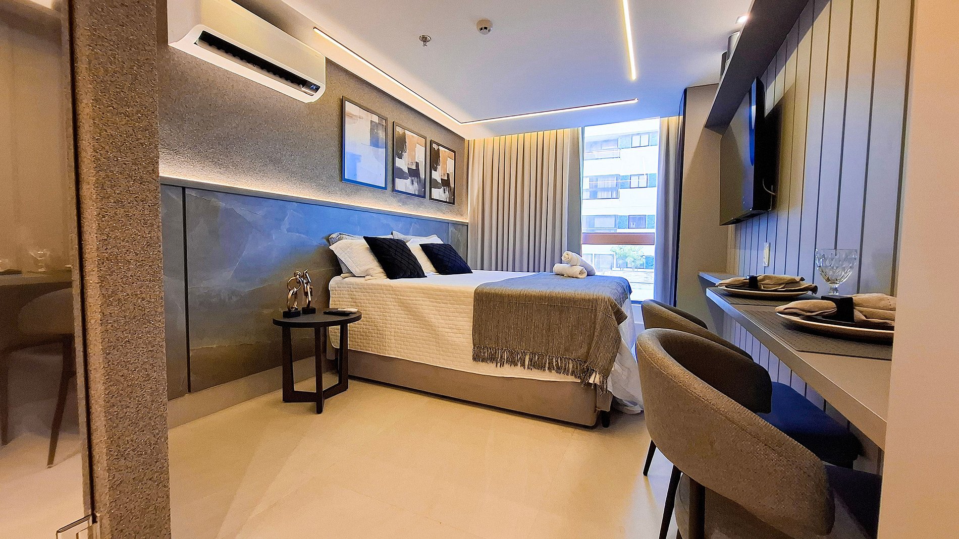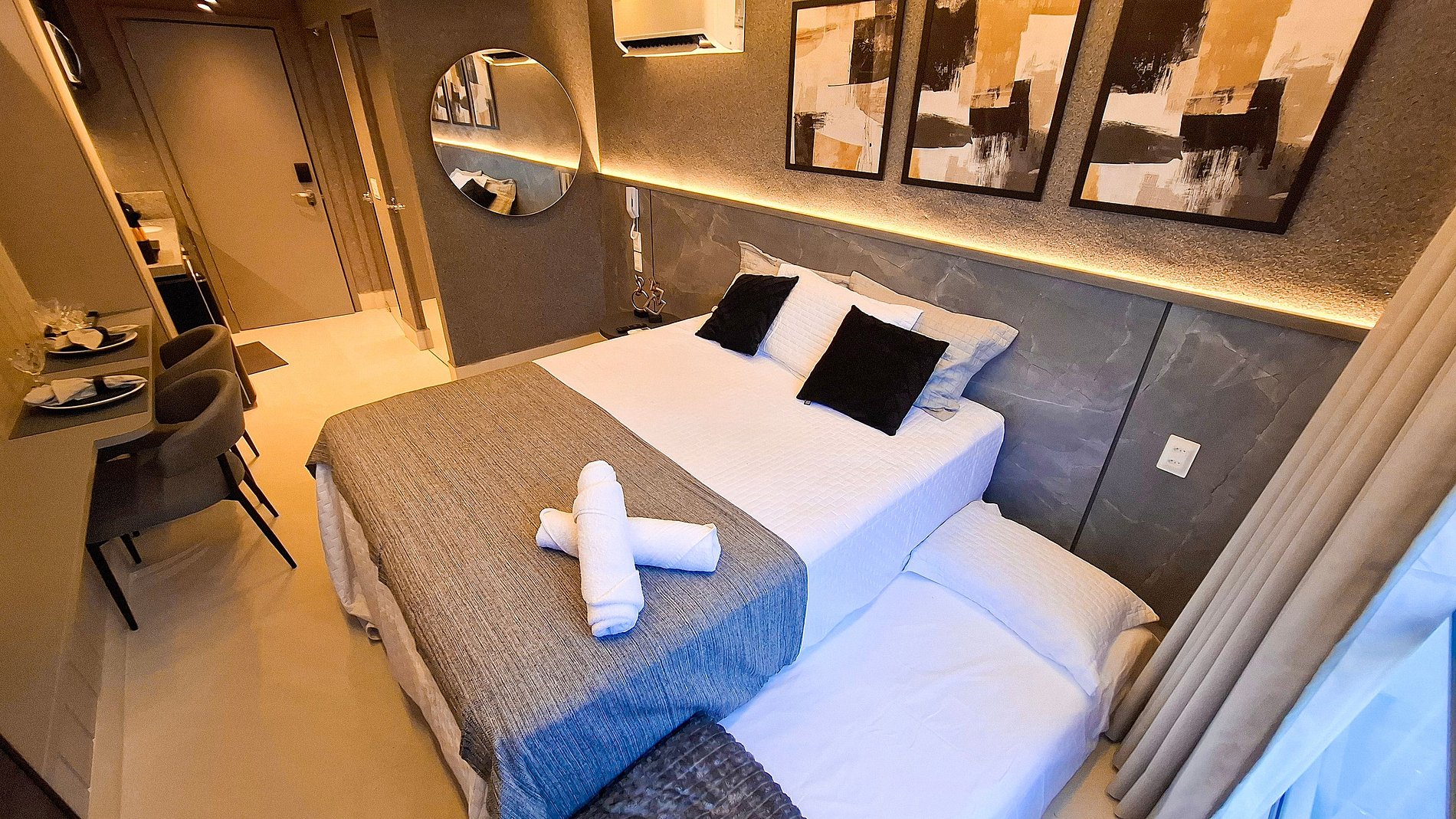 A cozinha é compacta e bem equipada, com micro-ondas, frigobar, cafeteira, sanduicheira, fogão de duas bocas, liquidificador, secador de cabelo e utensílios essenciais para o dia a dia. Para momentos de descanso, o espaço também dispõe de Smart TV para seu entretenimento.