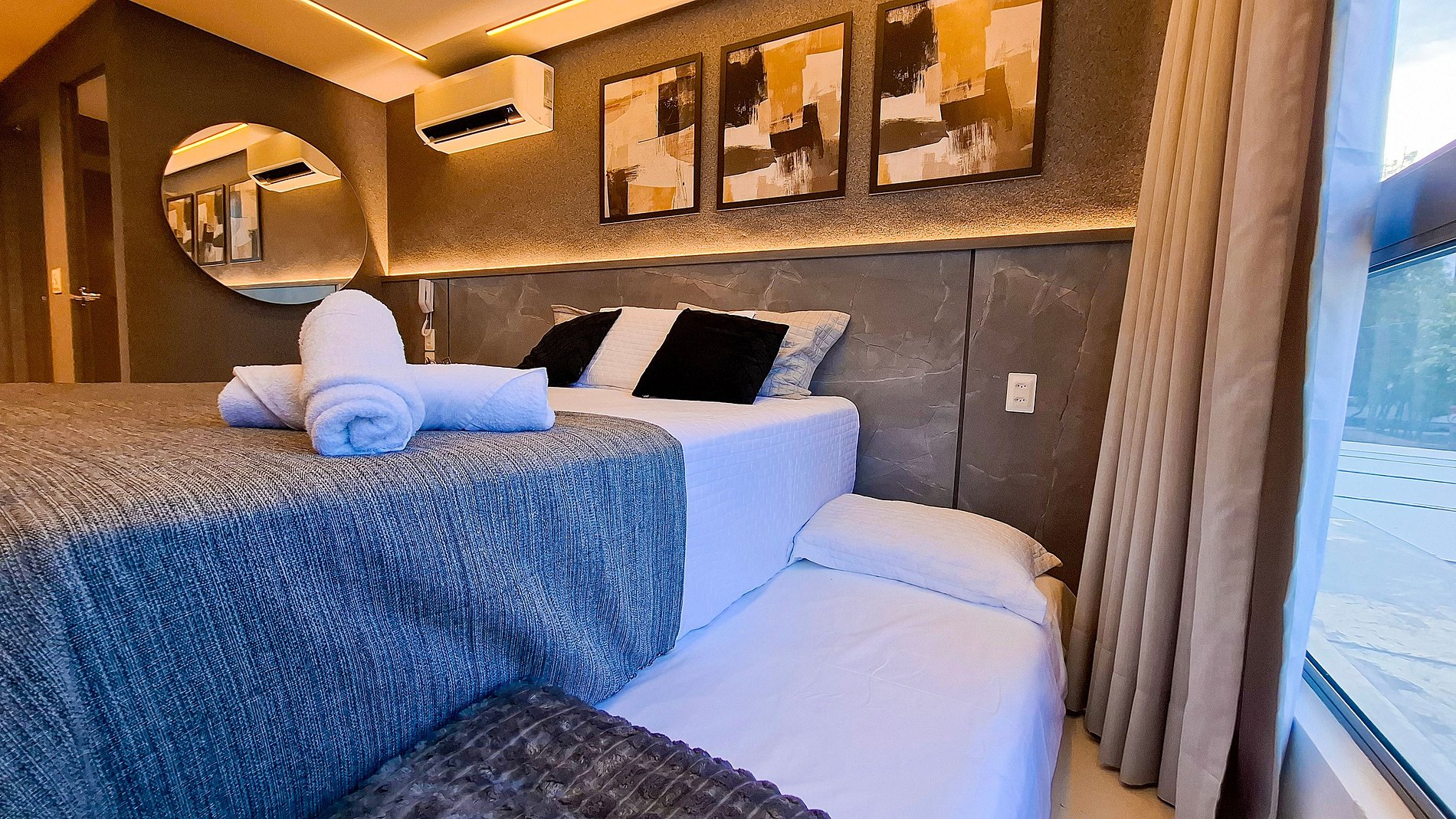 O apartamento foi preparado para oferecer conforto e praticidade durante sua estadia. Possui uma cama queen e duas camas auxiliares de solteiro, acomodando até 2 adultos e 2 crianças. A cozinha é compacta e funcional, equipada com micro-ondas, frigobar, cafeteira, fogão de uma boca e utensílios essenciais. O espaço também conta com Smart TV para seu entretenimento.