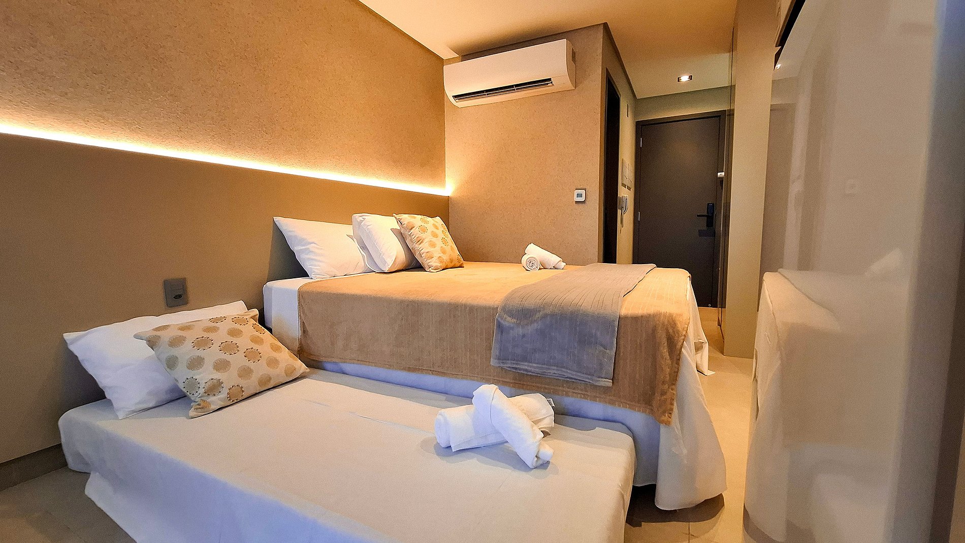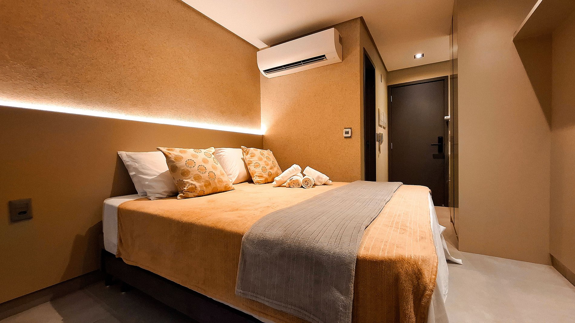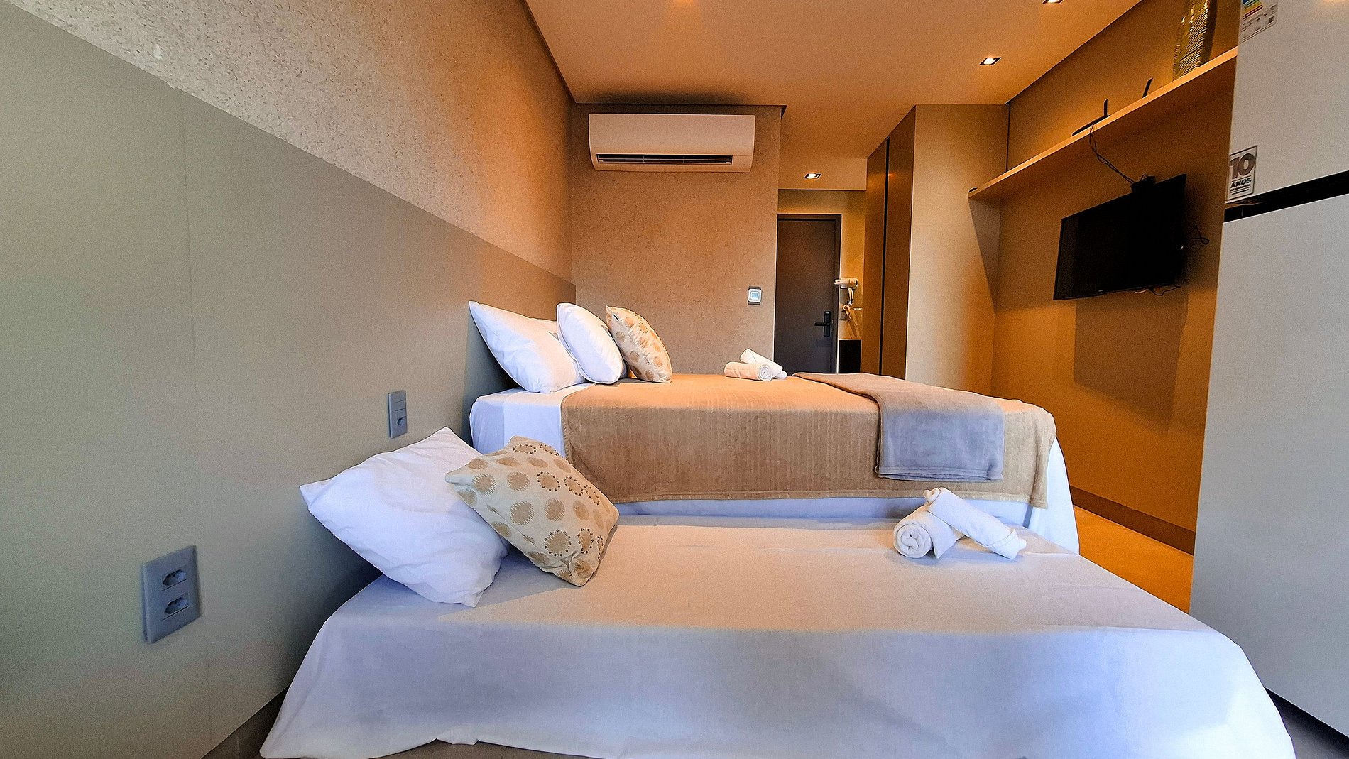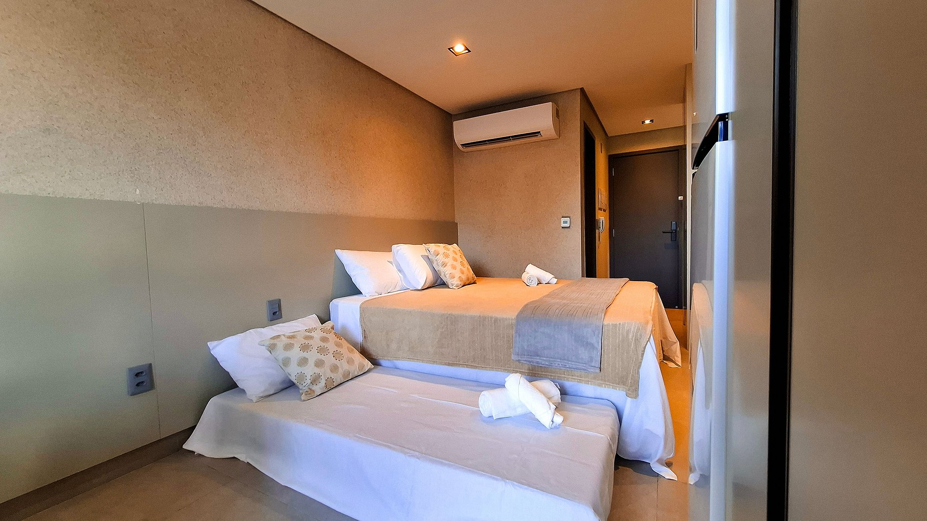 O apartamento é aconchegante e funcional, acomodando confortavelmente até 03 hóspedes, com uma cama queen e uma cama auxiliar.