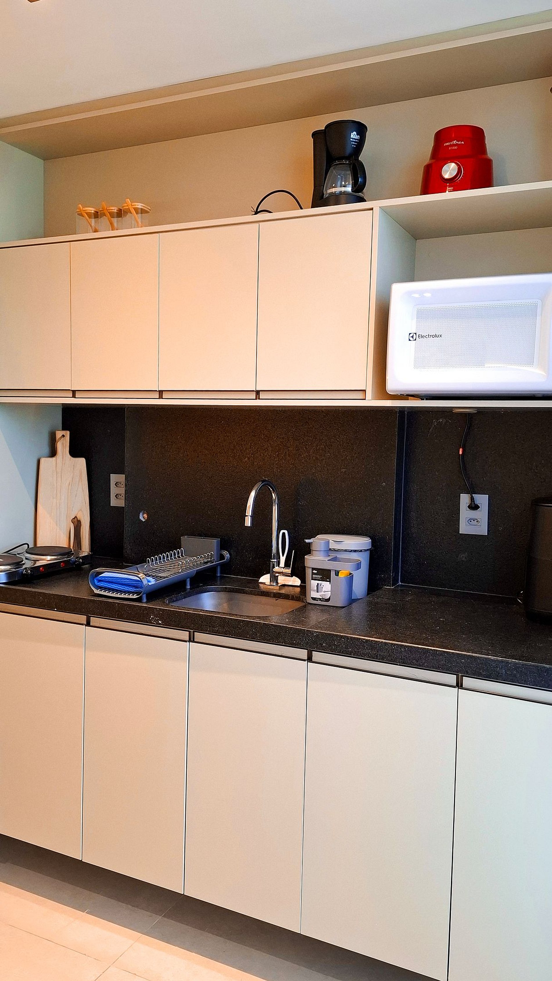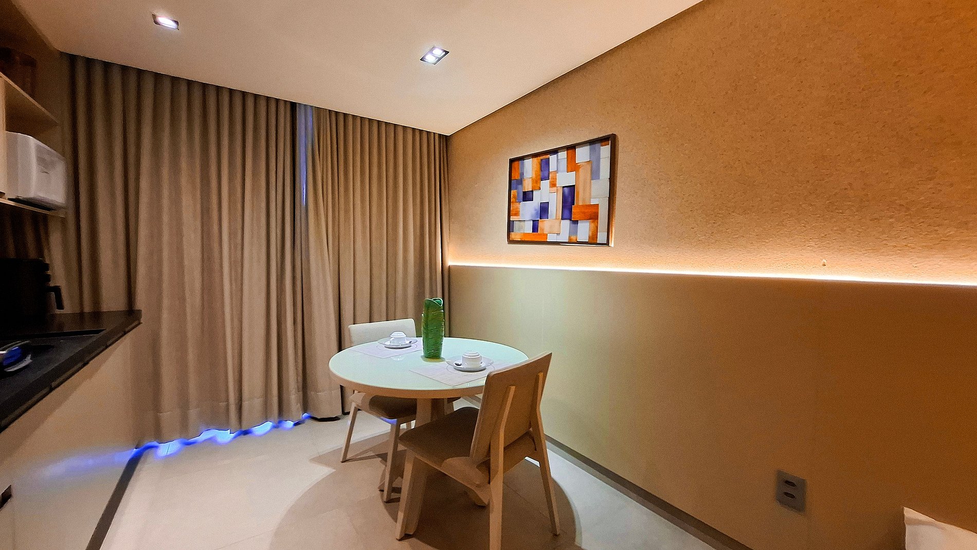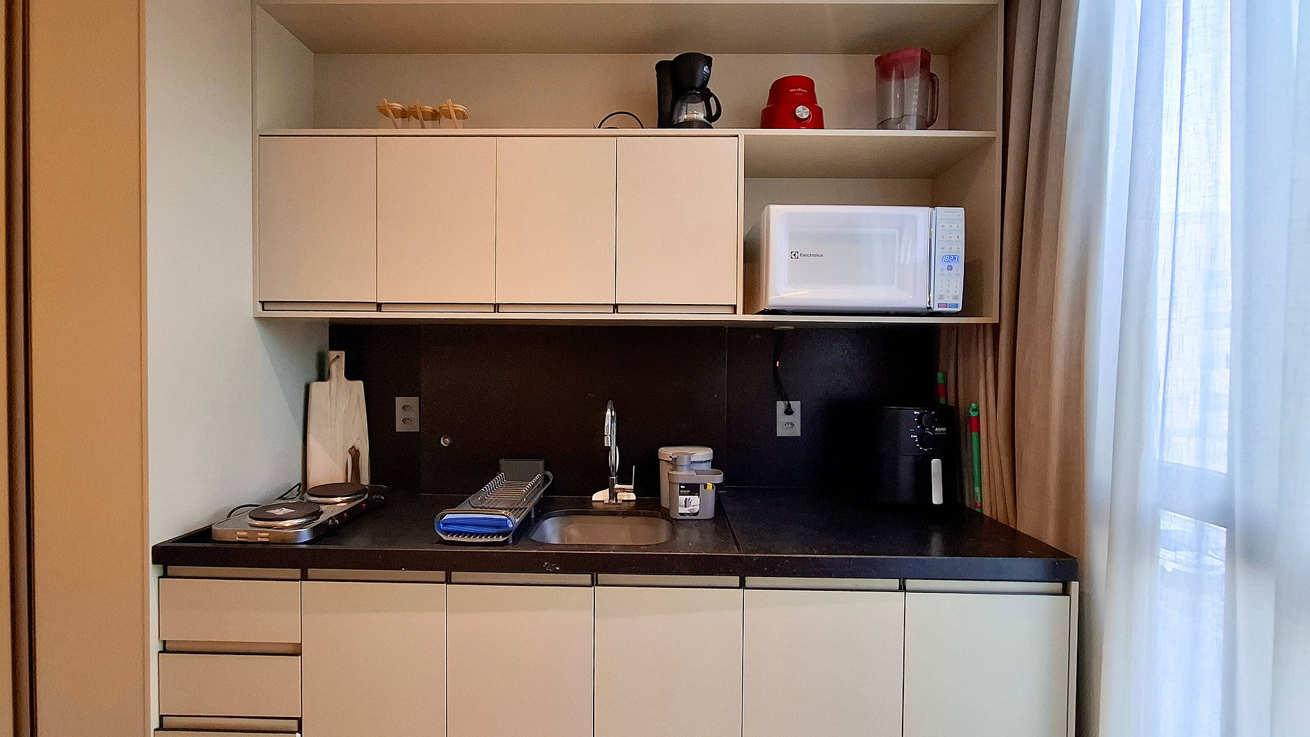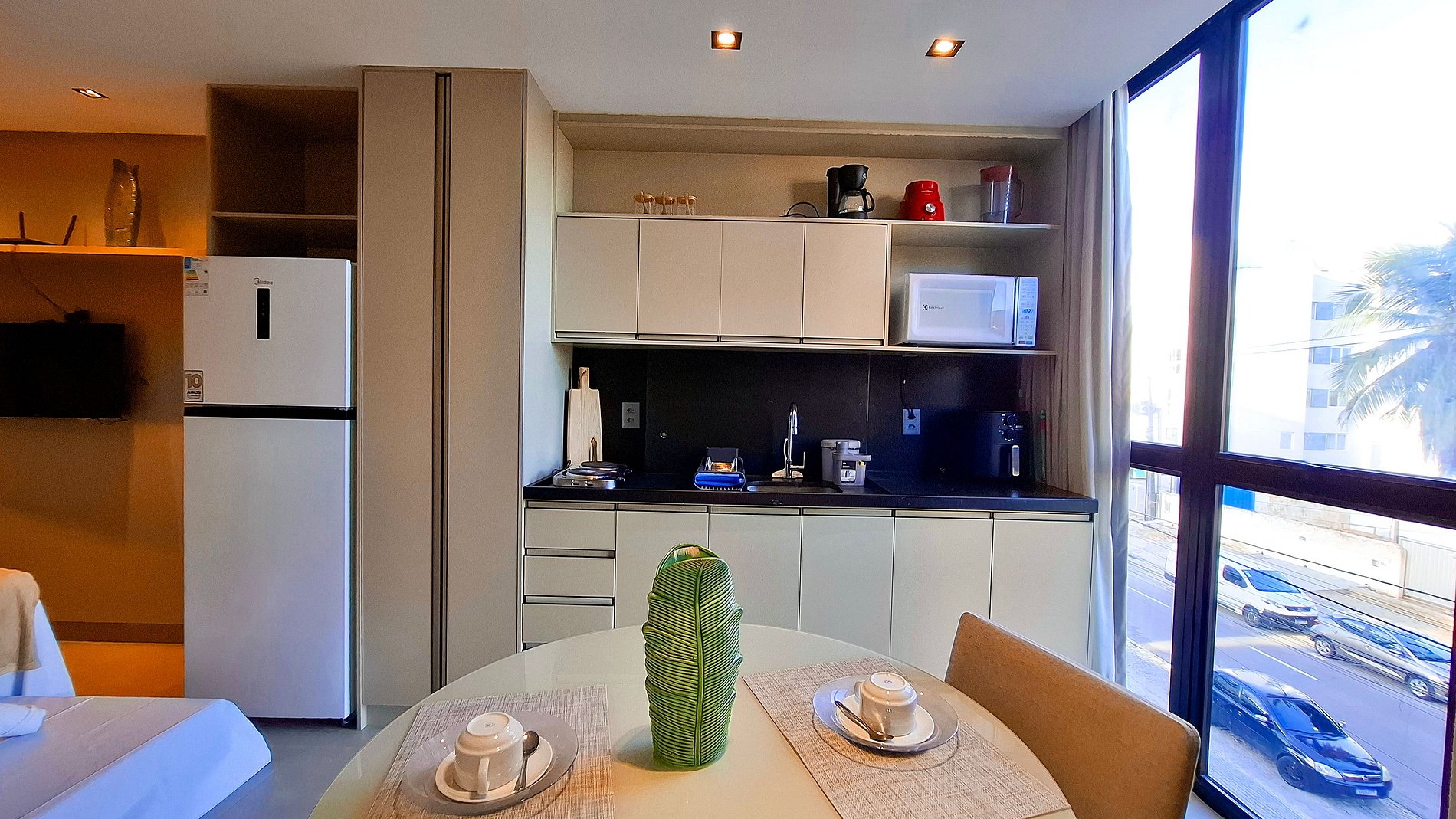 É ideal para quem busca uma estadia prática e confortável em João Pessoa. A unidade conta com uma cozinha compacta e bem equipada, incluindo cafeteira, sanduicheira, micro-ondas, liquidificador, airfryer, geladeira e fogão de duas bocas, além de Smart TV para o seu entretenimento.