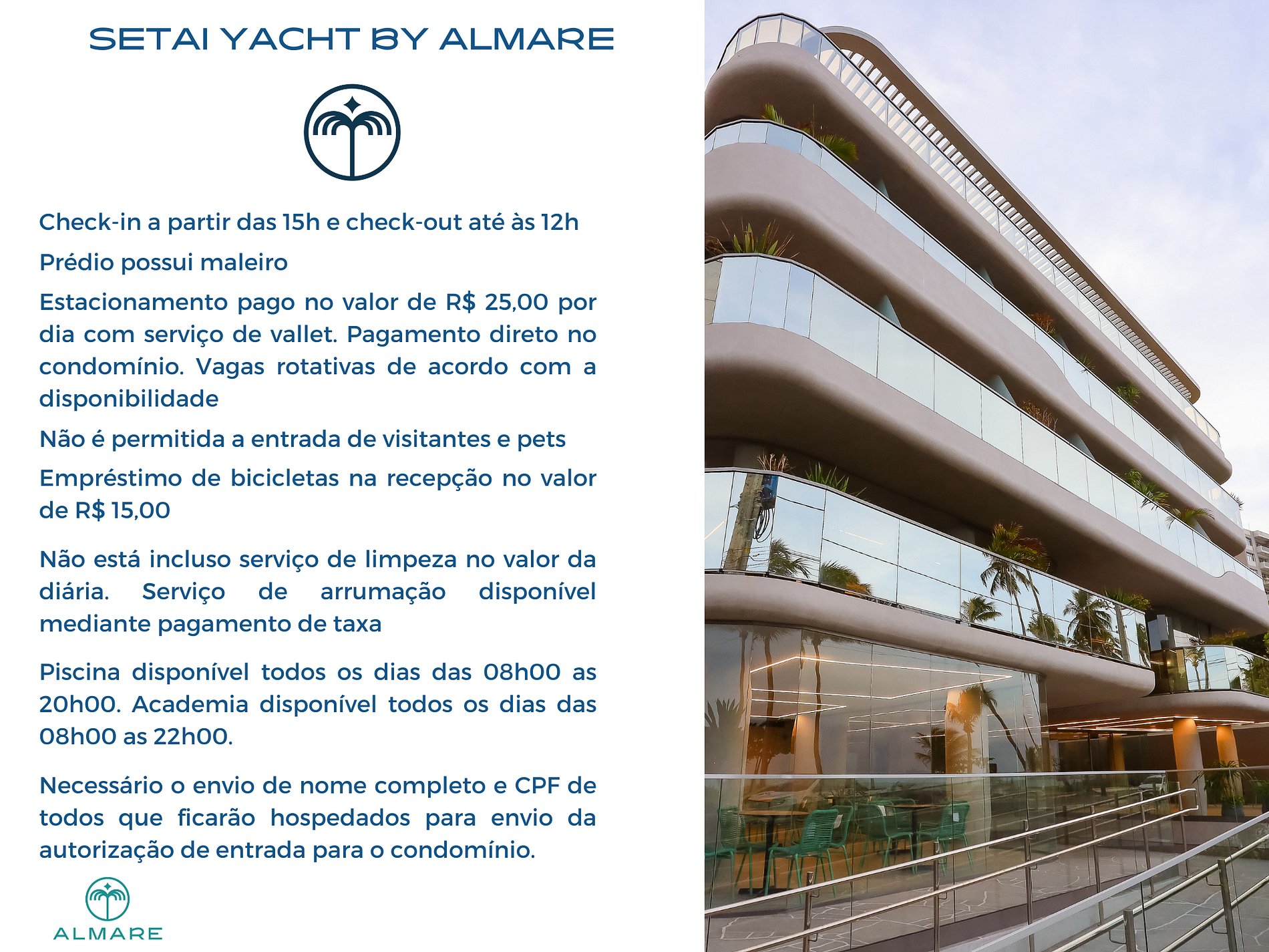 = O prédio oferece estacionamento rotativo, aluguel de bicicleta e aluguel de itens de praia como guarda-sol e cadeiras, isto, mediante pagamento de taxa.