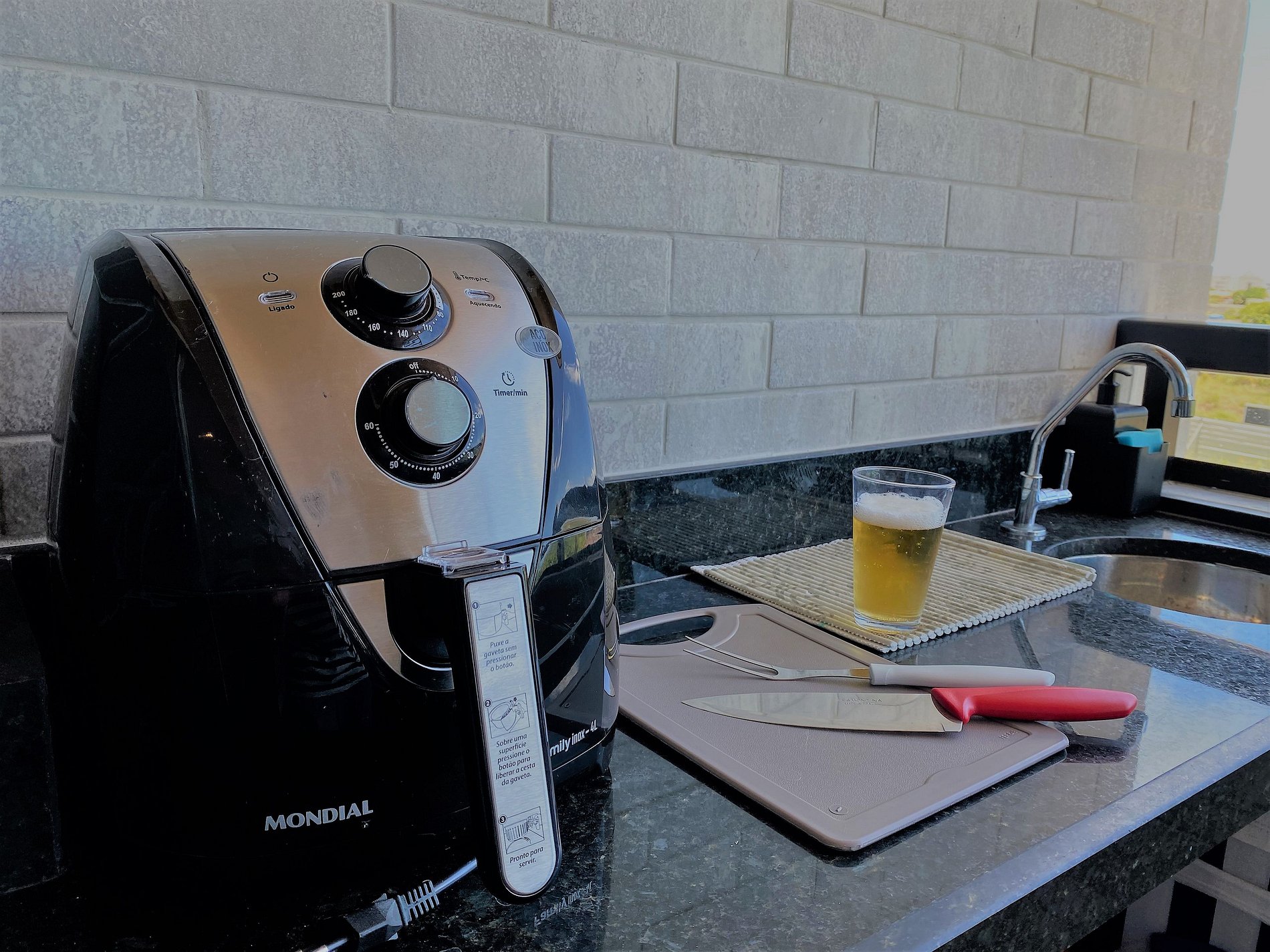 Sala com smartv, sofá e mesa de apoio integrada com a cozinha, que está equipada para hospedagem de temporada com utensílios e eletros.