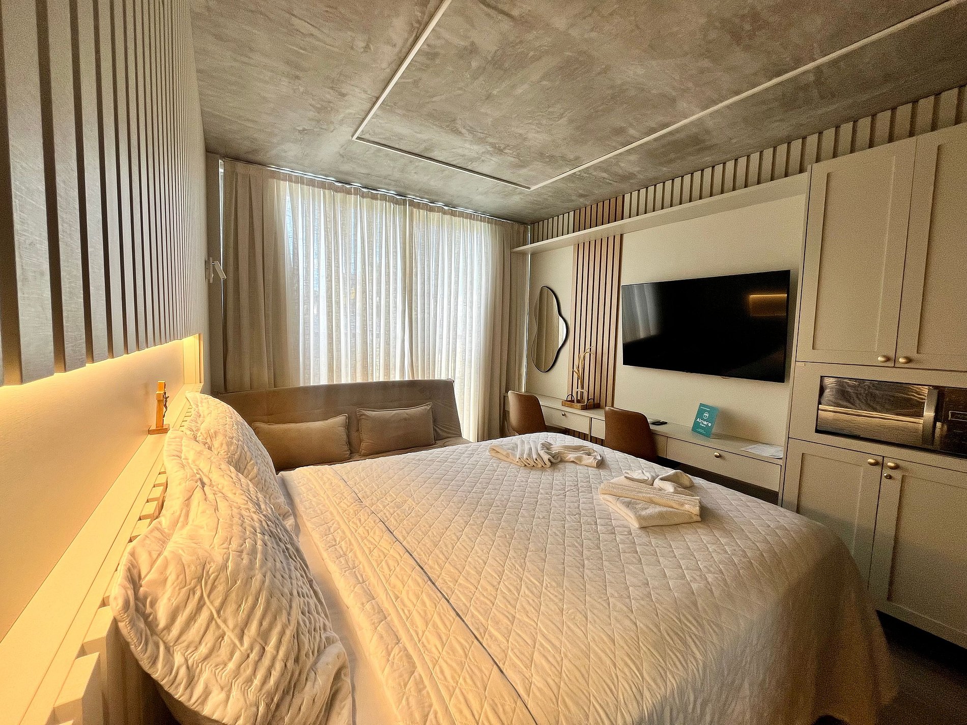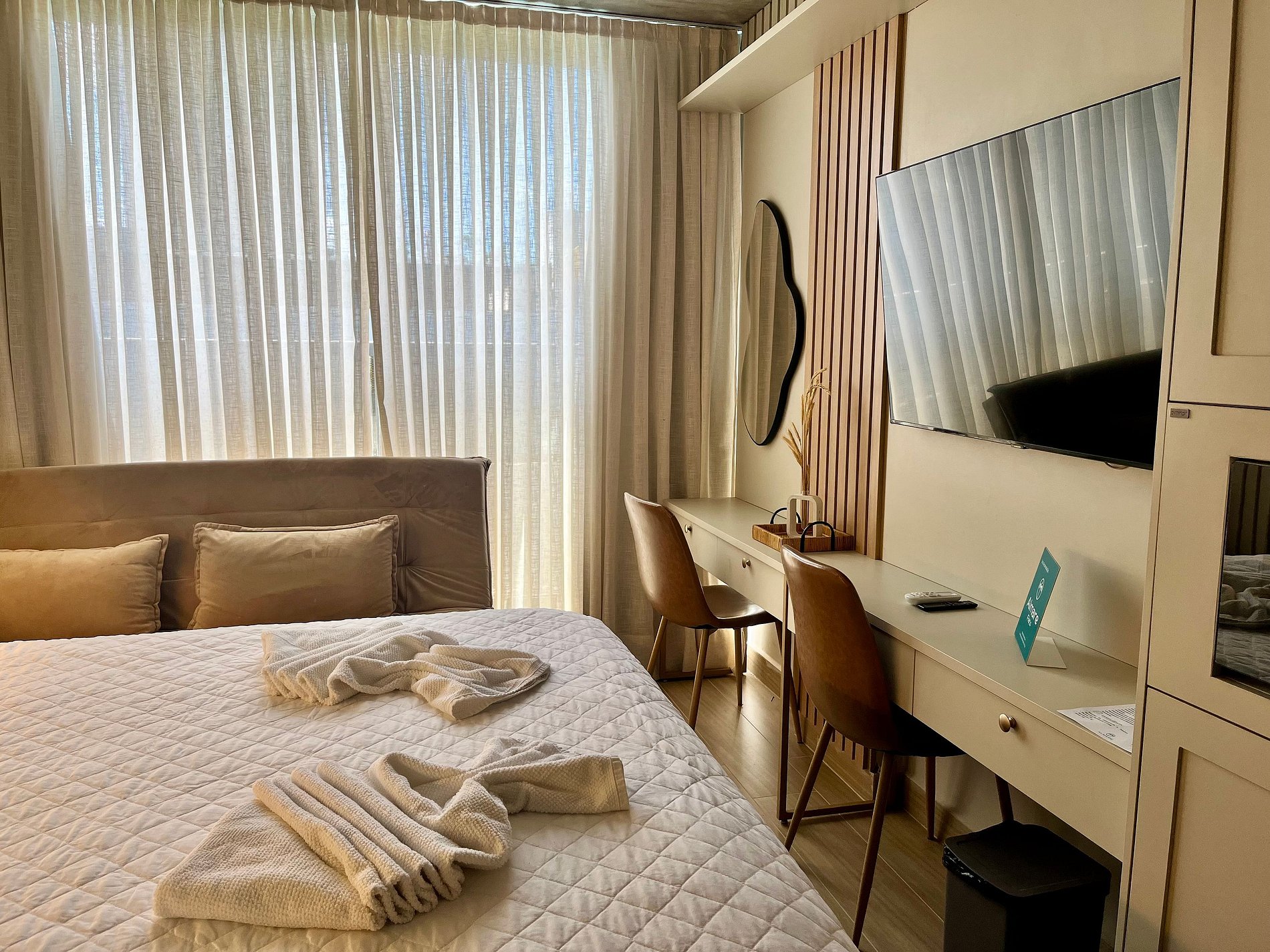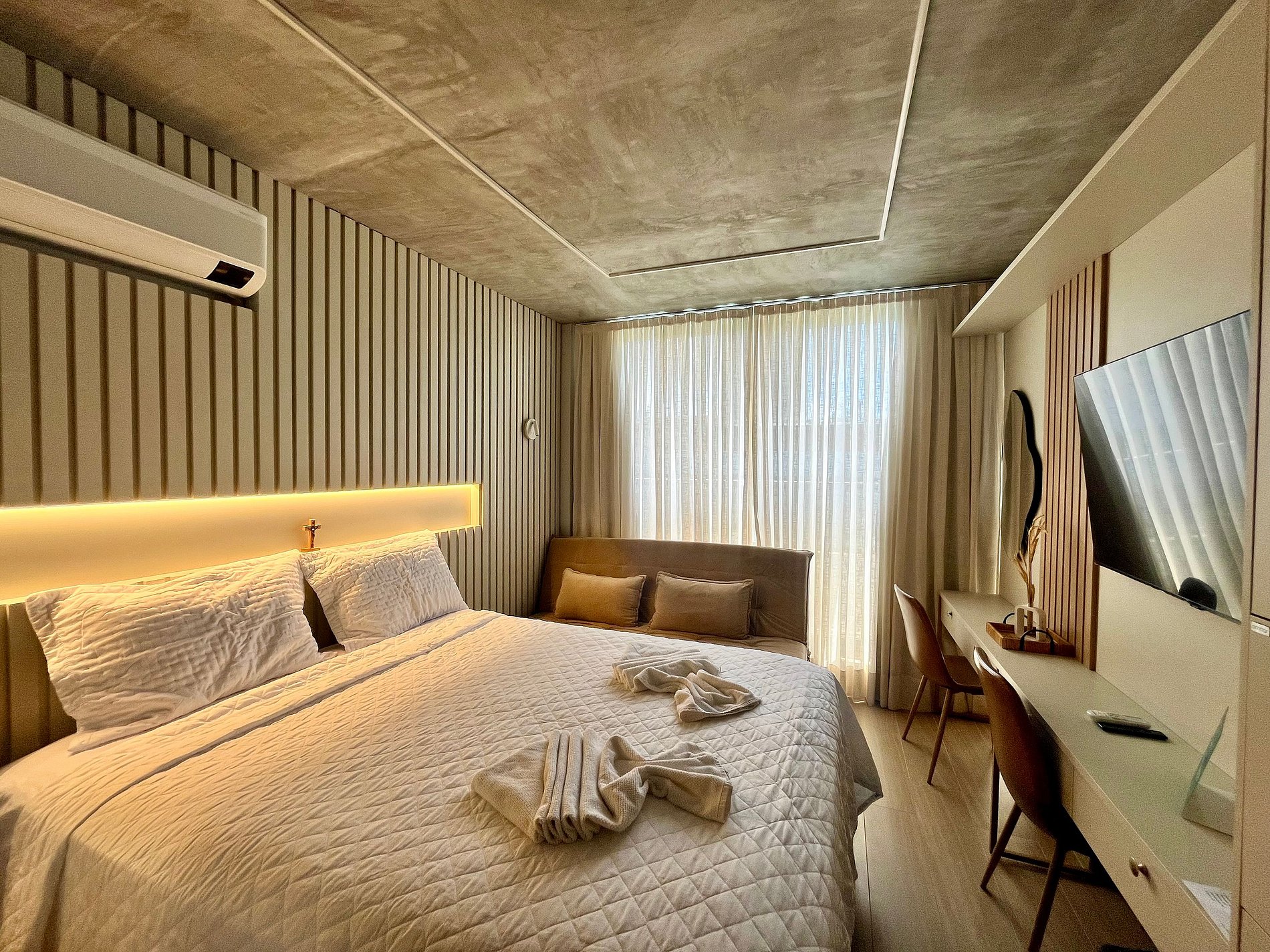 Possui um ambiente único e é composto por uma cozinha compacta para pequenas refeições e o quarto com cama e sofá-cama. Conta com smart tv e wifi gratis. São 23m² de alto padrão. Disponibilizamos enxoval de cama, com lençóis e toalhas, bem como alguns utensílios domésticos para pequenas refeições no conforto do seu próprio espaço. Como cortesia colocamos alguns amenities. O prédio conta ainda com uma lindíssima área de lazer na cobertura incluindo espaço kids, bar e piscina aquecida, ideal para apreciar a vista linda da Praia do Cabo Branco e se refrescar. Há um espaço de coworking, perfeito para quem precisa trabalhar remotamente. A academia é nova e bem equipada e fica disponível para o hóspede.