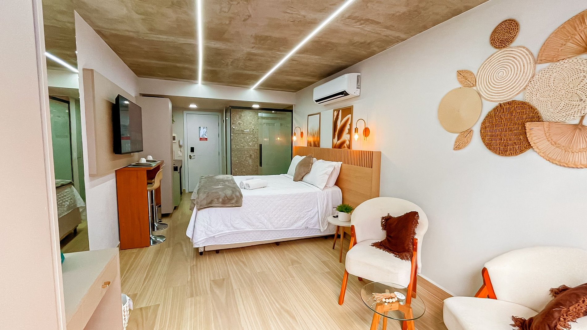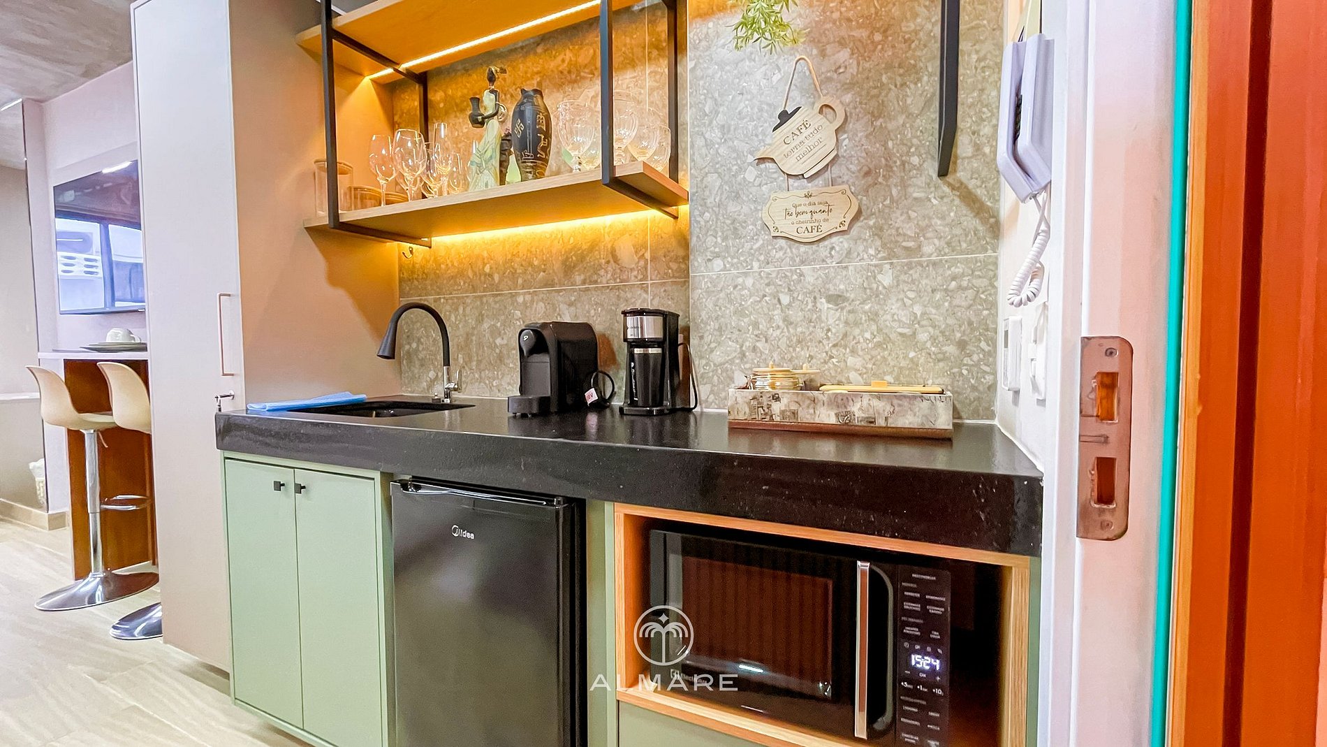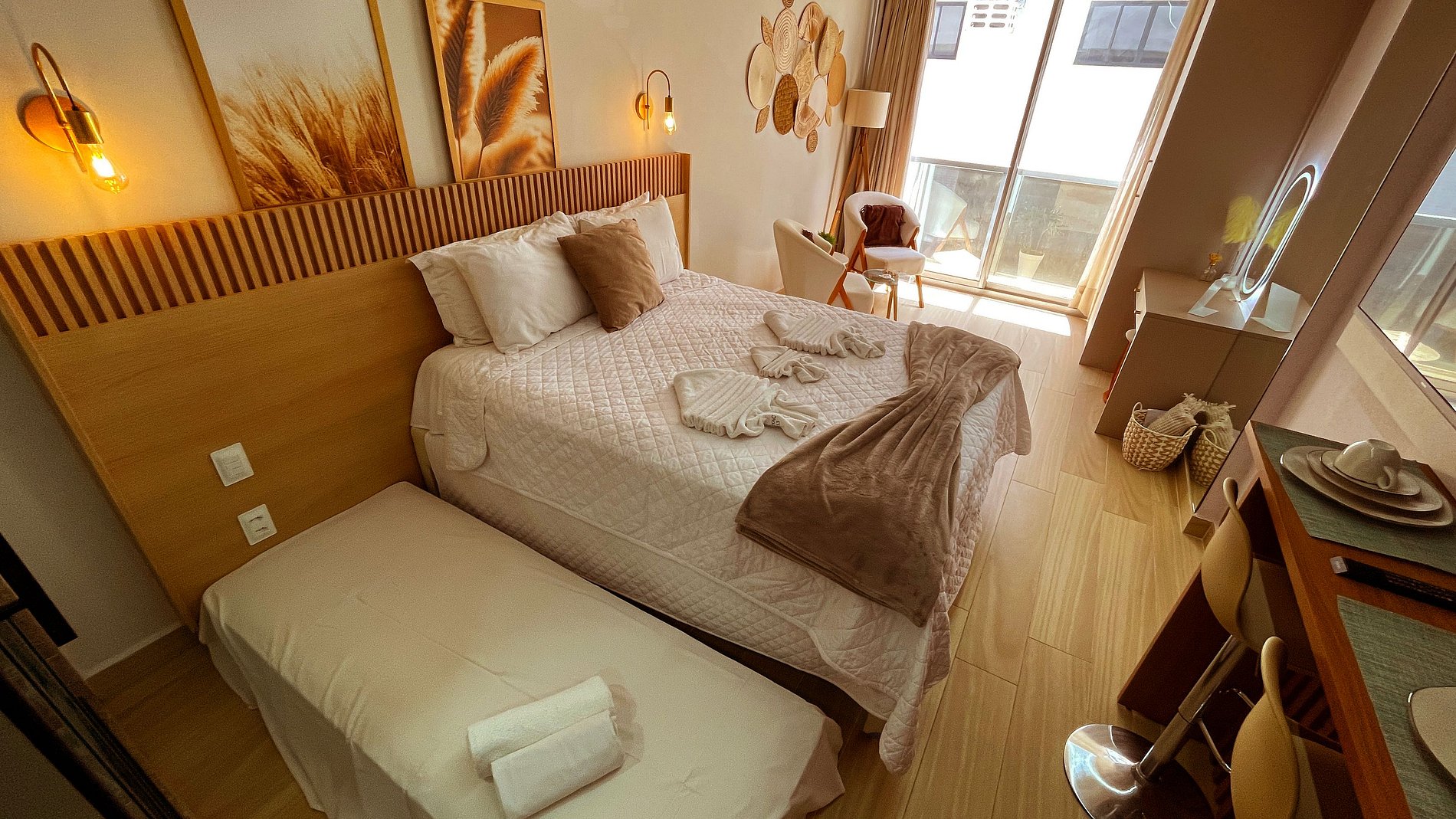 Flat com 25m² para até 4 pessoas, com cama casal e 02 auxiliares para crianças. Cozinha compacta com cafeteira, micro-ondas, frigobar, sanduicheira e utensílios. Localizado na orla da Praia de Cabo Branco, próximo a bares e restaurantes. Vista para as Piscinas Naturais do Seixas. A 2,4 km do Largo de Tambaú, 4 km do Mercado de Artesanato e 2,7 km do Farol. Condomínio com piscina aquecida, sauna, academia, coworking e estacionamento rotativo.