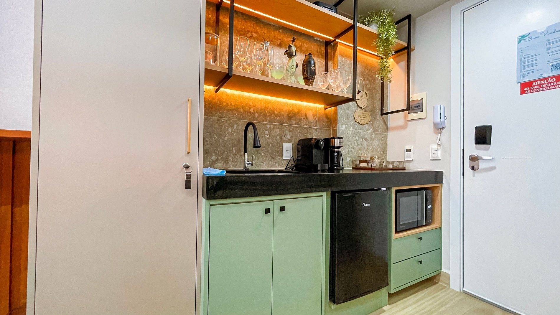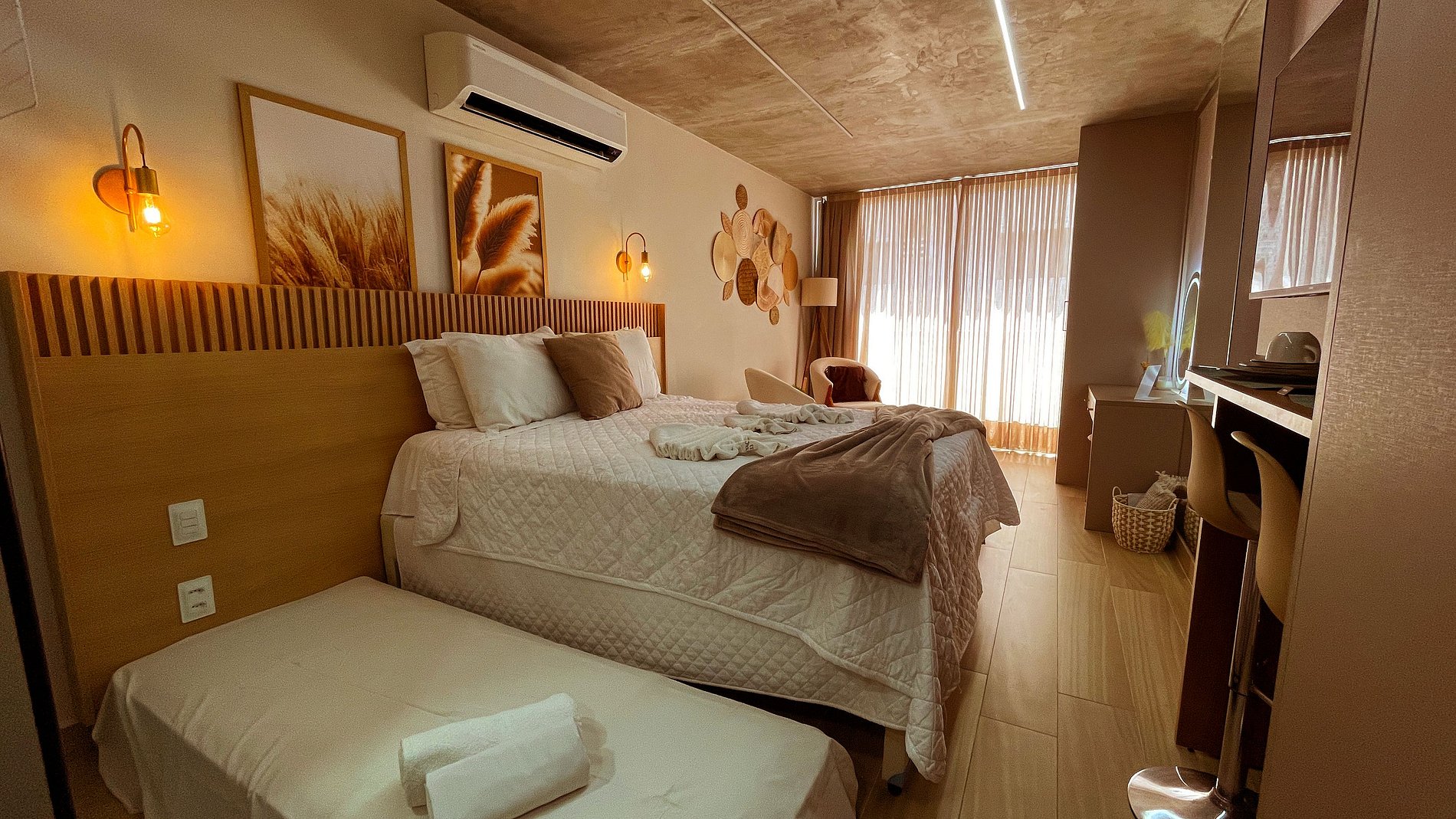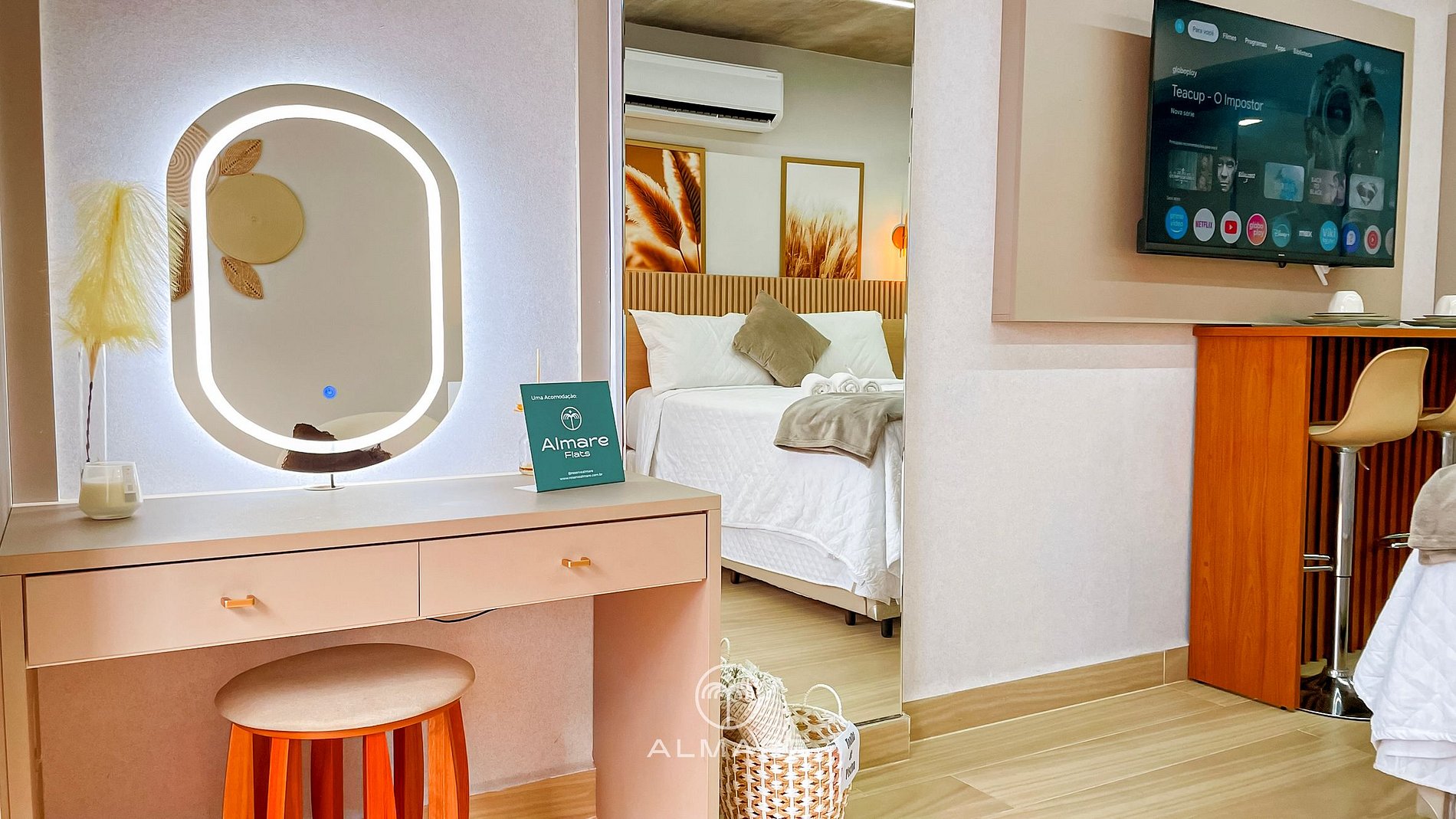 Flat com 25m² para até 4 pessoas, com cama casal e 02 auxiliares para crianças. Cozinha compacta com cafeteira, micro-ondas, frigobar, sanduicheira e utensílios. Localizado na orla da Praia de Cabo Branco, próximo a bares e restaurantes. Vista para as Piscinas Naturais do Seixas. A 2,4 km do Largo de Tambaú, 4 km do Mercado de Artesanato e 2,7 km do Farol. Condomínio com piscina aquecida, sauna, academia, coworking e estacionamento rotativo.