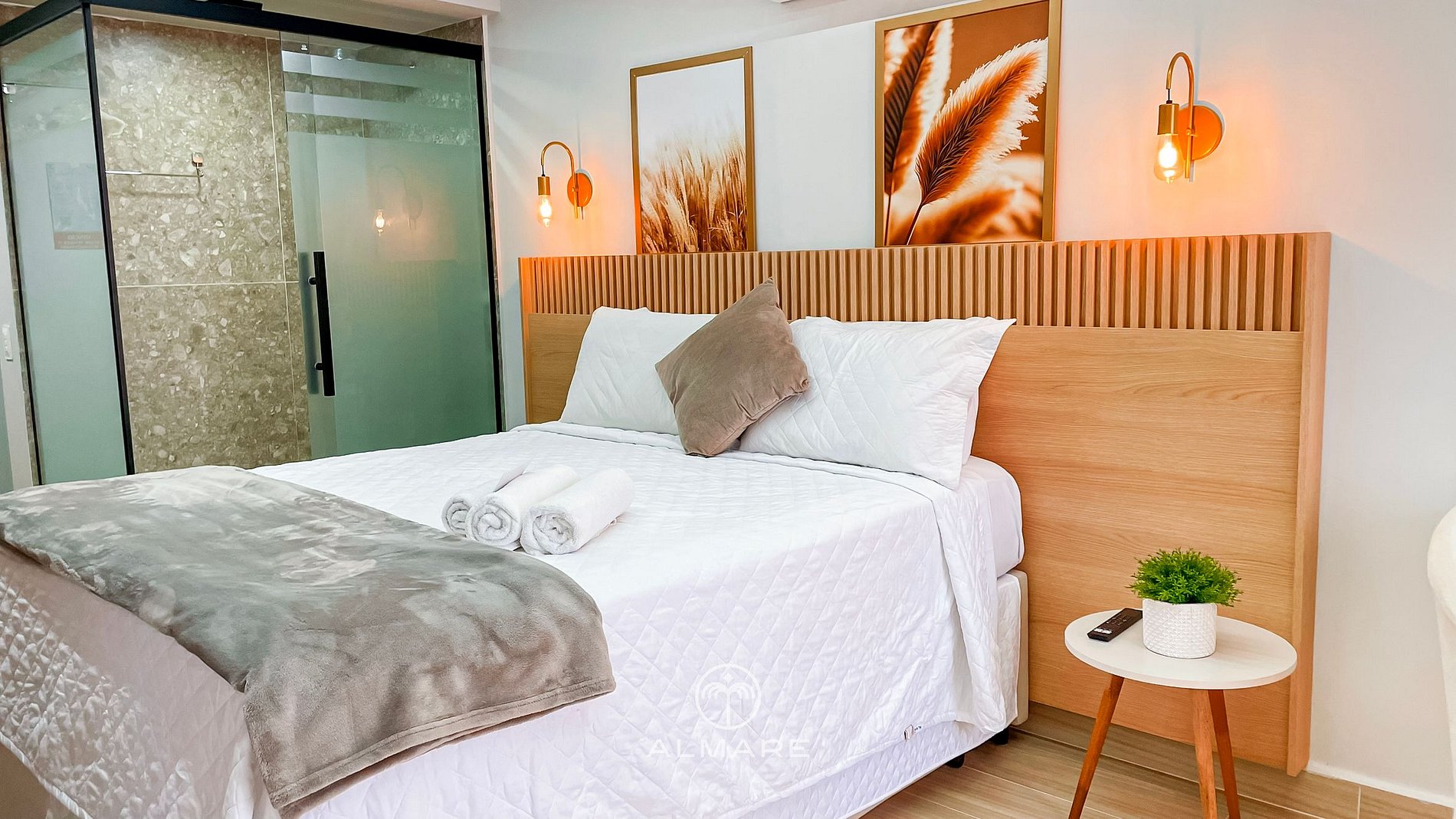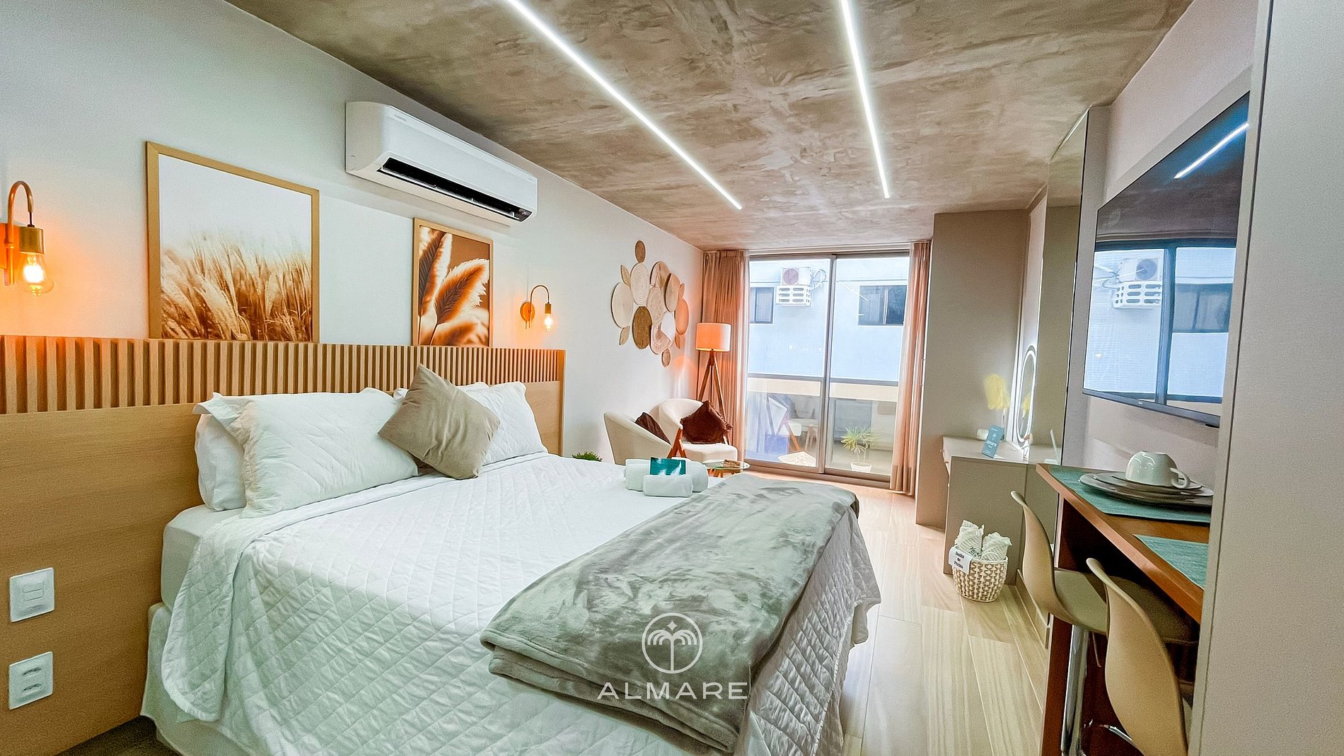Este lindo flat possui um ambiente único e é composto por uma cozinha compacta para pequenas refeições e o quarto com cama e sofá-cama. Conta com smart tv e wifi gratis. São 25m² de alto padrão. Disponibilizamos enxoval de cama, com lençóis e toalhas, bem como alguns utensílios domésticos para pequenas refeições no conforto do seu próprio espaço. Como cortesia colocamos alguns amenities. O prédio conta ainda com uma lindíssima área de lazer na cobertura incluindo espaço kids, bar e piscina aquecida, ideal para apreciar a vista linda da Praia do Cabo Branco e se refrescar. Há um espaço de coworking, perfeito para quem precisa trabalhar remotamente. A academia é nova e bem equipada e fica disponível para o hóspede.