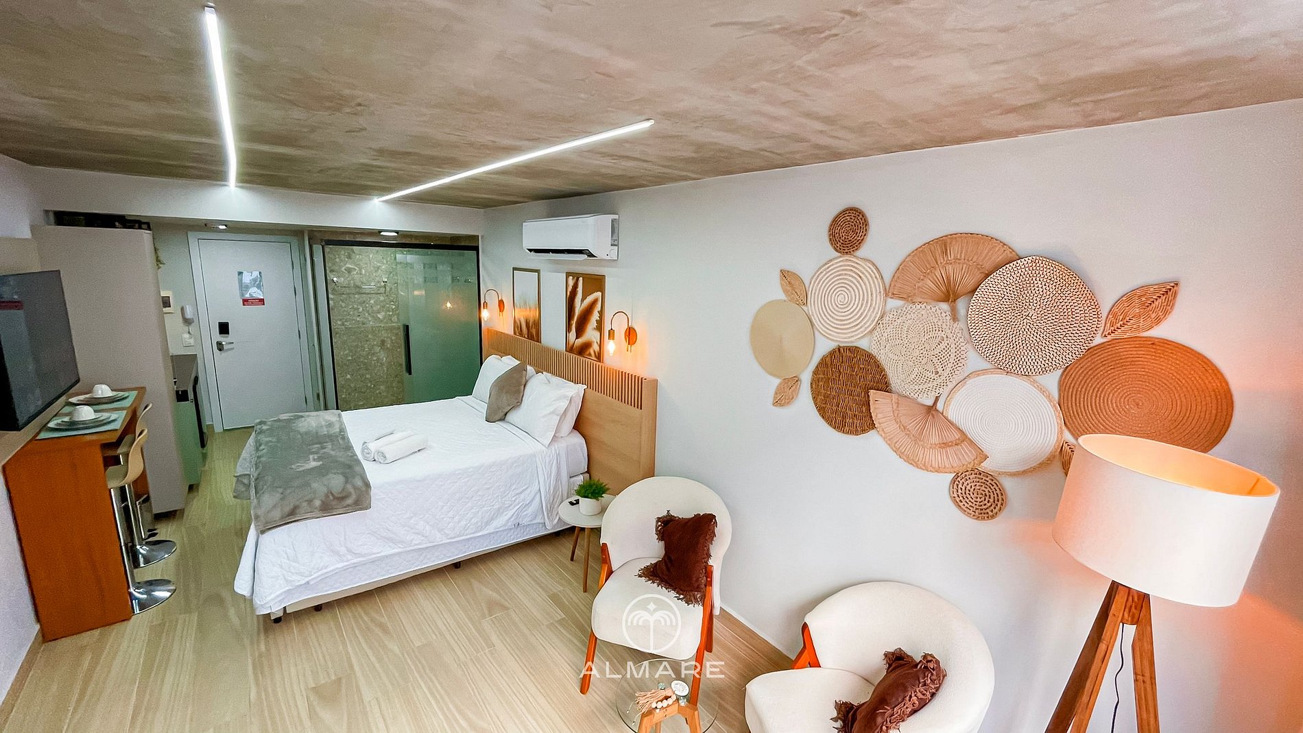 Flat com 25m² para até 4 pessoas, com cama casal e 02 auxiliares para crianças. Cozinha compacta com cafeteira, micro-ondas, frigobar, sanduicheira e utensílios. Localizado na orla da Praia de Cabo Branco, próximo a bares e restaurantes. Vista para as Piscinas Naturais do Seixas. A 2,4 km do Largo de Tambaú, 4 km do Mercado de Artesanato e 2,7 km do Farol. Condomínio com piscina aquecida, sauna, academia, coworking e estacionamento rotativo.