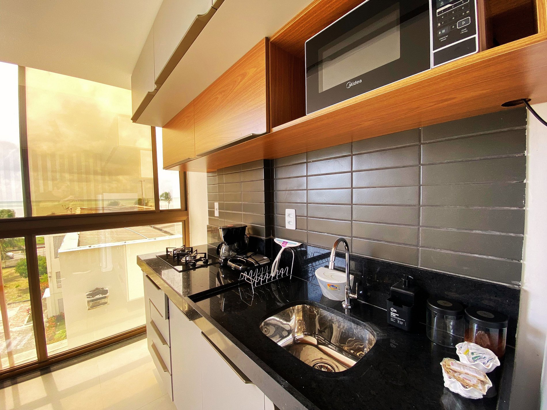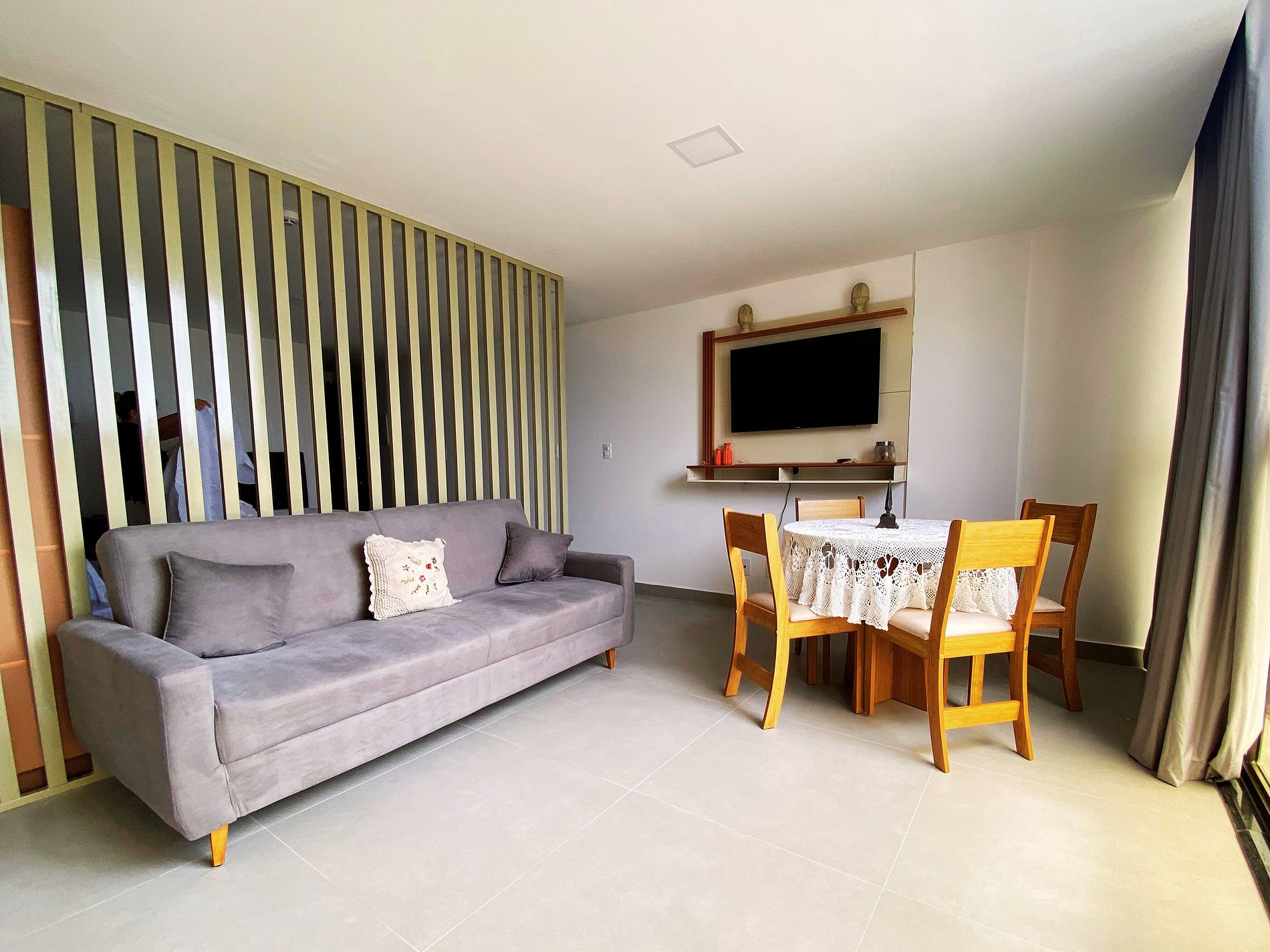 Este flat é confortável e espaçoso, um ambiente único, composto por uma cozinha compacta para pequenas refeições, duas camas casal queen e 01 sofá-cama. São 43m² bem decorados e super charmoso e com uma vista para o mar deslumbrante.