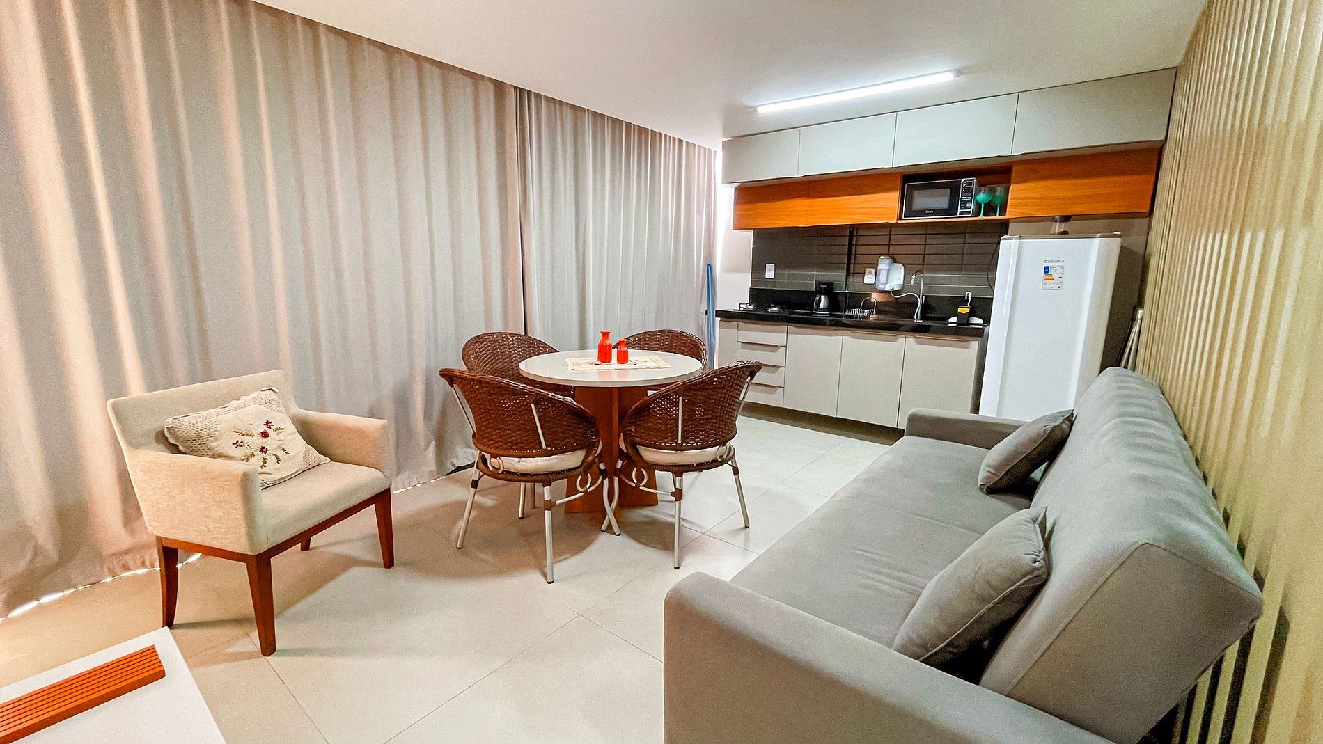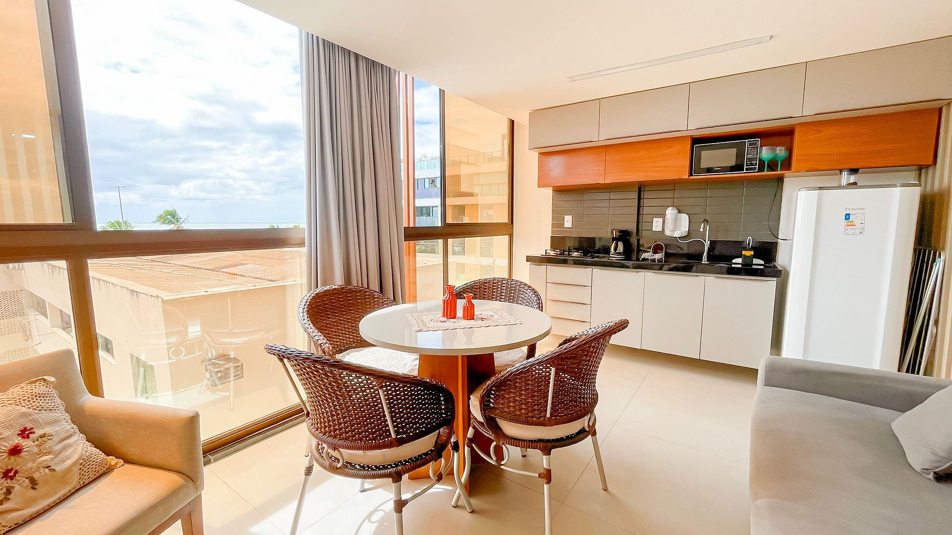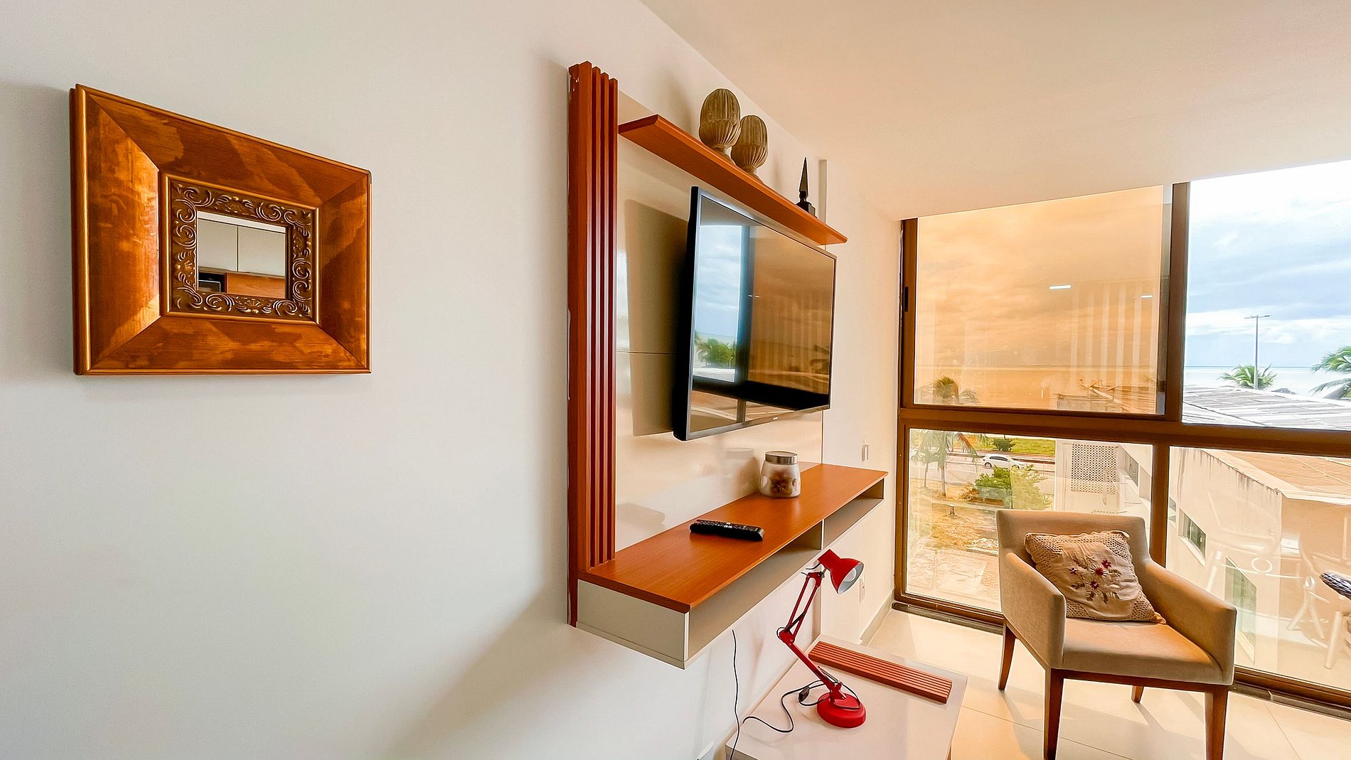 Com 43m² e vista para o mar, acomoda até 5 pessoas em 02 camas de casal e um sofá-cama. A cozinha compacta dispõe de cafeteira, sanduicheira, microondas, geladeira, fogão e alguns utensílios para pequenas refeições. O ambiente conta com mesa para refeiçoes ou lanches, smart TV e wifi gratuita. A 70m da orla, próximo ao Largo de Tambaú, Mercado de Artesanato, Piscinas Naturais do Seixas, Farol do Cabo Branco e praias do litoral sul. O prédio tem piscina, estacionamento e lavanderia.